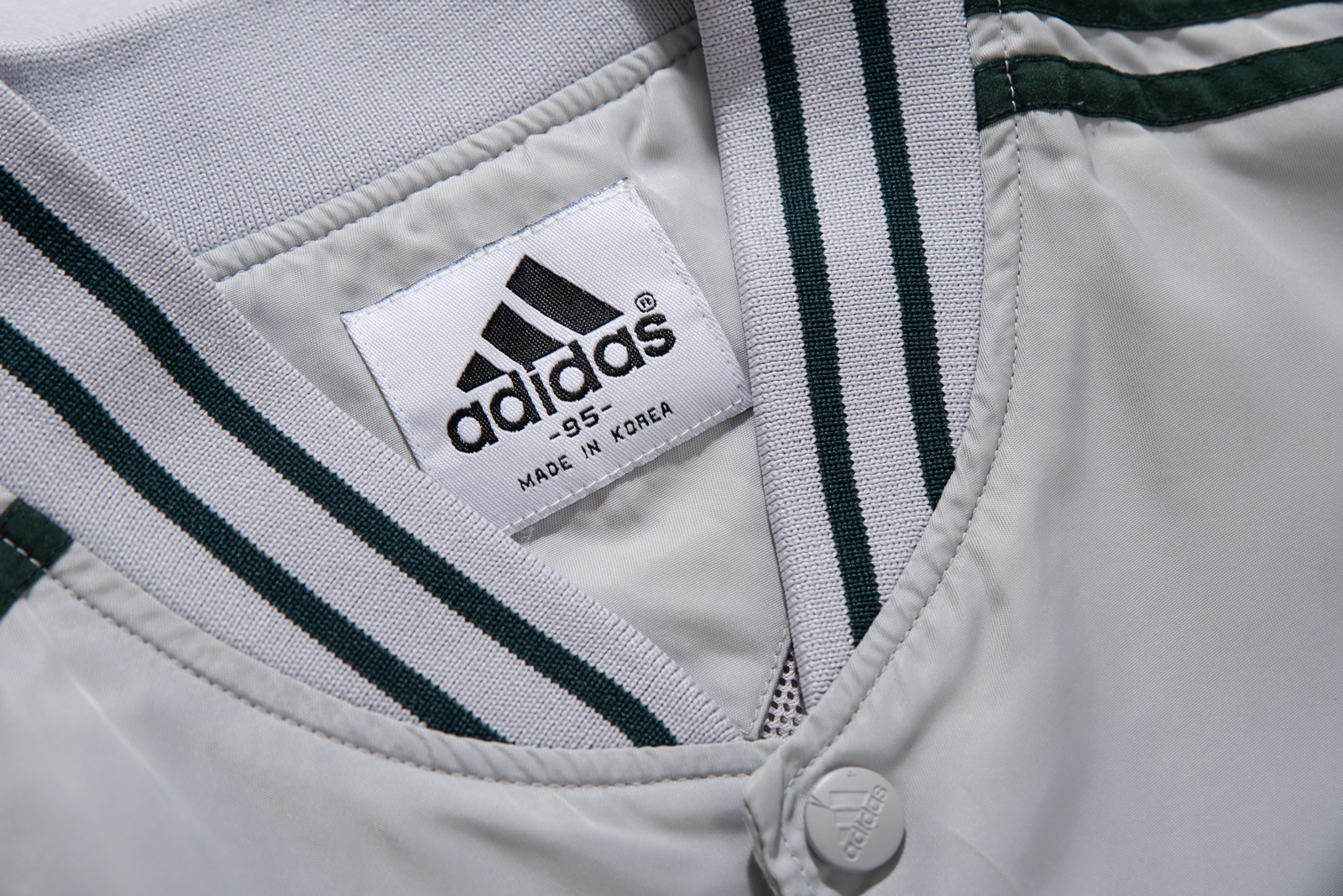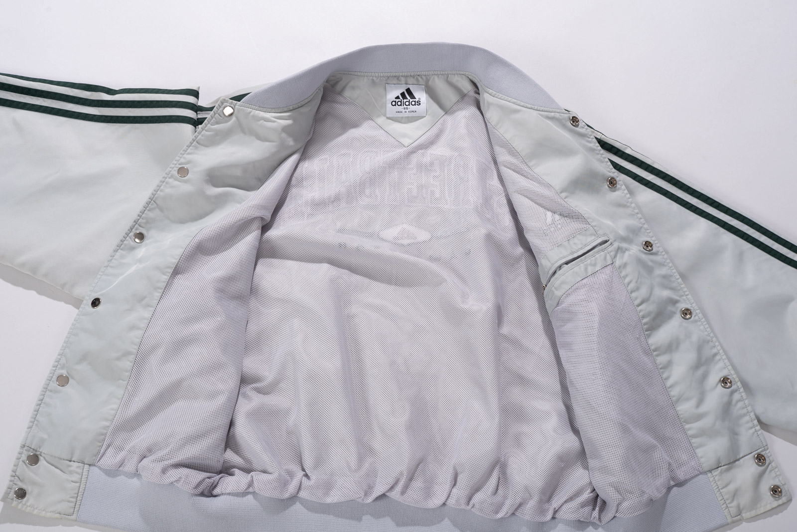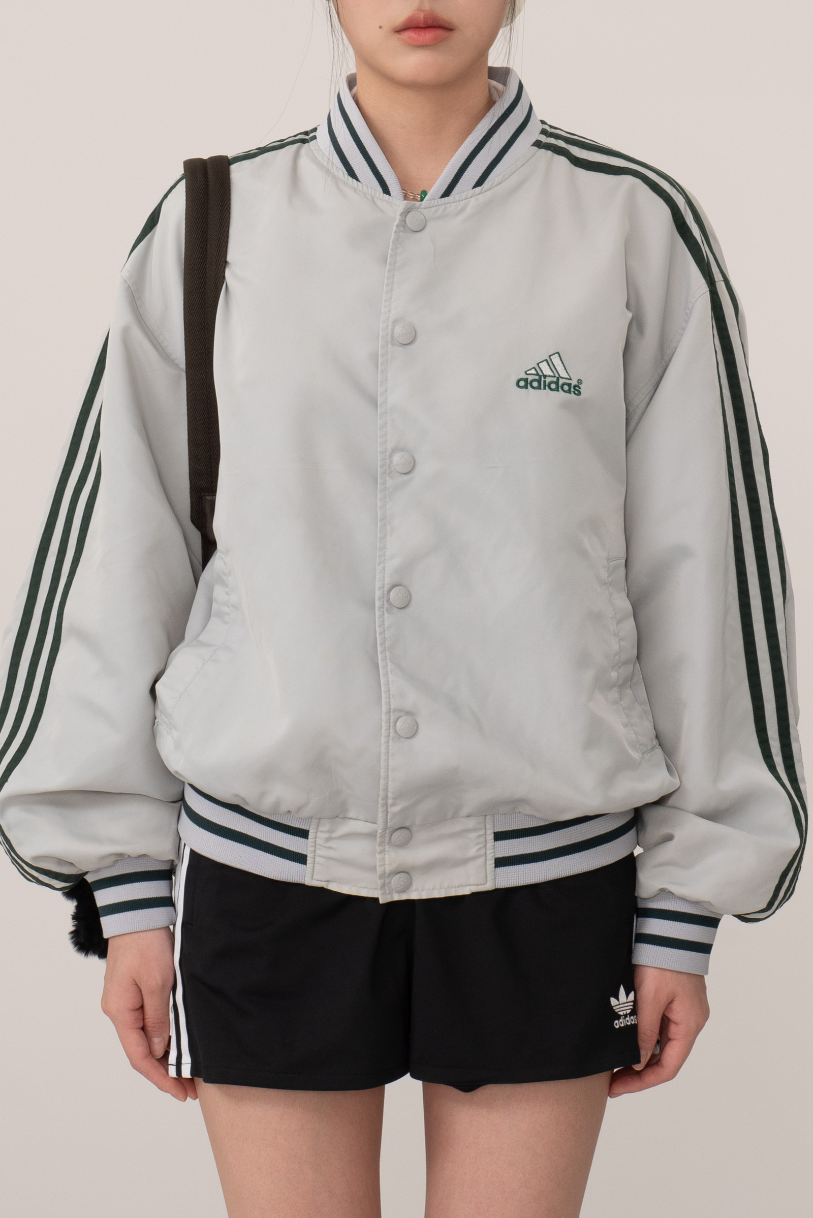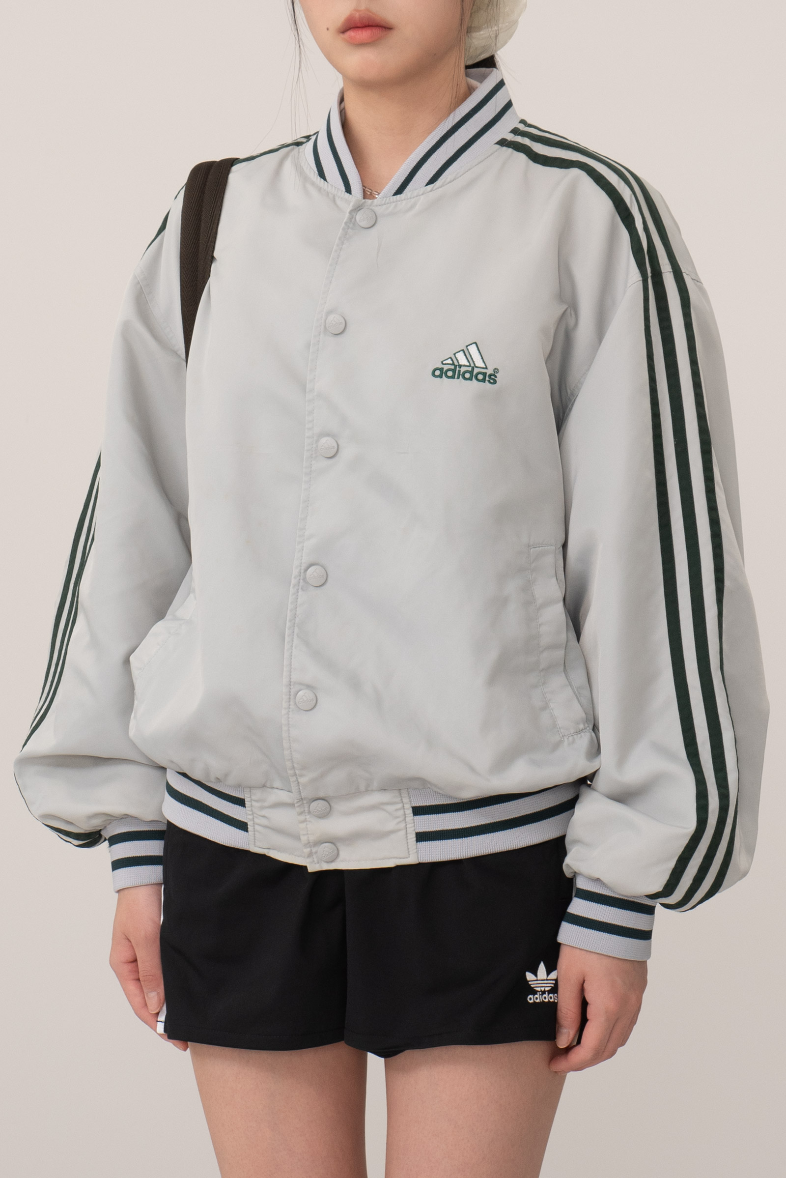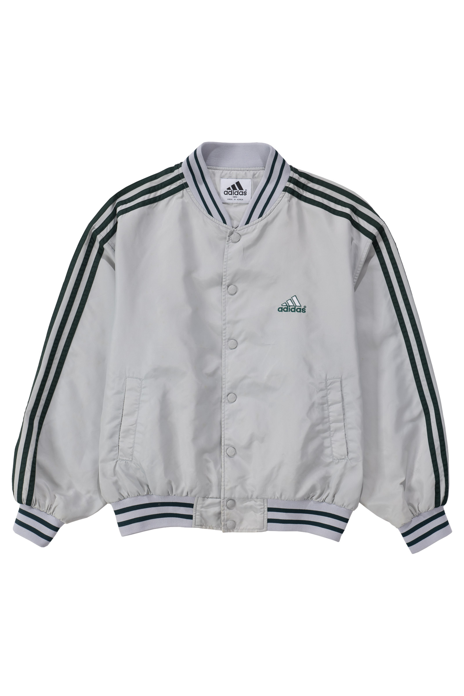스냅 버튼 여밈 방식이고, 어깨부터 소매 끝까지 떨어지는 아디다스의 심볼 삼선 디테일, 그리고 탄탄한 립 디테일이 전형적인 올드 아디다스 스타디움 재킷 스타일을 보여주네요.