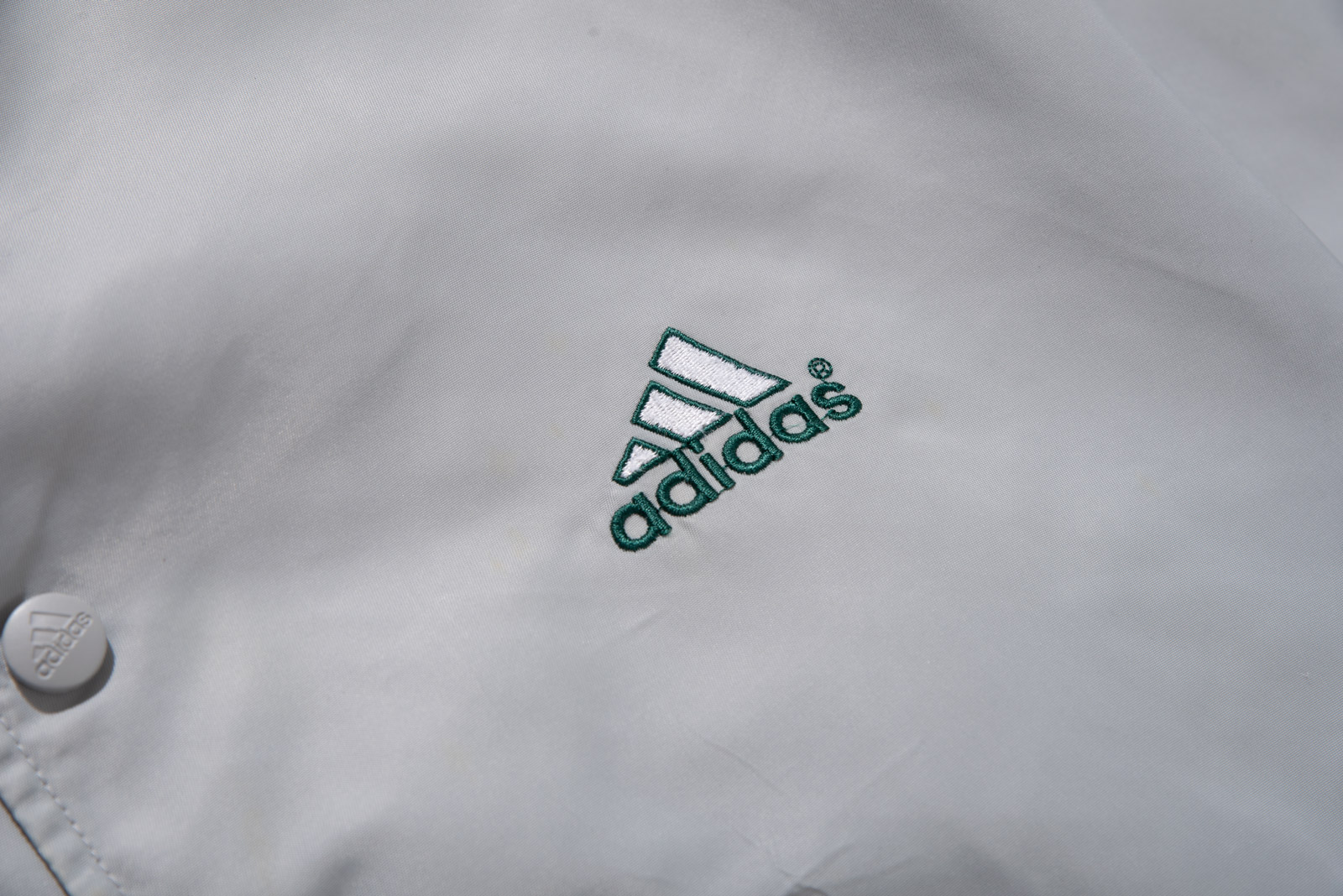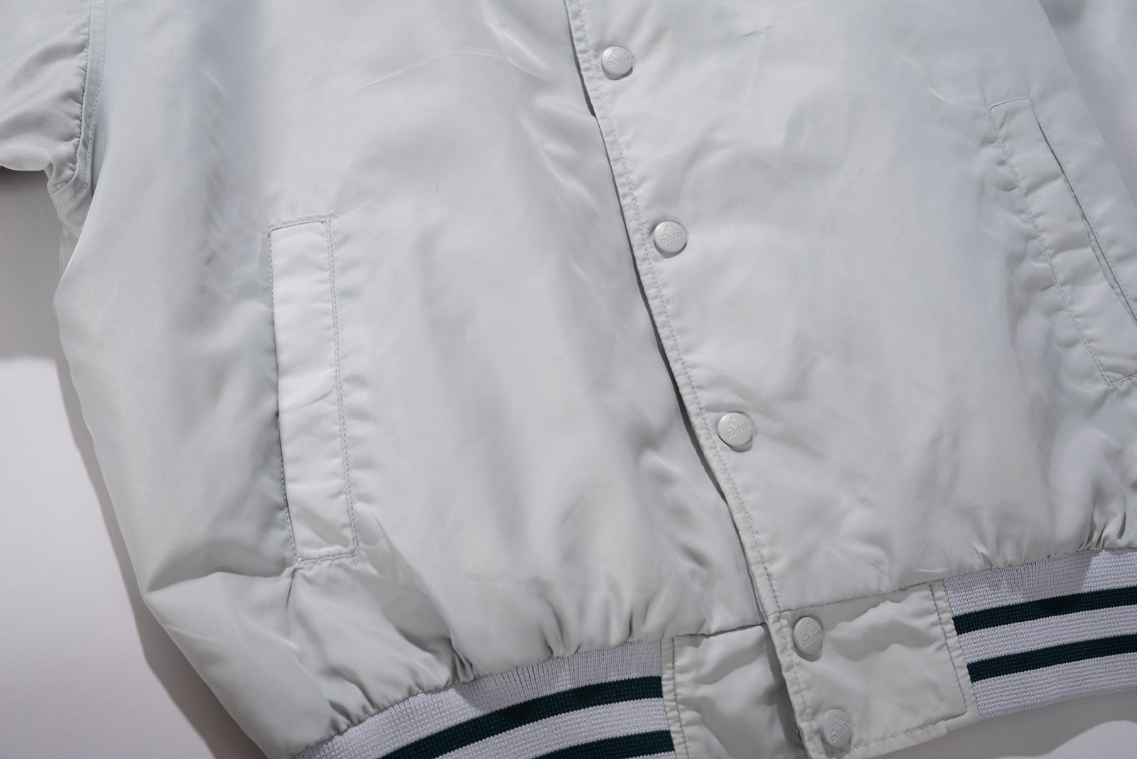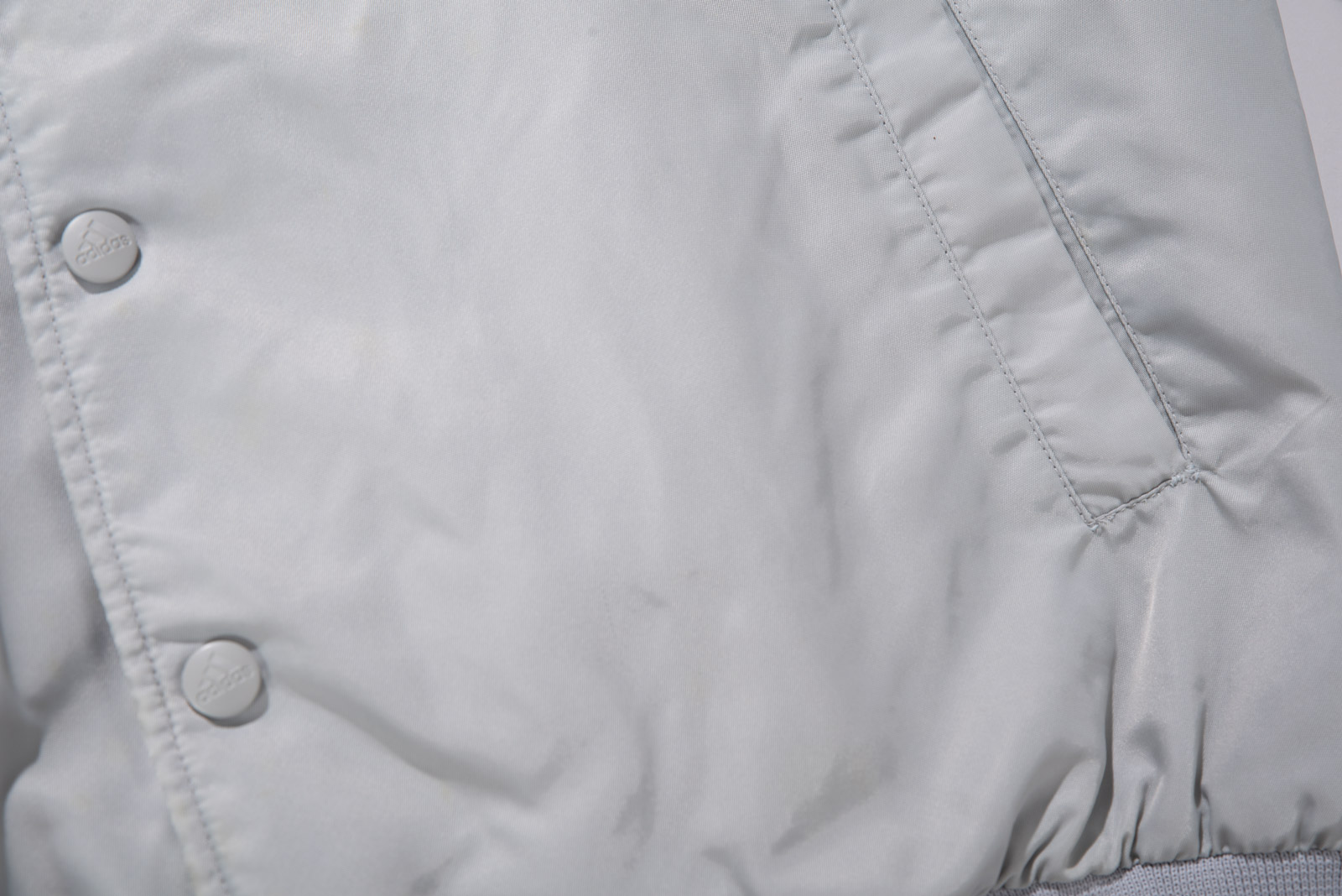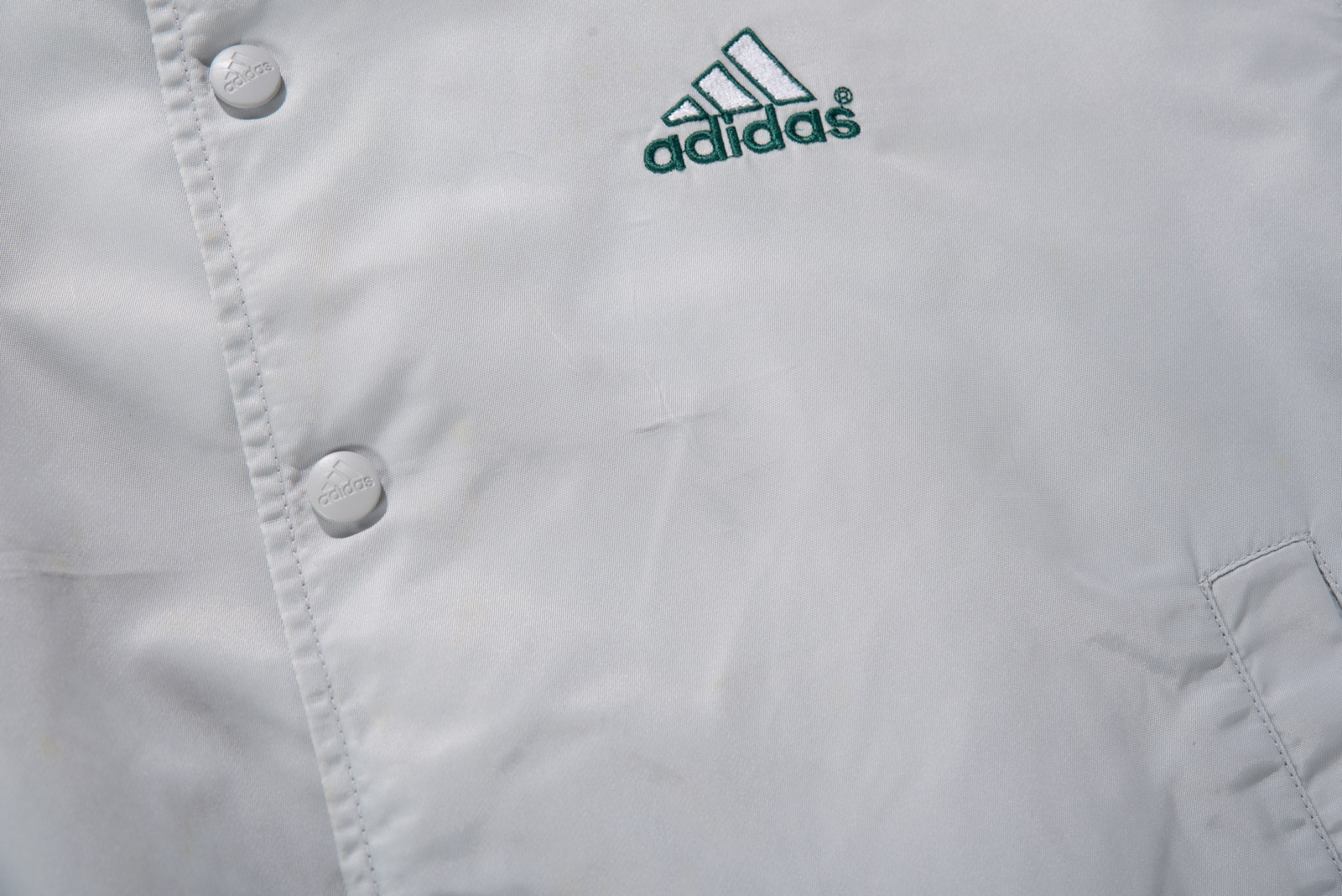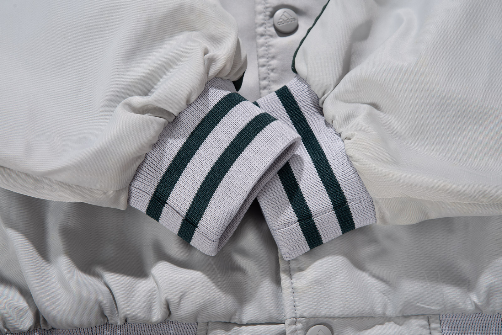 스냅 버튼 여밈 방식이고, 어깨부터 소매 끝까지 떨어지는 아디다스의 심볼 삼선 디테일, 그리고 탄탄한 립 디테일이 전형적인 올드 아디다스 스타디움 재킷 스타일을 보여주네요.