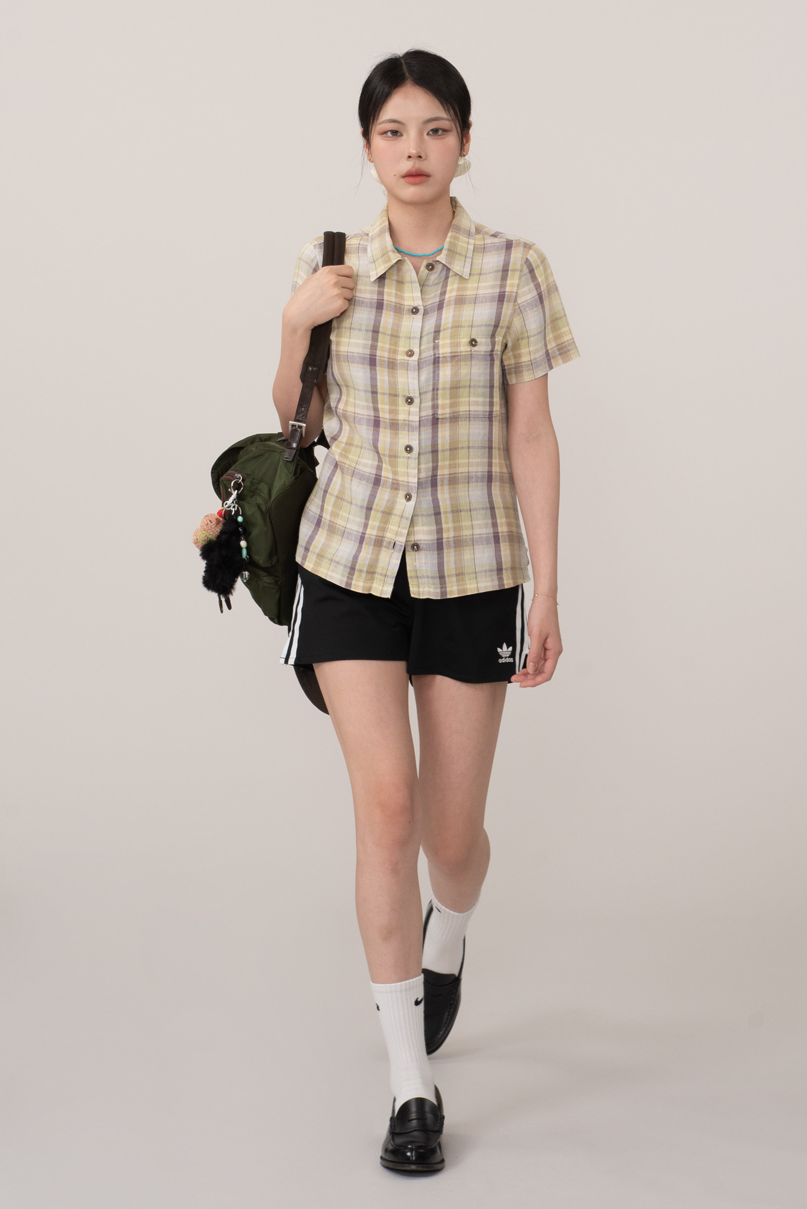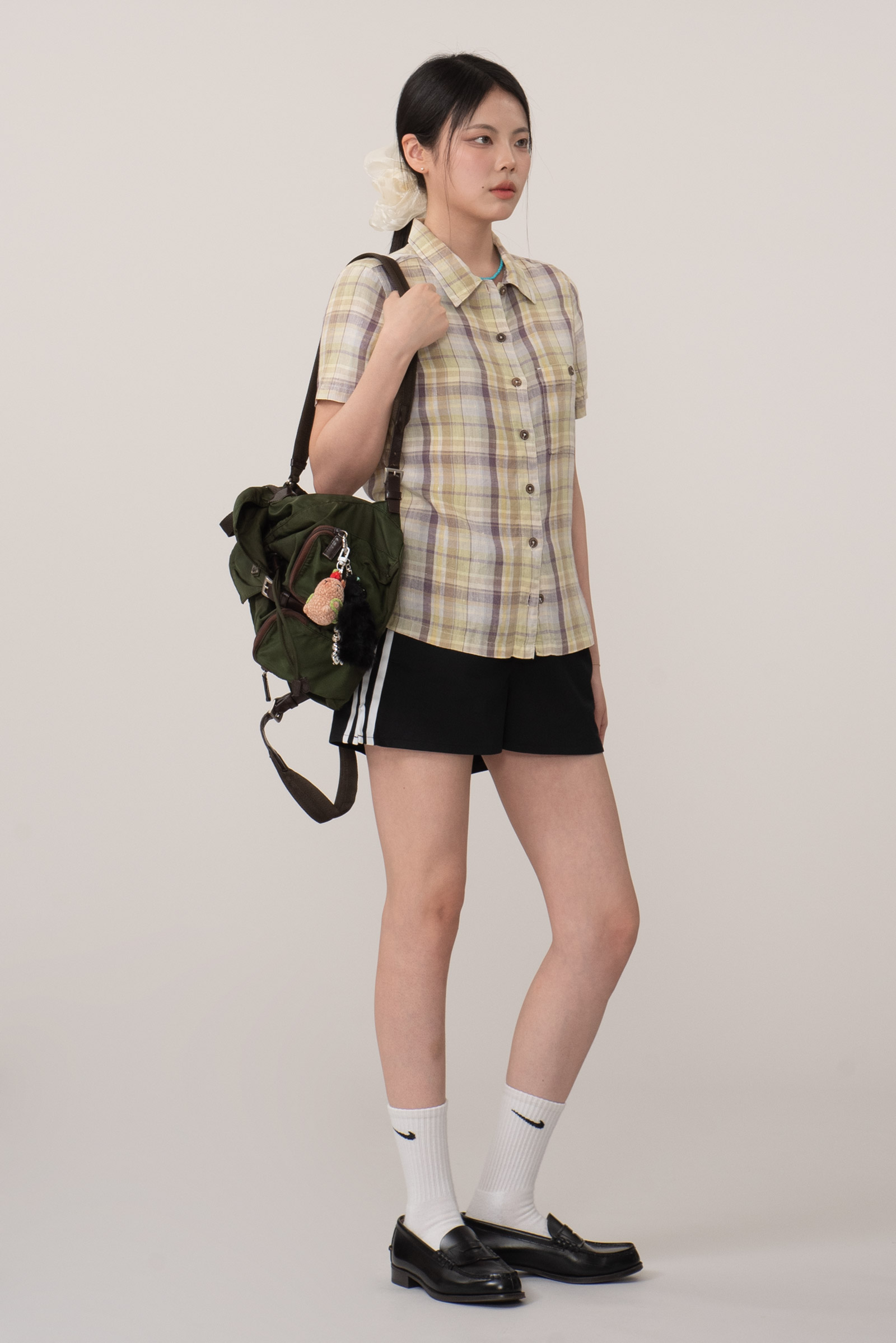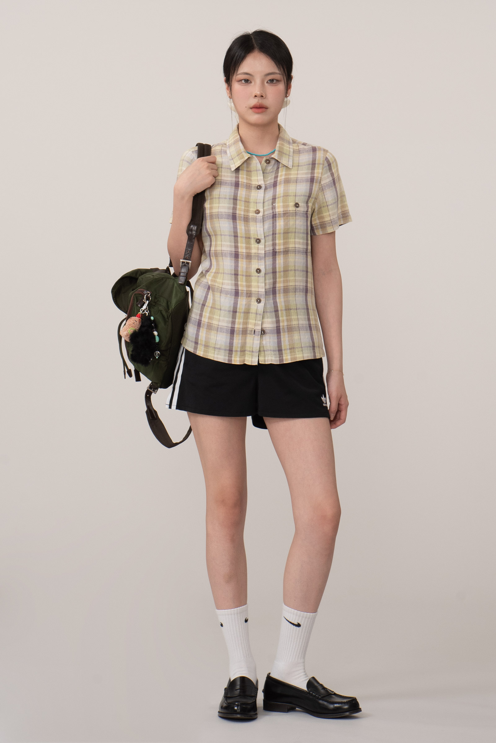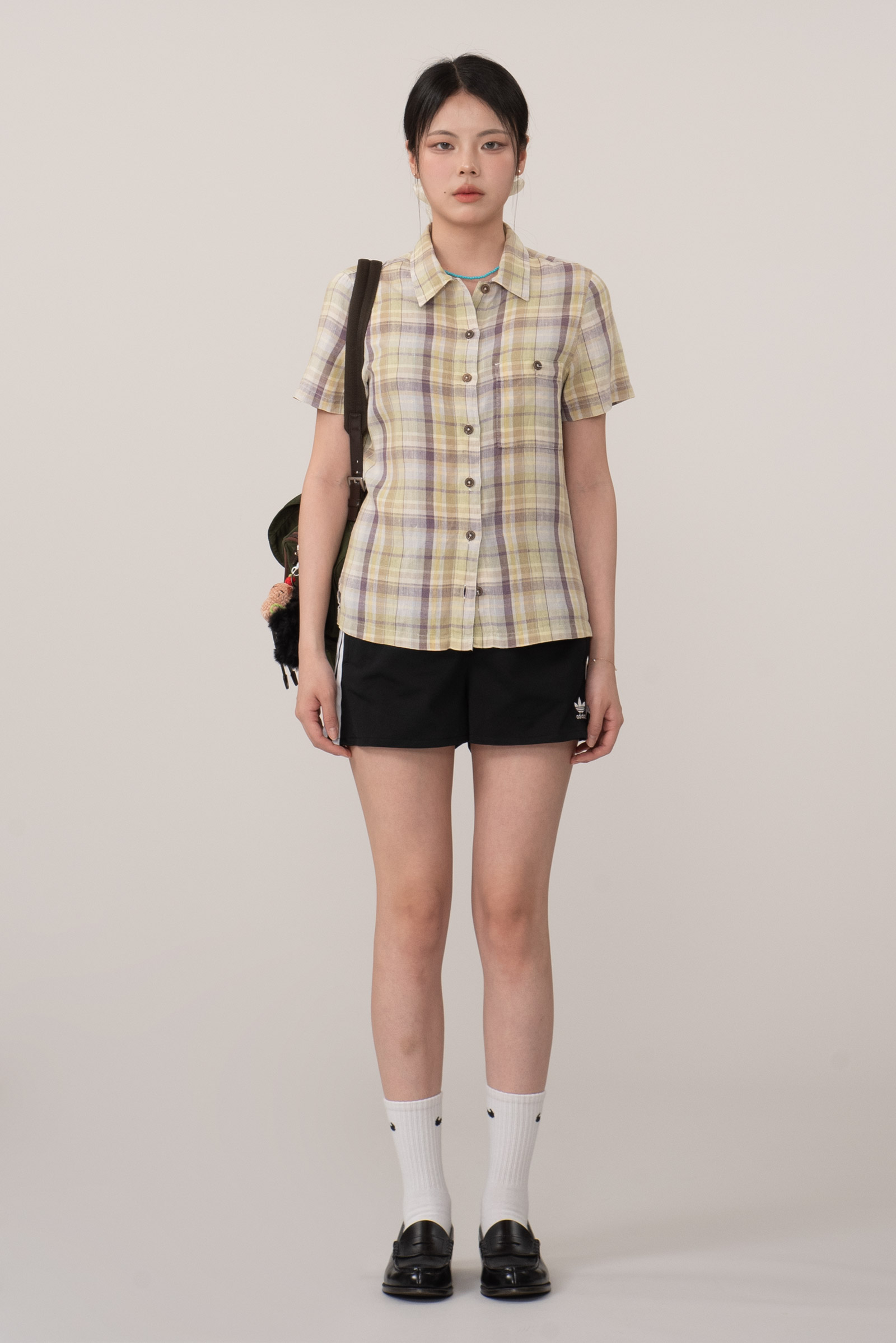 클래식한 버튼업 디자인에 작고 동그란 우드풍 버튼을 사용해 내추럴한 무드를 더했으며, 가슴 포켓의 단추 디테일로 실용성과 완성도를 높였답니다.