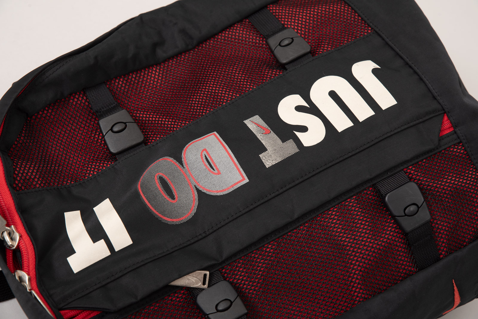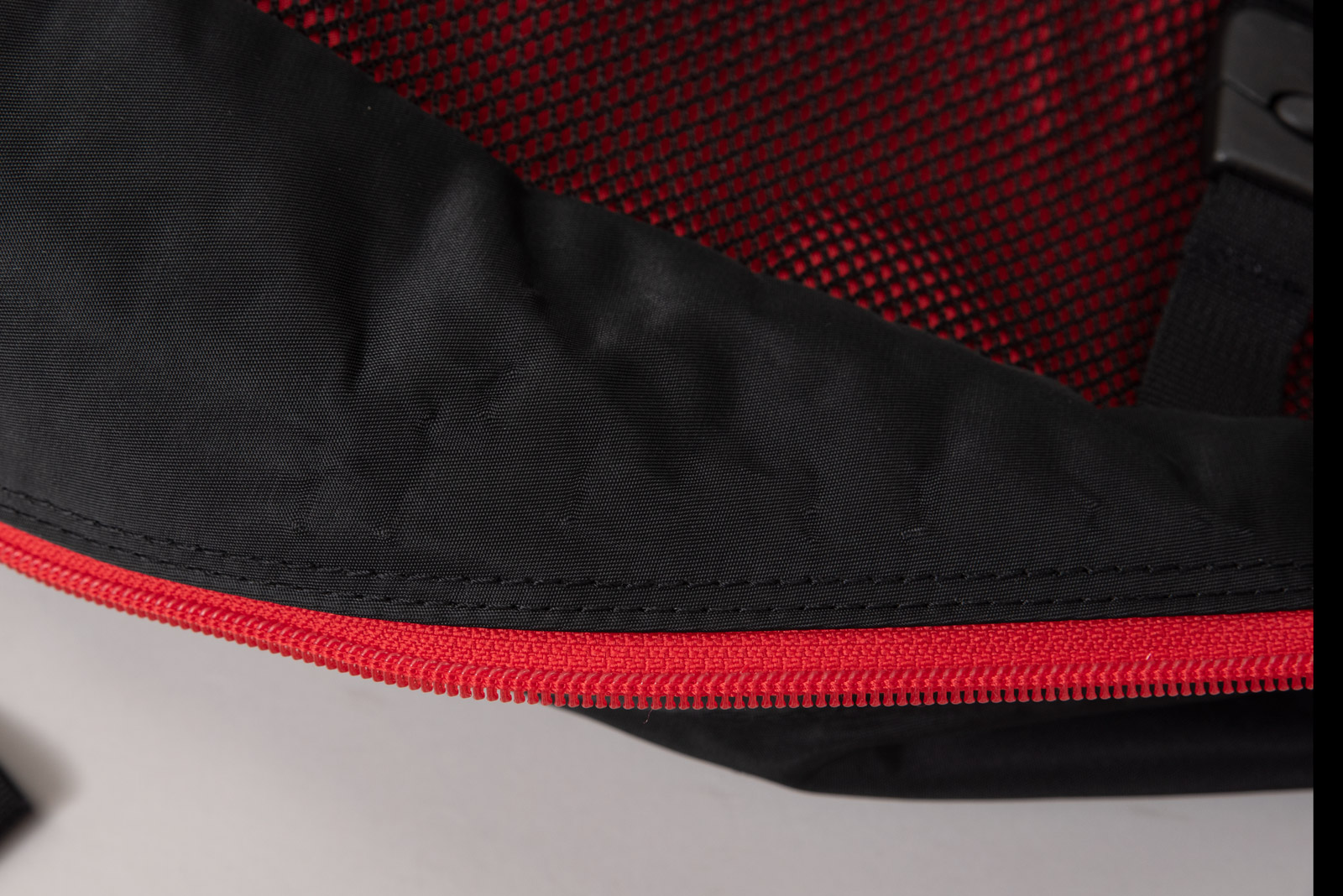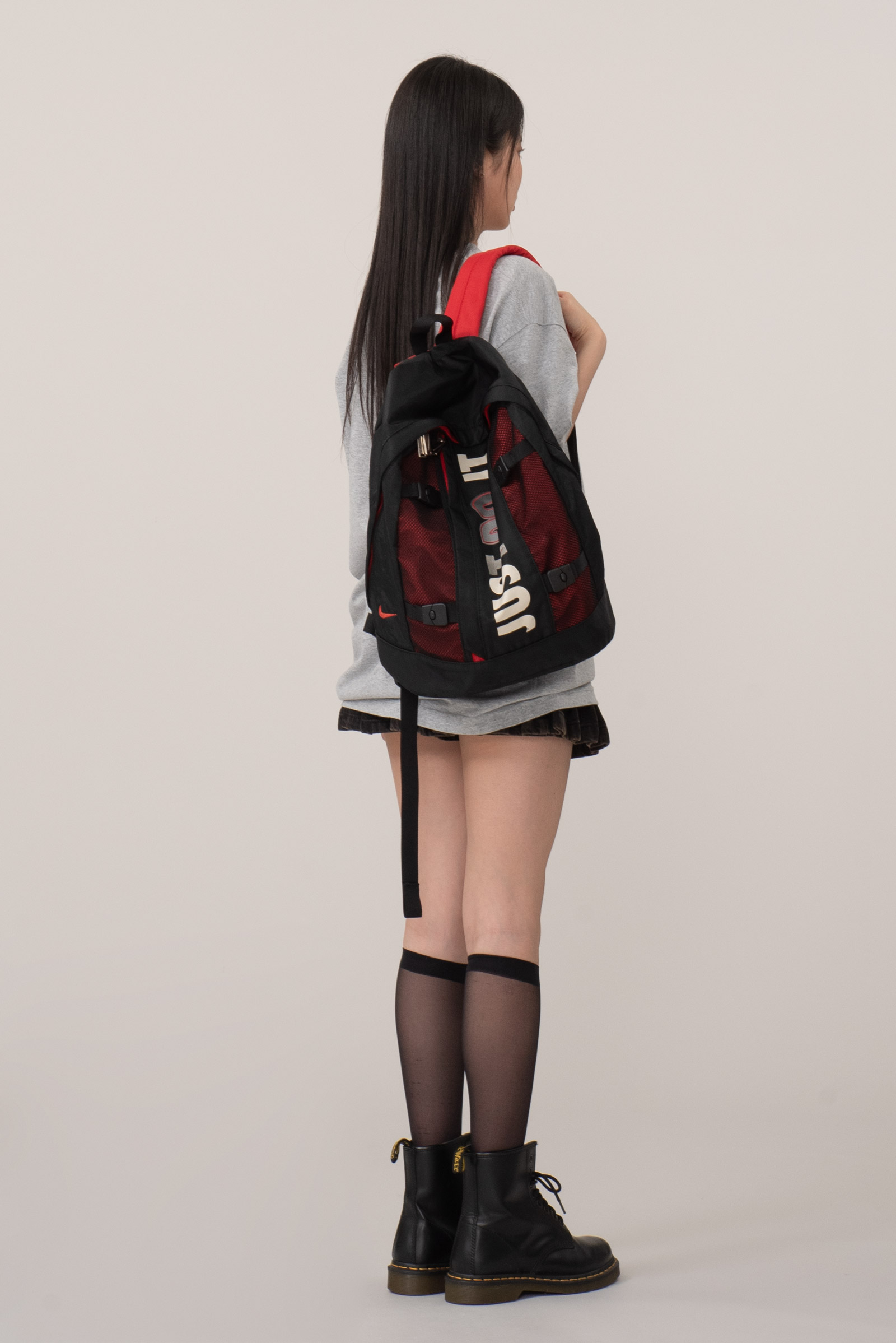 블랙&레드 컬러 조합, 메시 포켓, 클립 디테일이 스포티한 감성을 더해주며 강렬한 슬로건 디자인과 실용성을 겸비한 아이템입니다.