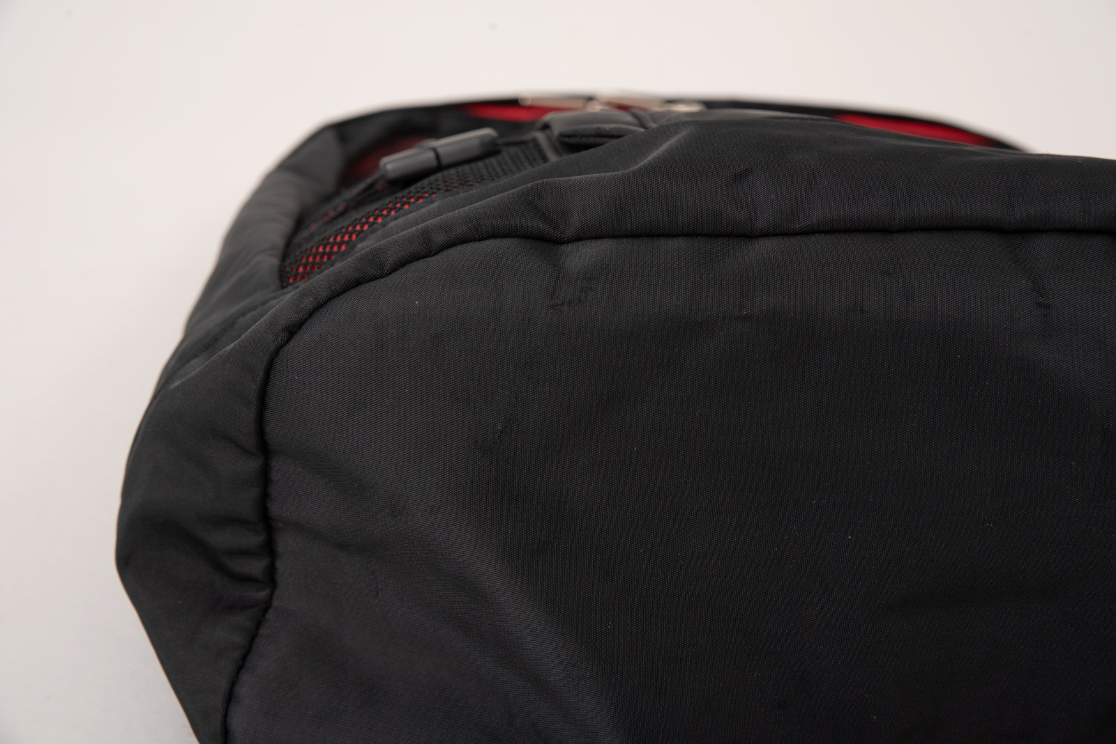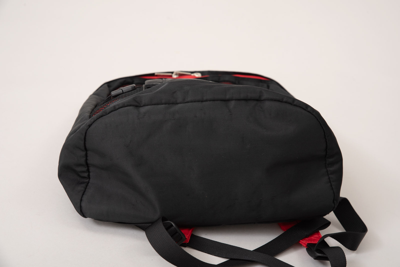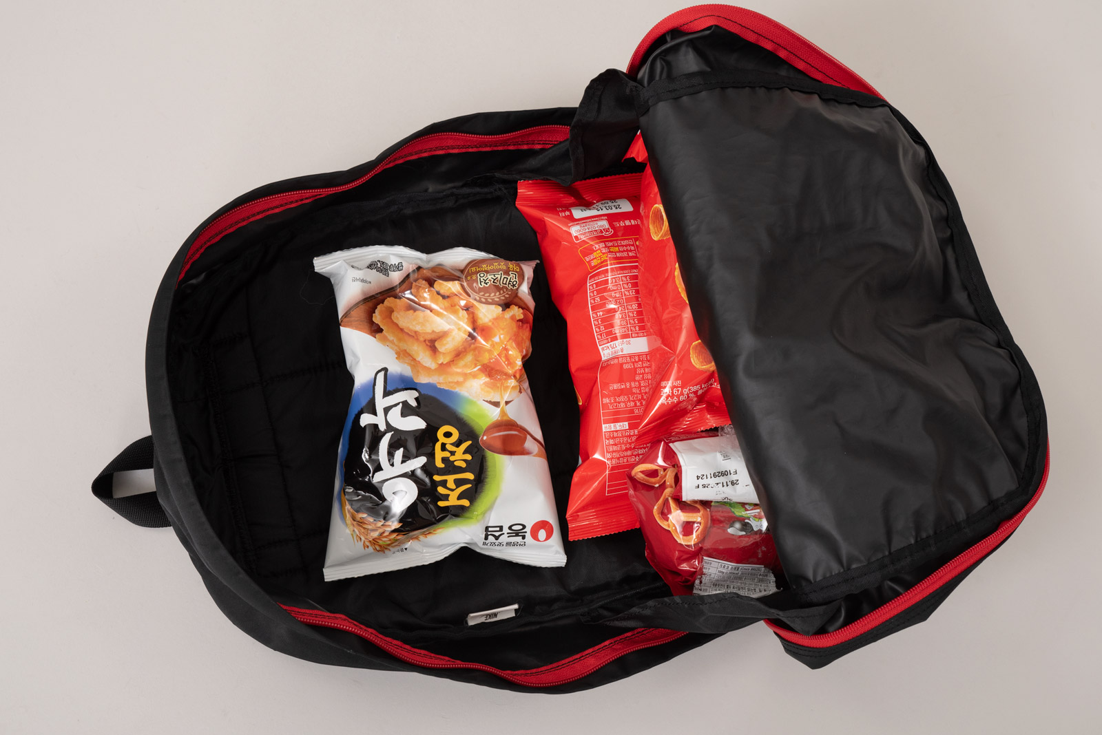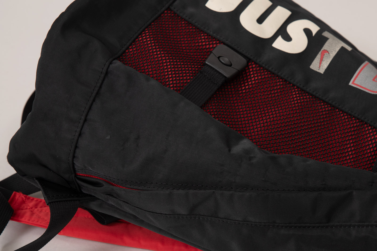 블랙&레드 컬러 조합, 메시 포켓, 클립 디테일이 스포티한 감성을 더해주며 강렬한 슬로건 디자인과 실용성을 겸비한 아이템입니다.