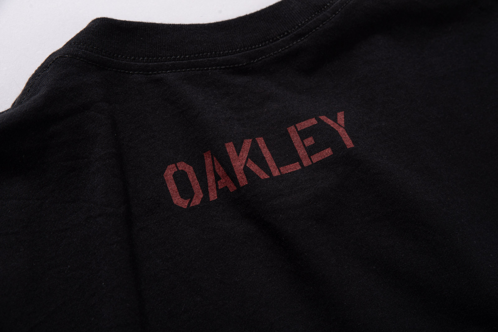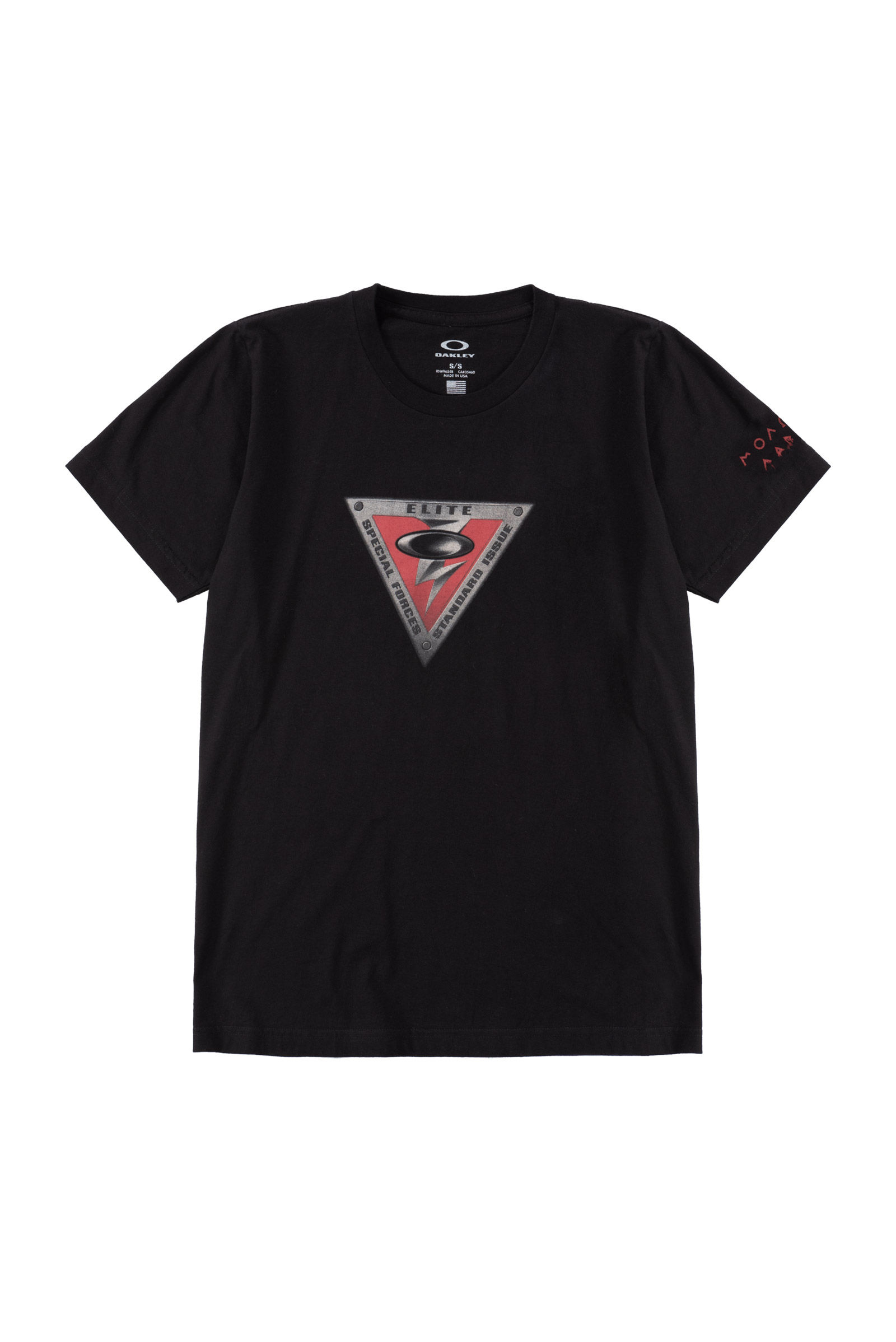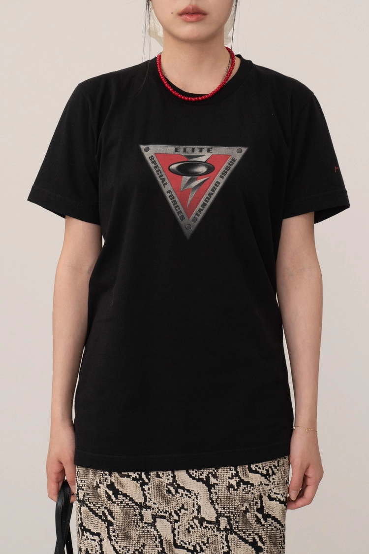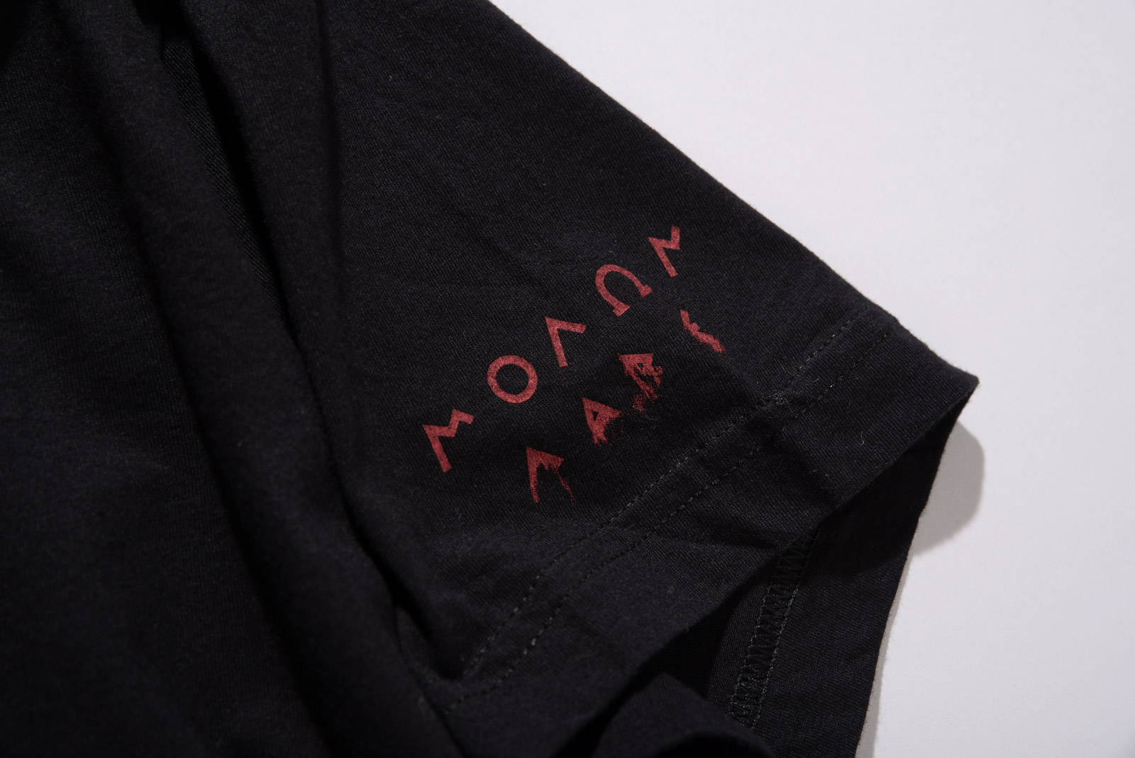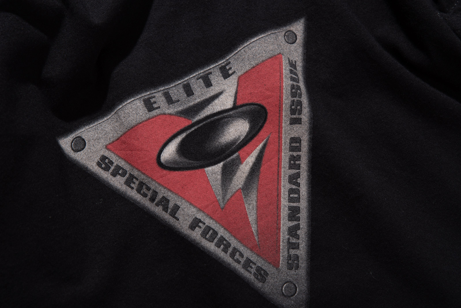 전면에는 레드와 실버 톤의 삼각형 프린트에 번개와 고글 심볼이 배치되어 있고 뒷넥과 소매에도 밀리터리 타입 레터링이 인쇄되어 있어 심플하지만 강한 인상을 주는데요.