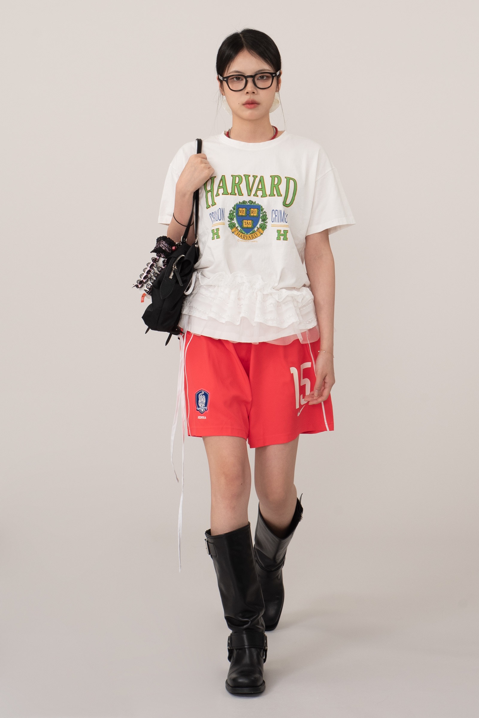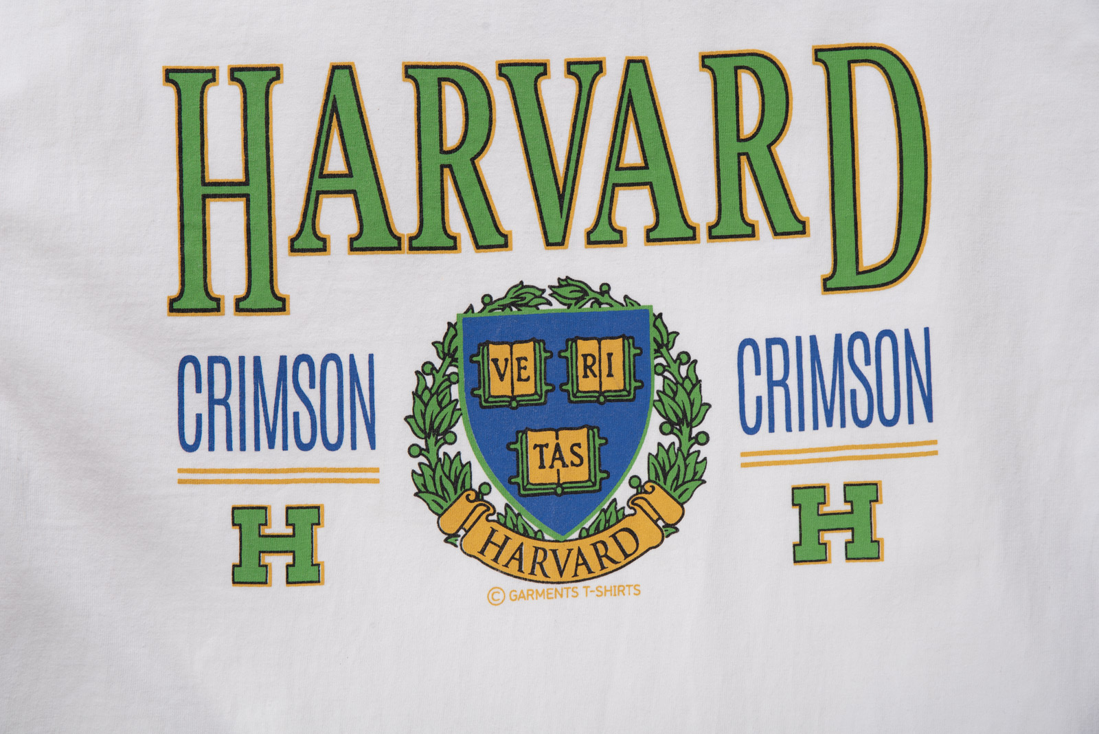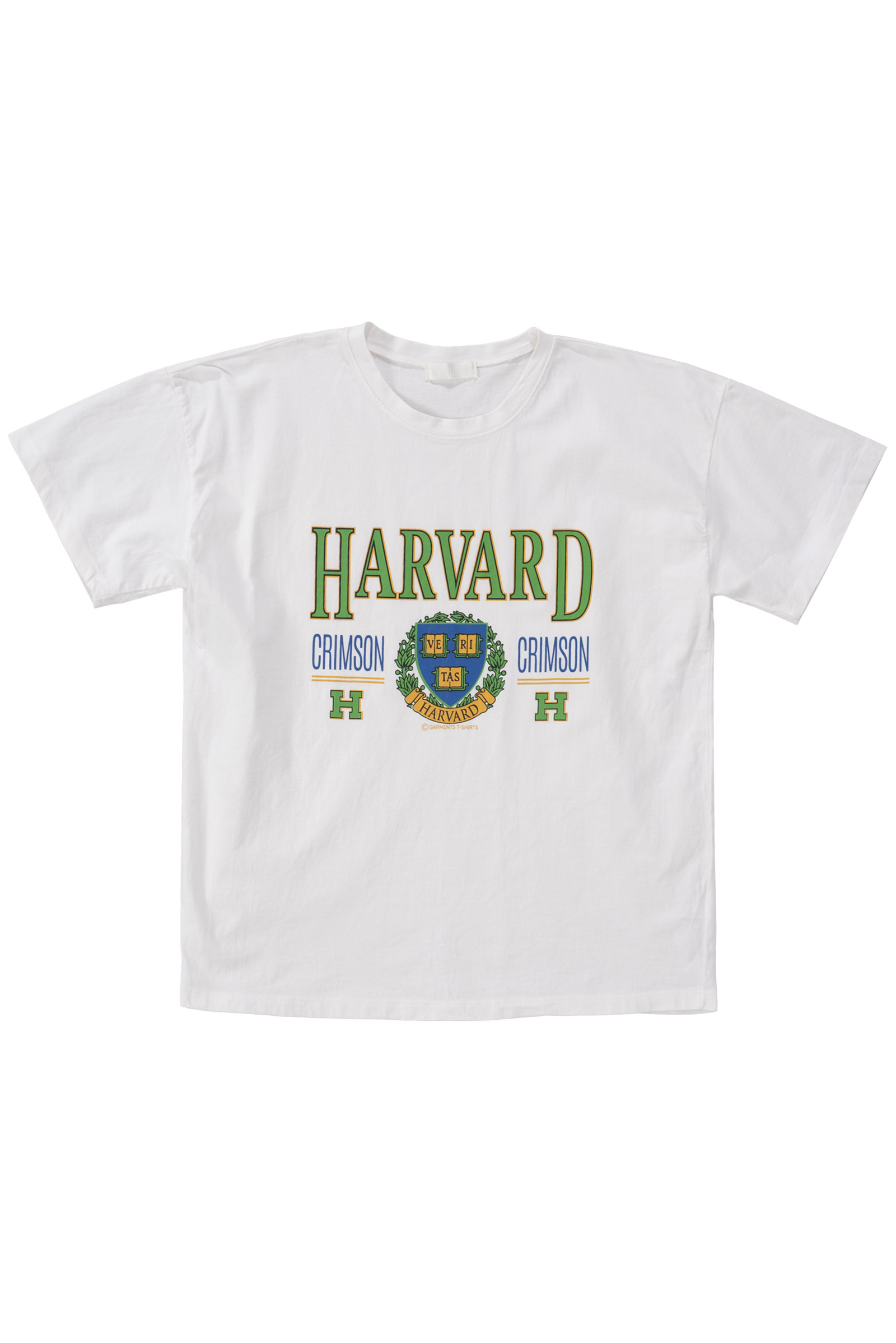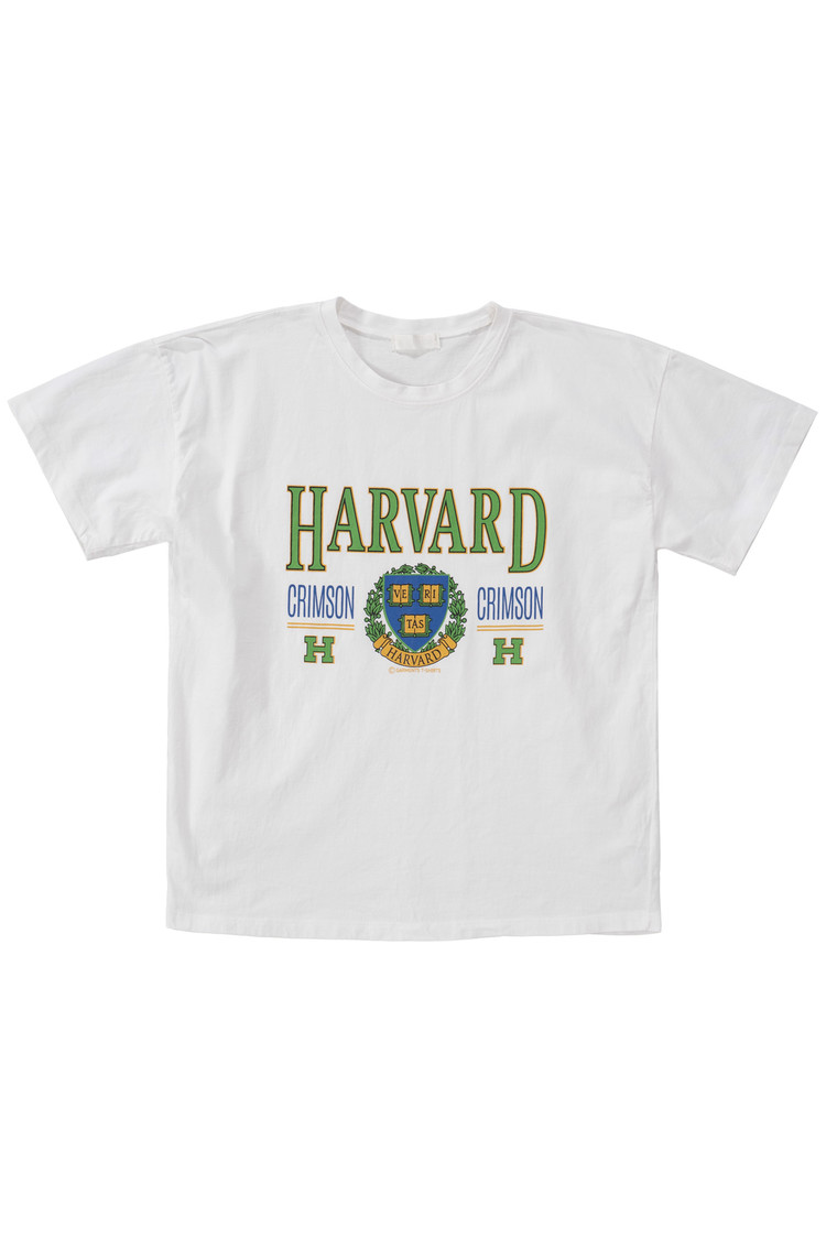 정면에는 하버드 대학교의 공식 엠블럼과 "CRIMSON" 타이포가 클래식하게 프린트되어 있으며 올드스쿨 무드를 가미한 초록 테두리의 HARVARD 로고가 포인트랍니다.