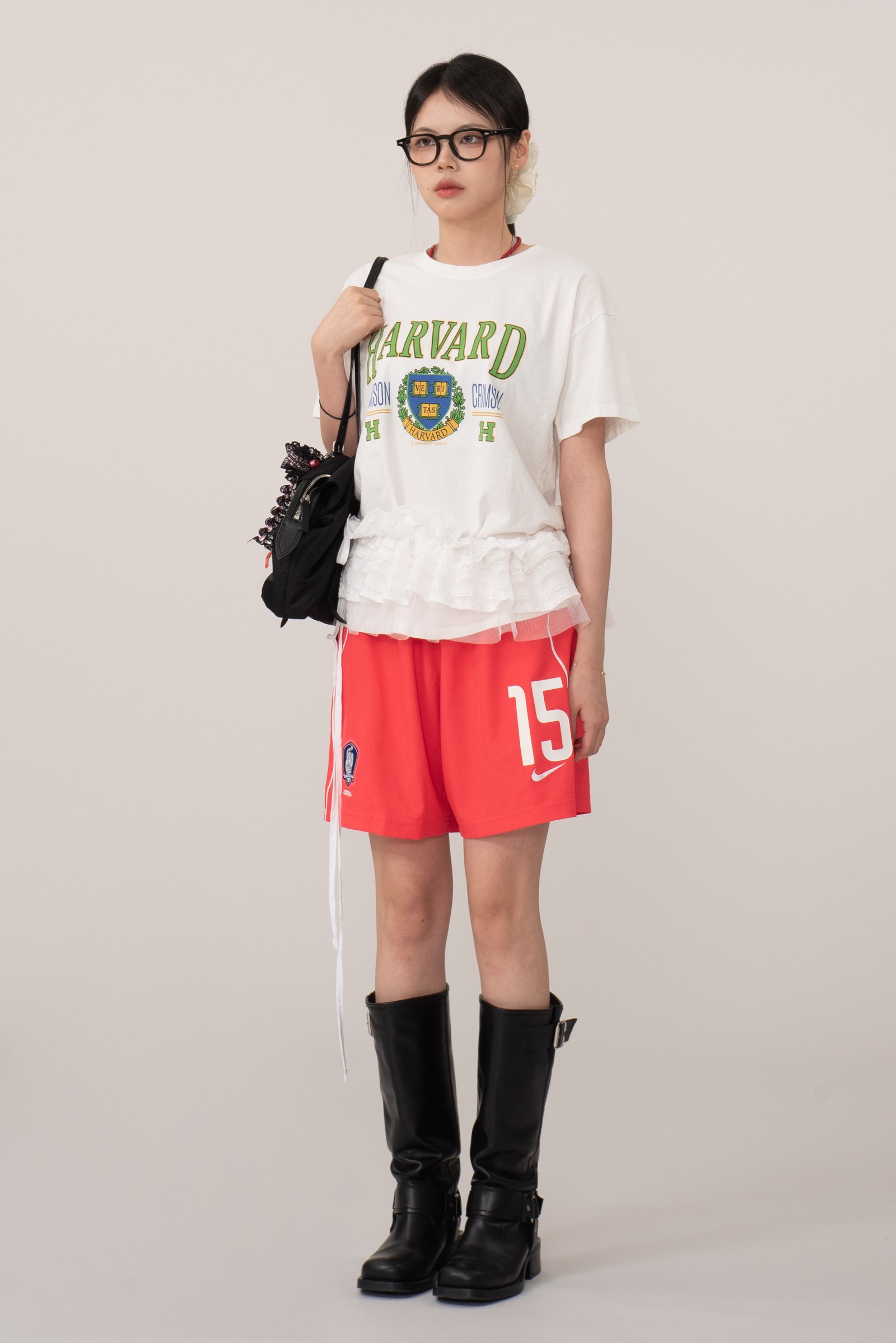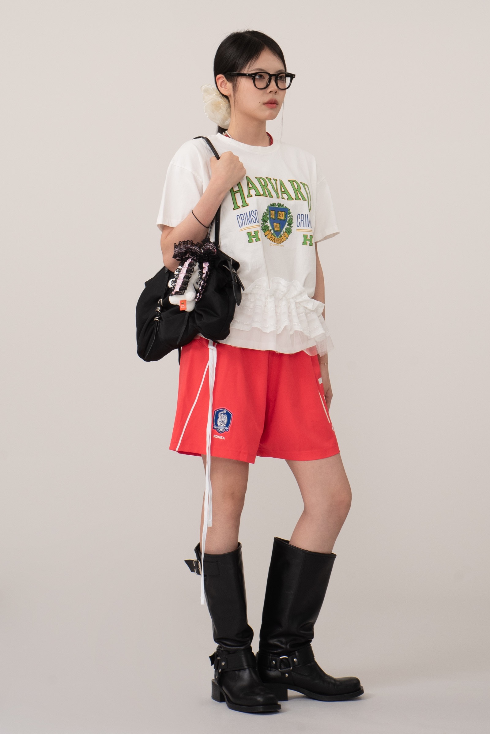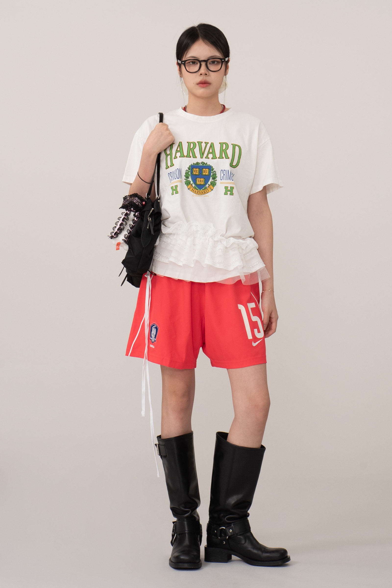 정면에는 하버드 대학교의 공식 엠블럼과 "CRIMSON" 타이포가 클래식하게 프린트되어 있으며 올드스쿨 무드를 가미한 초록 테두리의 HARVARD 로고가 포인트랍니다.