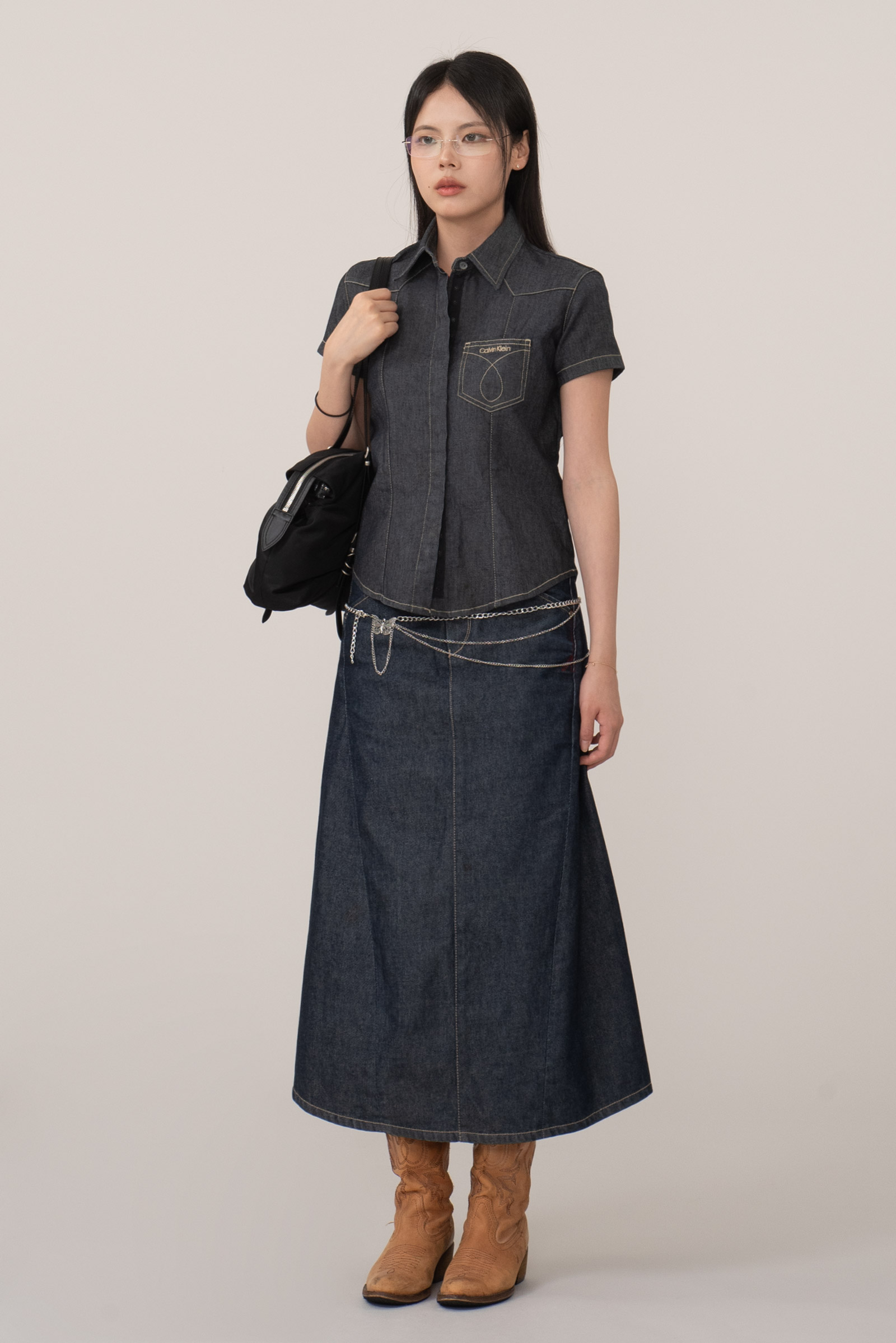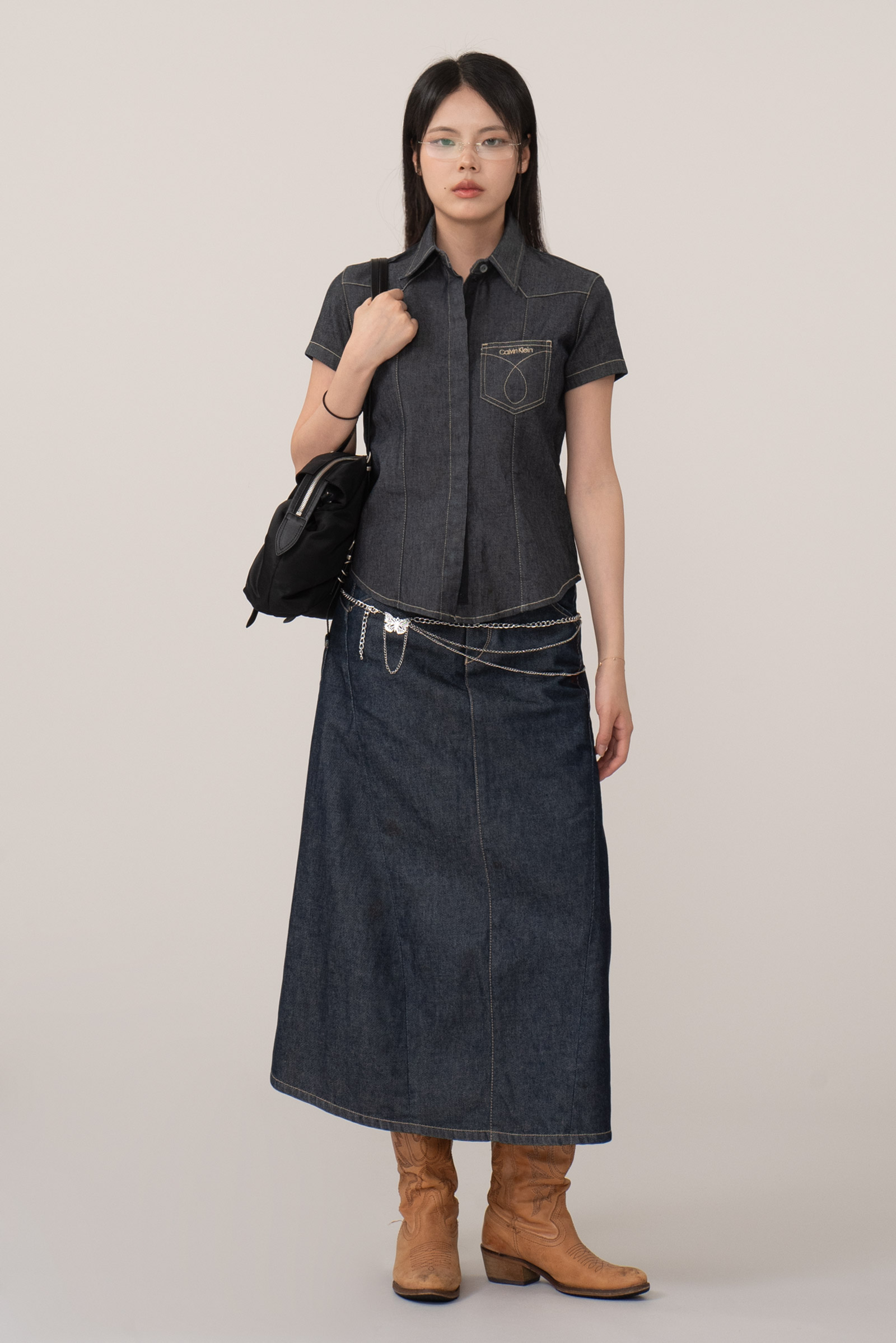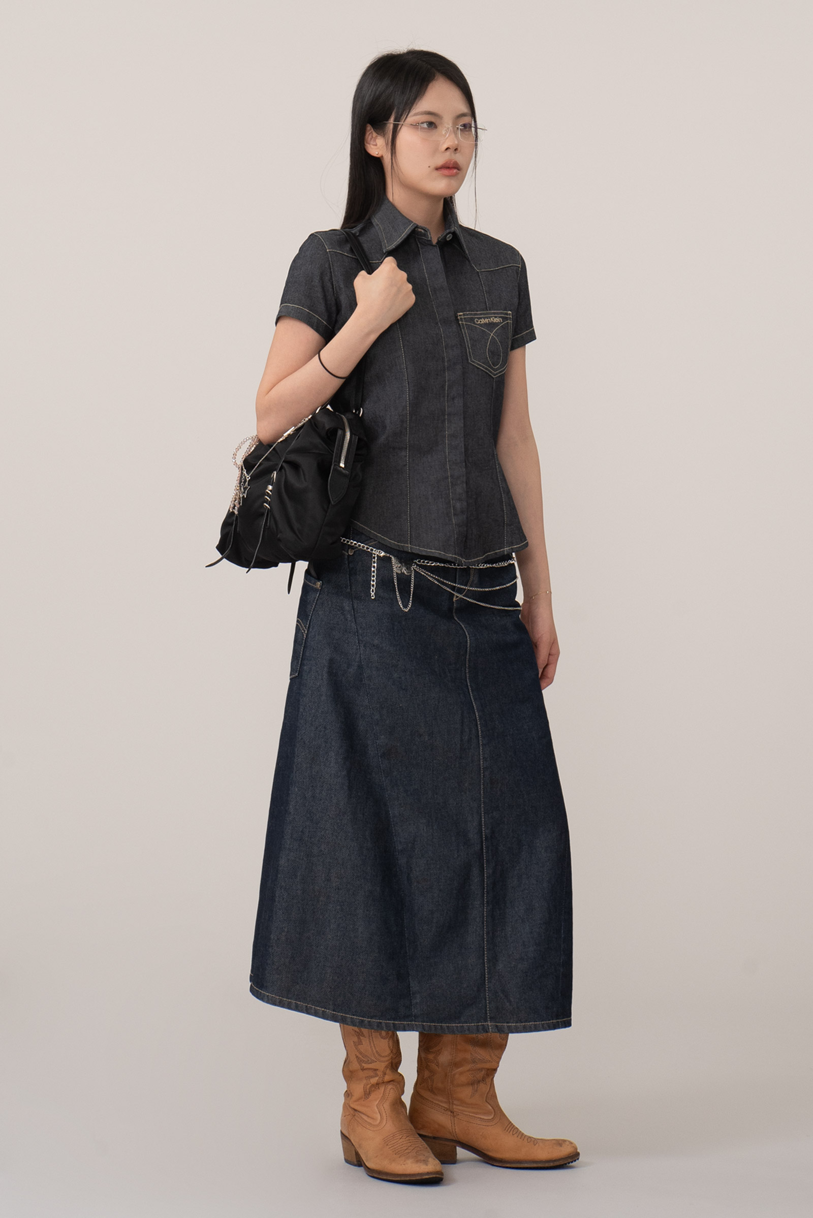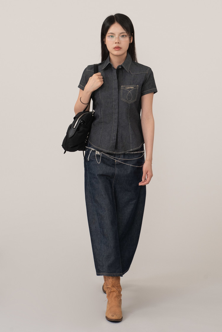 촘촘한 히든 버튼 디테일과 진한 인디고 컬러, 그리고 포켓 위 브랜드 로고 자수와 곡선 스티치가 개성을 더해준답니다.