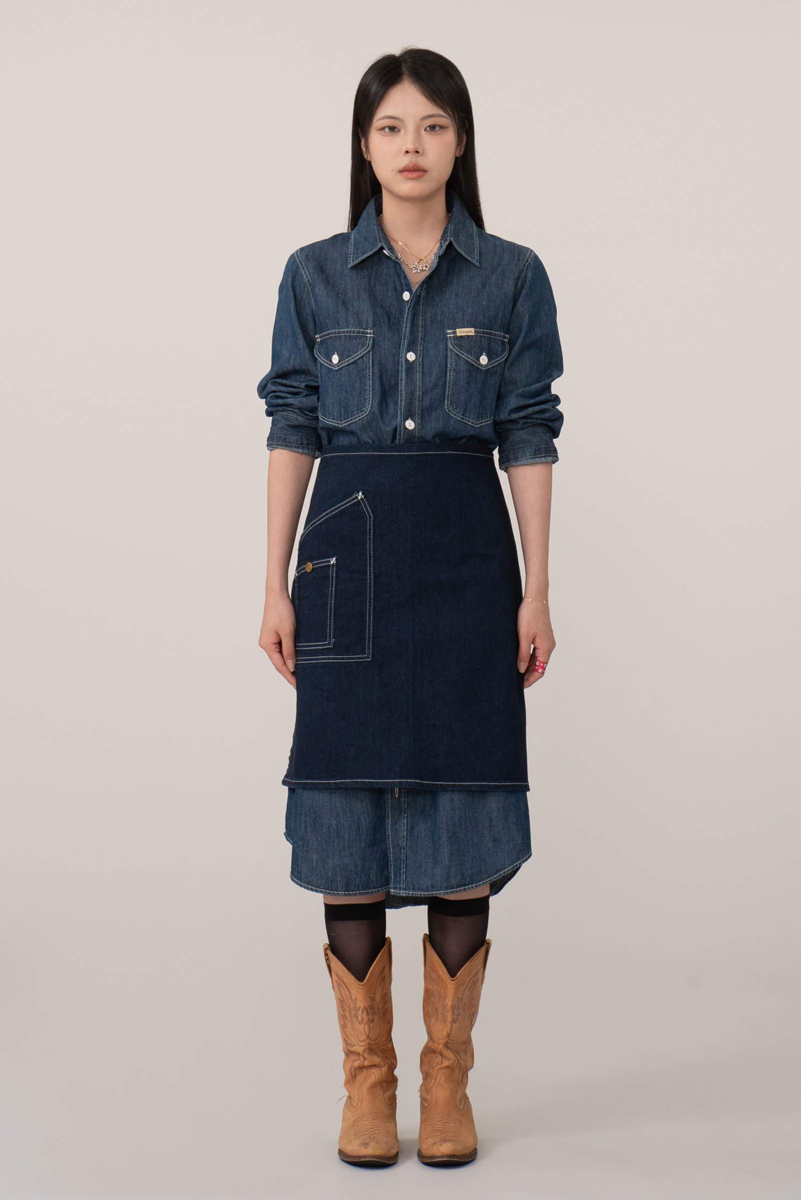 허리에 둘러 매는 하프 앞치마 형태로 체형 구애 없이 누구나 자연스럽게 착용할 수 있으며 스트레이트하면서도 안정감 있는 핏으로 허리선을 딱 잡아줘 전체 실루엣이 깔끔하게 정리된답니다.