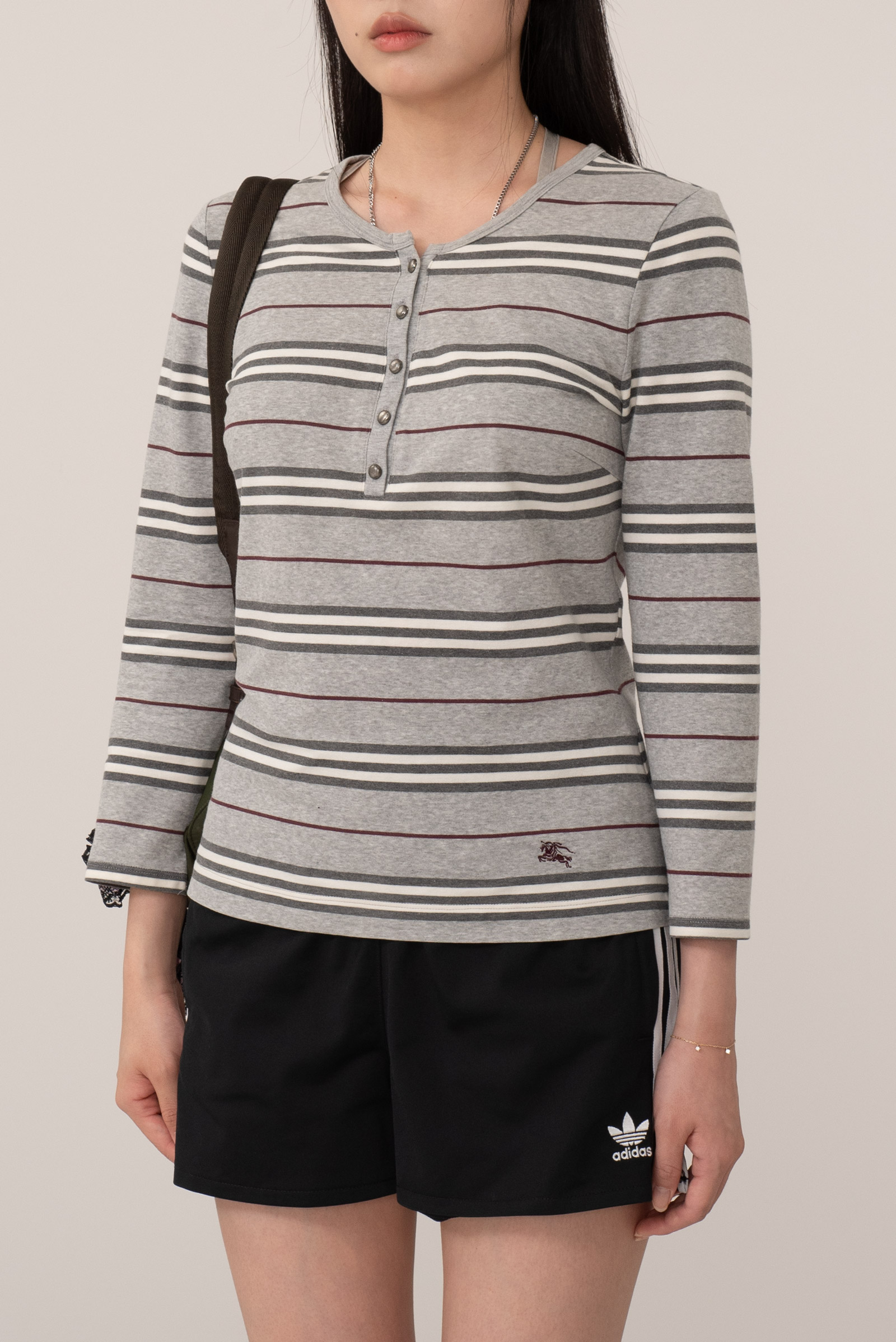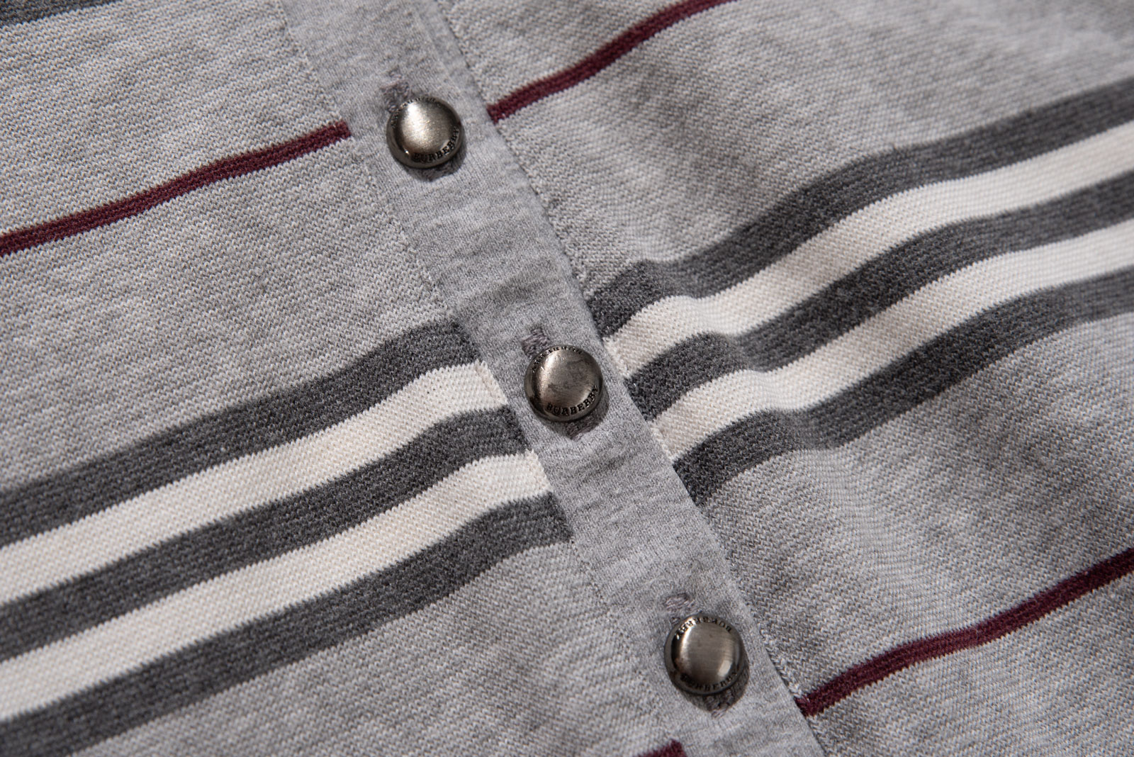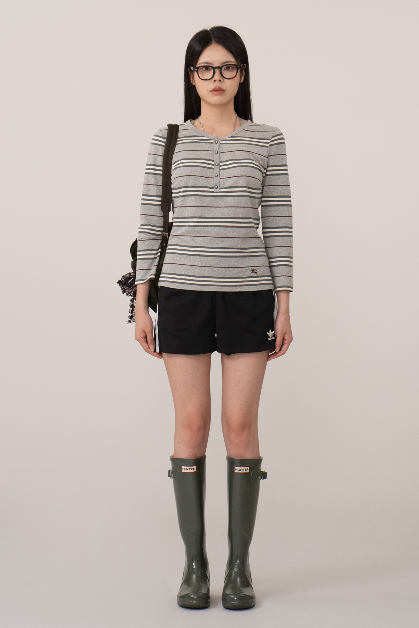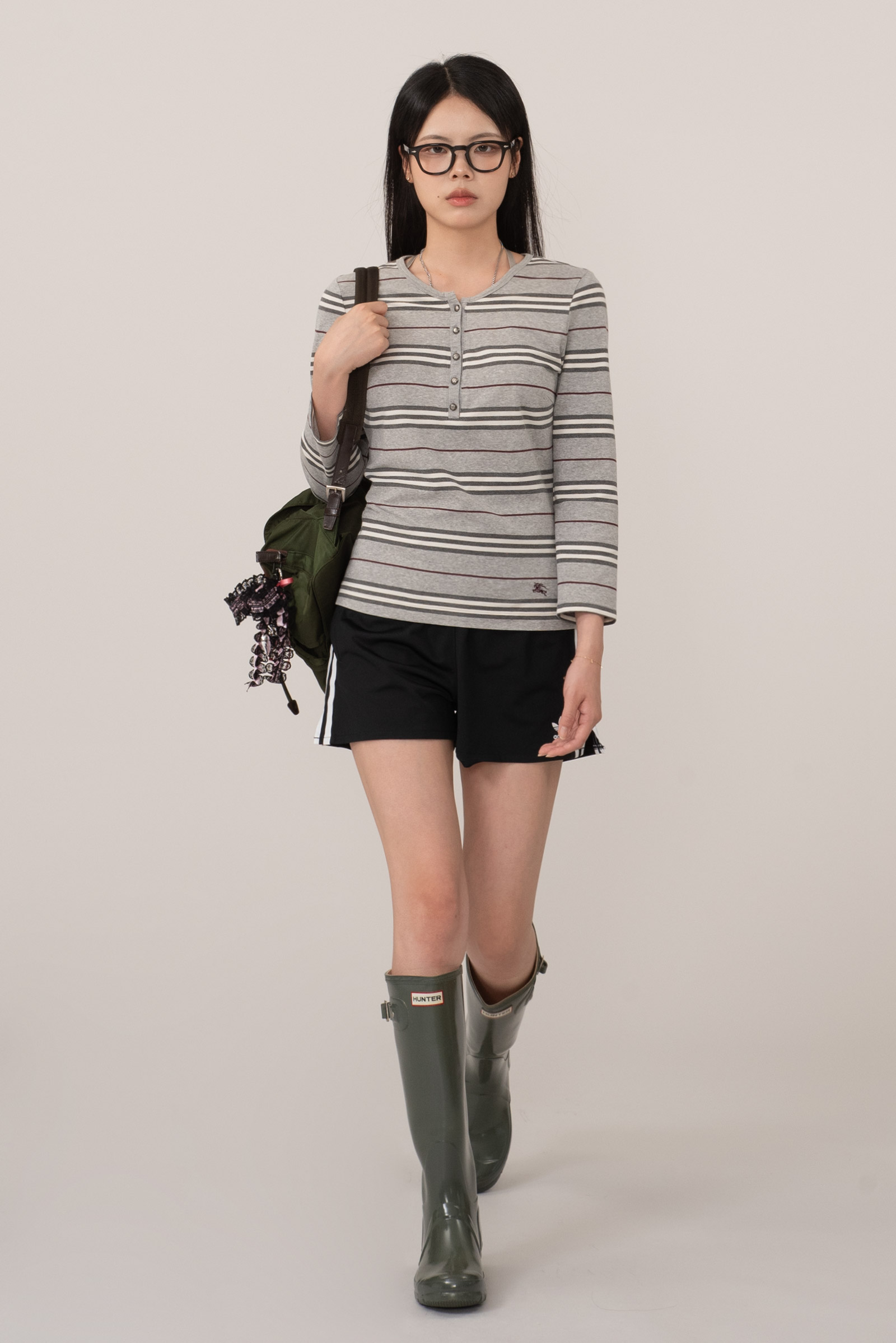 헨리넥 버튼 디테일과 소매의 슬림한 마감 처리로 캐주얼하면서도 단정한 느낌, 로우 웨이스트 쪽에 은은하게 들어간 버건디 컬러의 기마병 자수 로고 역시 포인트 되네요.