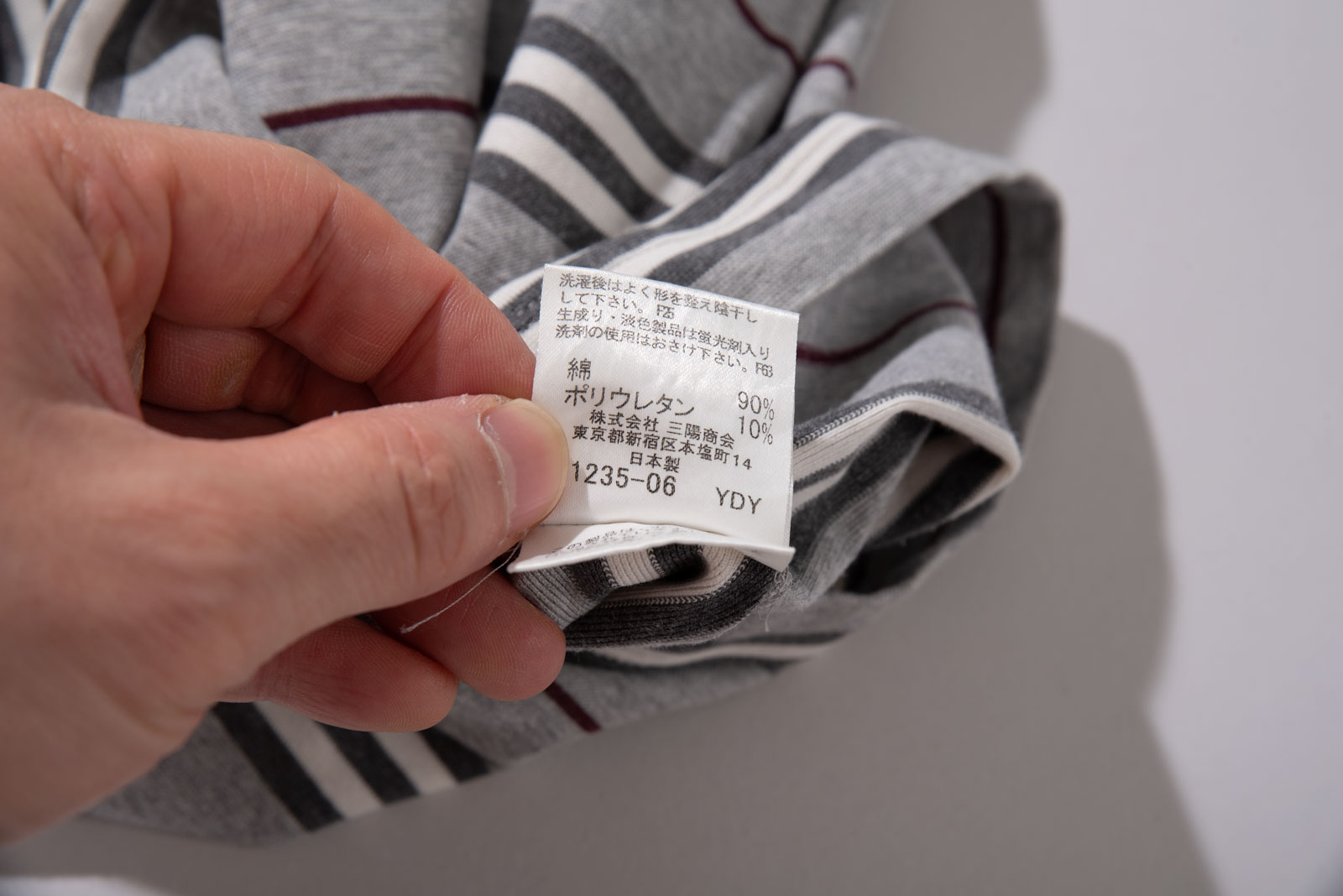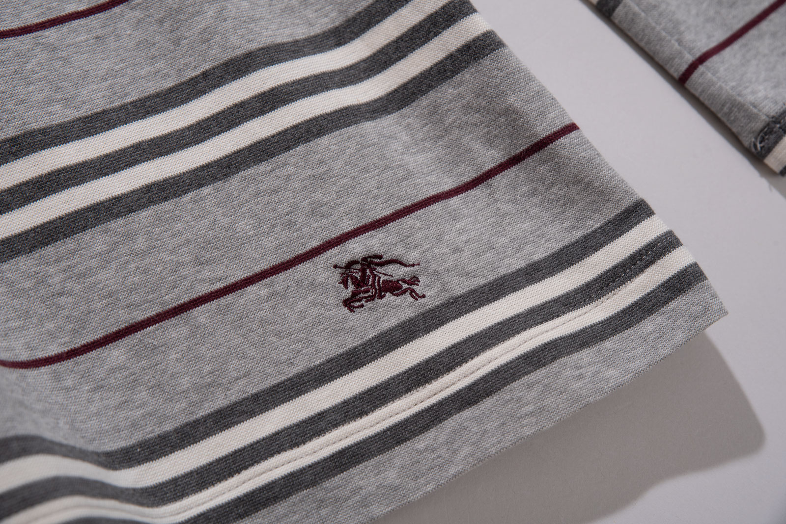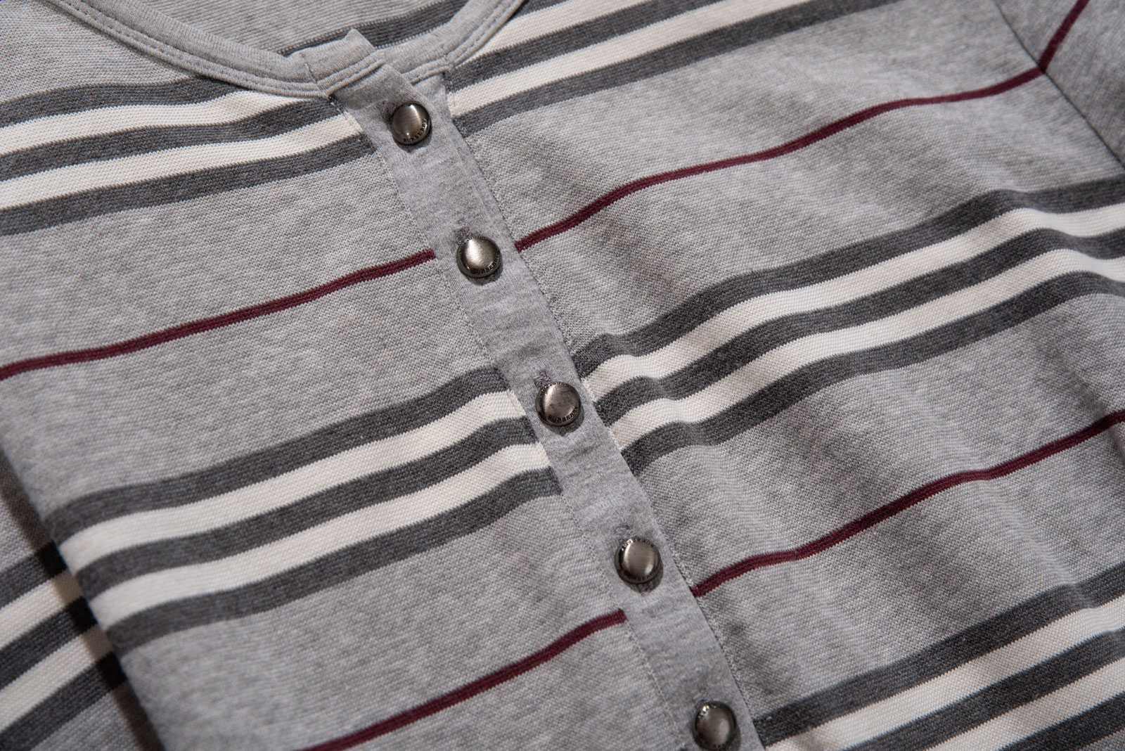 코튼 90%, 폴리우레탄 10% 혼방 소재로 부드럽고 쫀쫀한 신축성을 자랑하며 회색 바탕에 화이트, 차콜, 버건디 스트라이프가 균형감 있게 배치되어 고급스럽고 클래식한 인상을 준답니다.