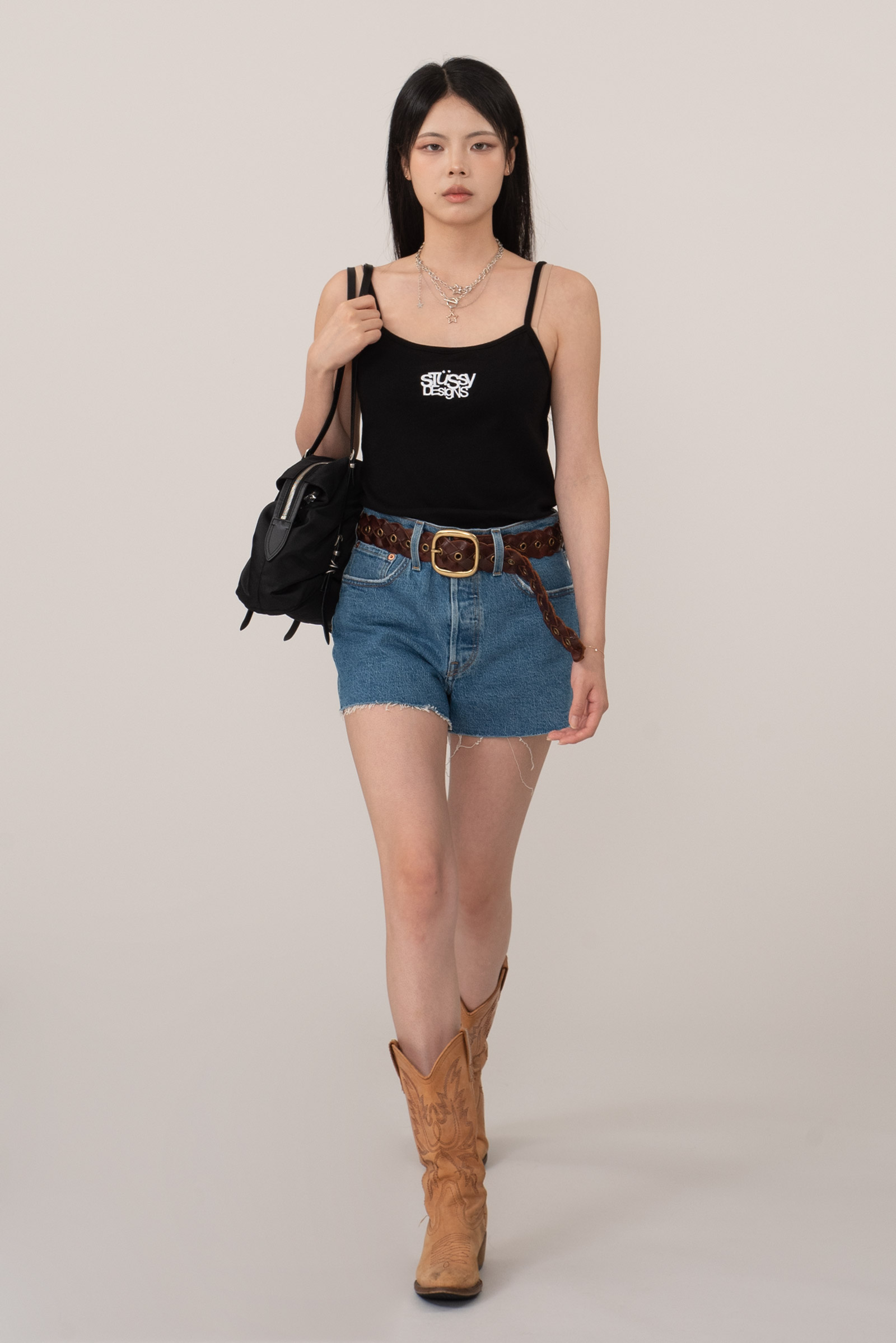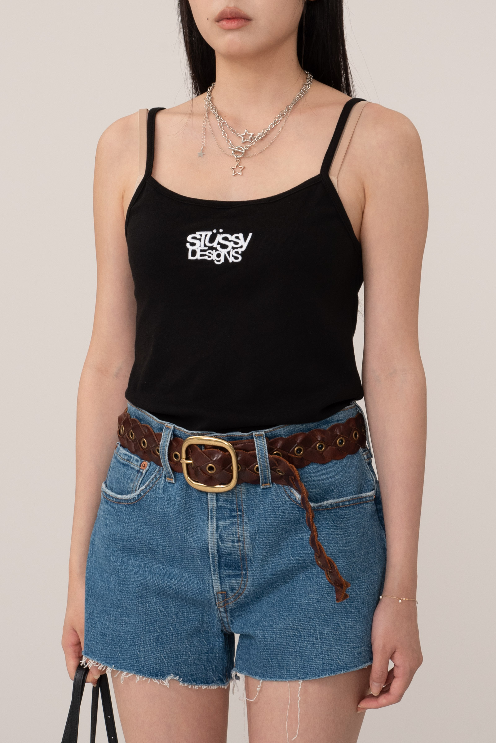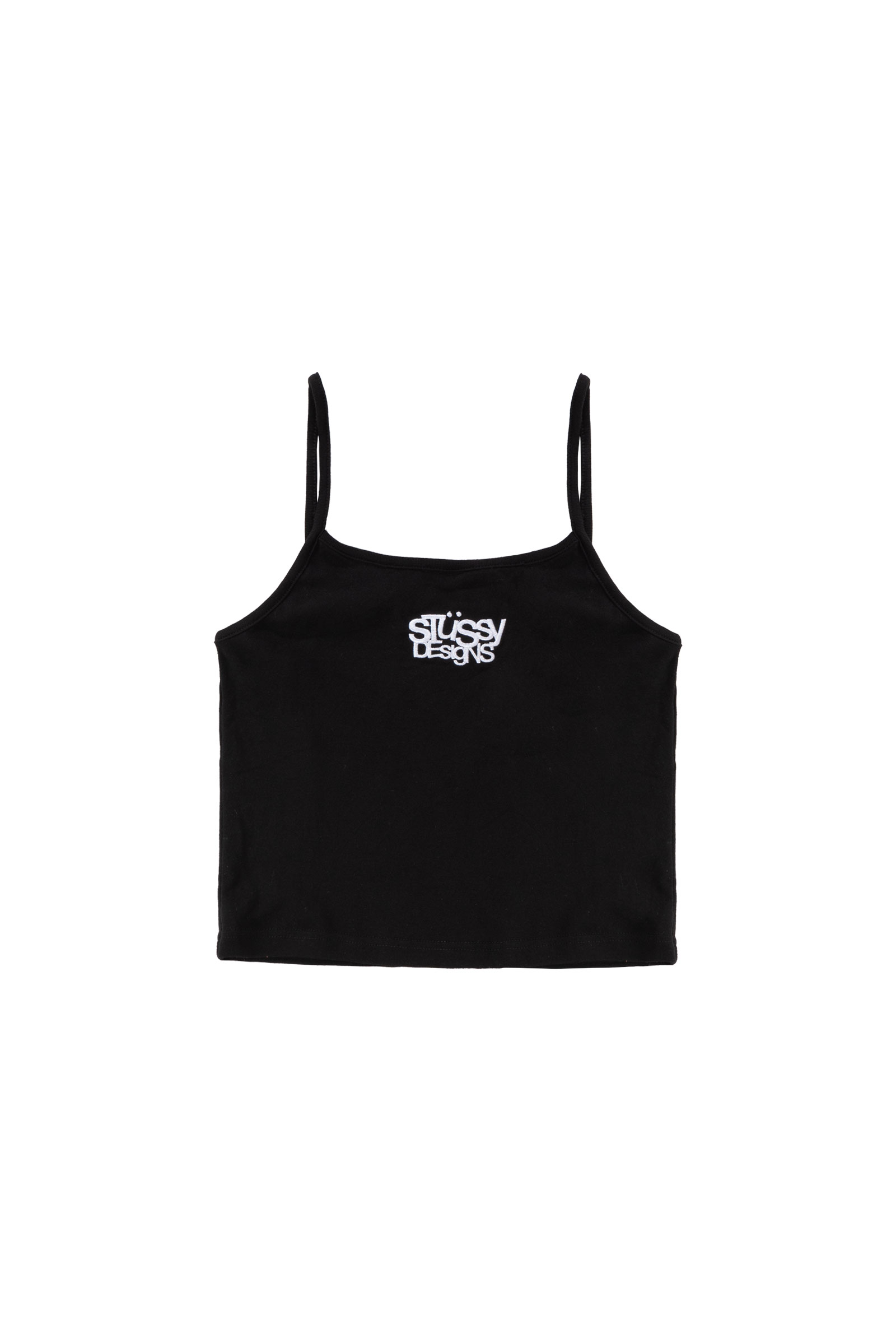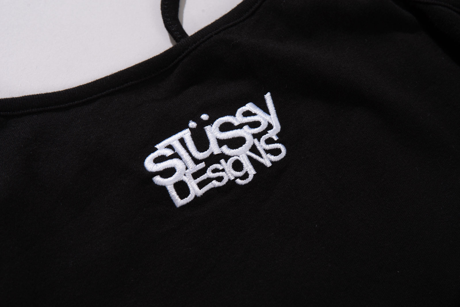 중앙에 흰색 자수로 새겨진 "STÜSSY DESIGNS" 로고가 강한 존재감을 주며 베이직한 블랙 컬러에 슬림한 끈이 더해져 미니멀하고도 과감한 실루엣을 연출합니다.
