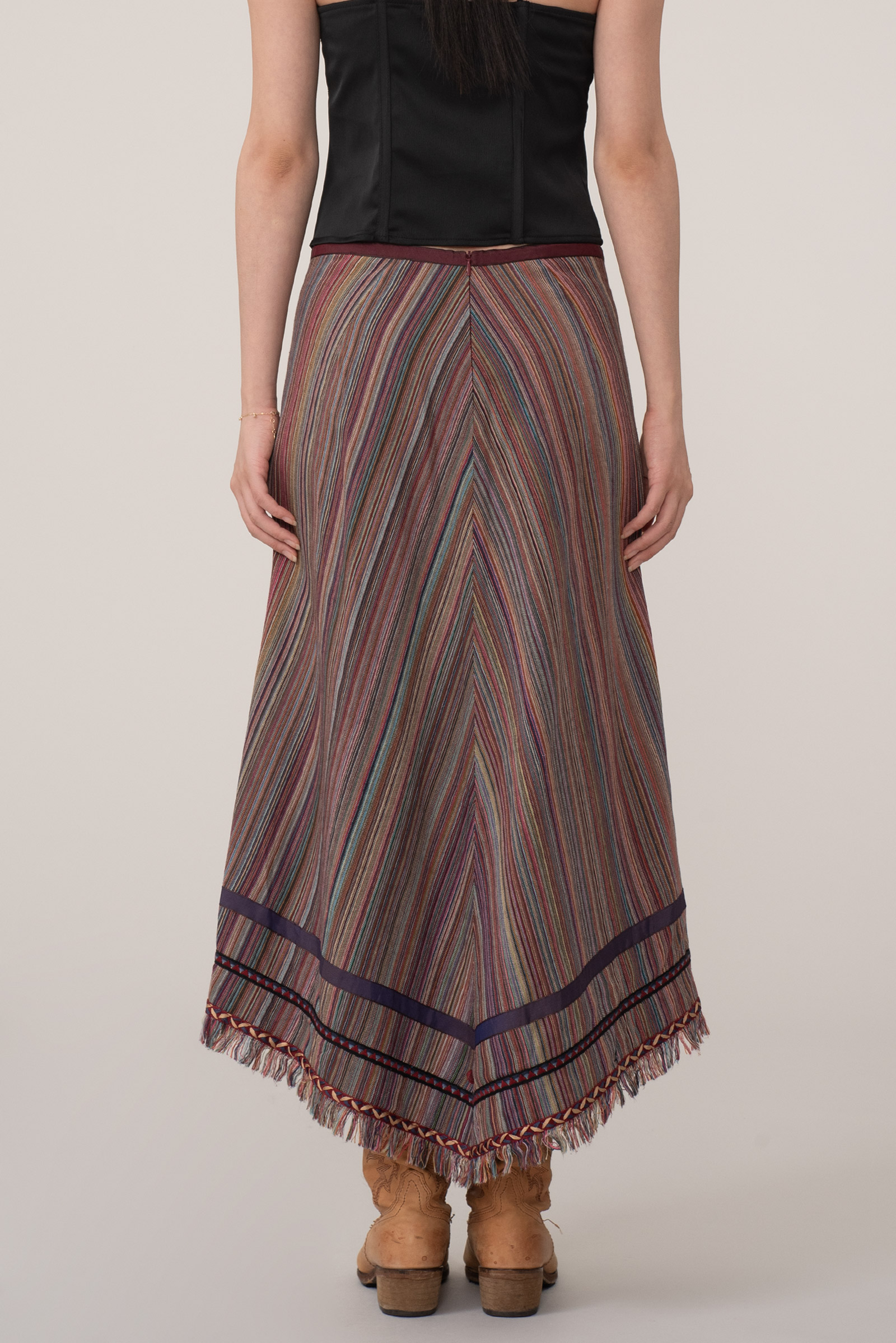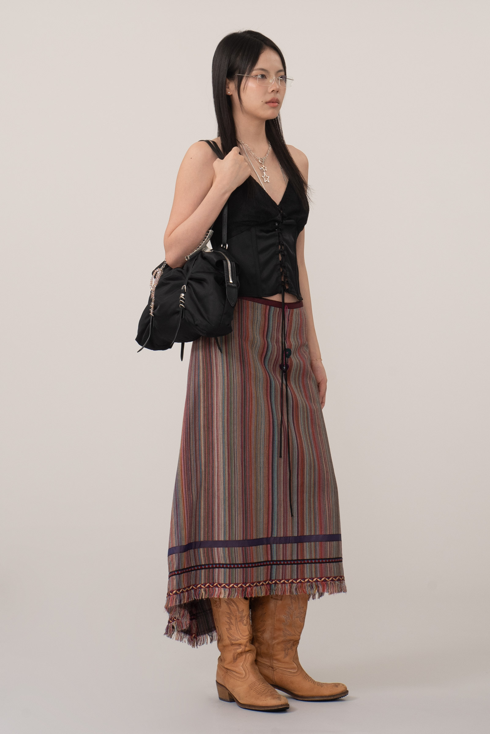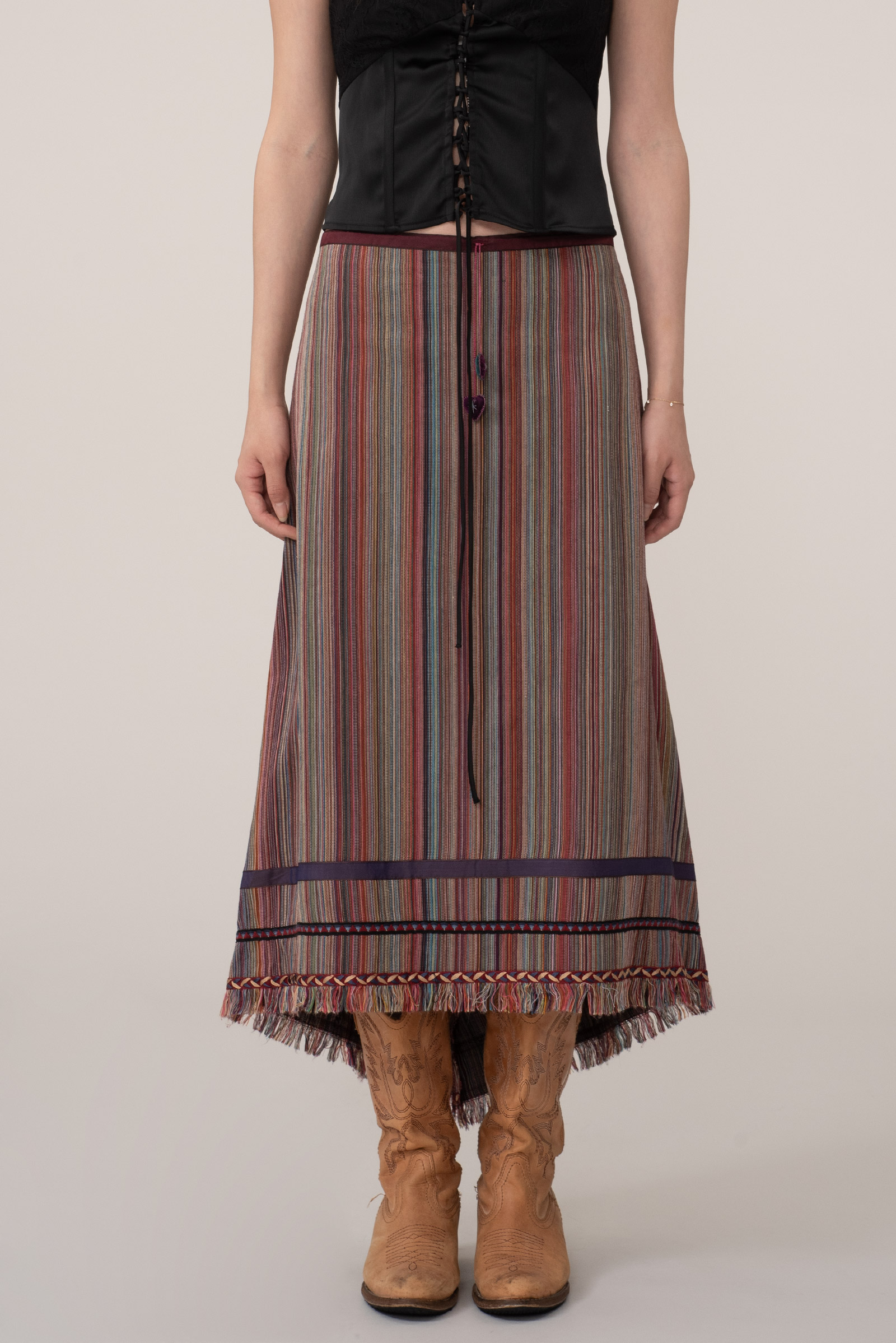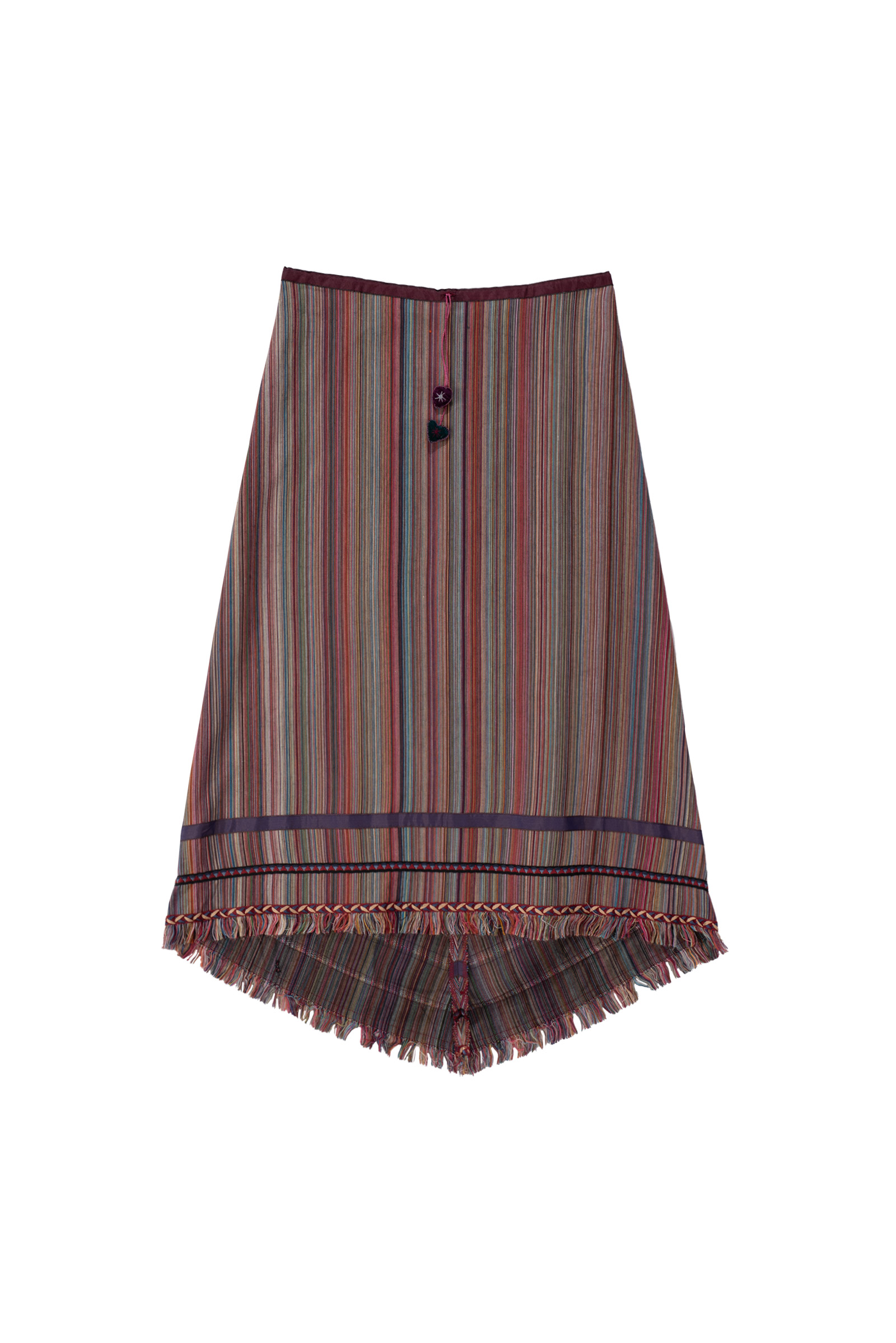 이번 스트라이프 스커트는 다양한 컬러가 섬세하게 직조된 텍스처, 프린지 디테일, 그리고 하트 모티브의 버튼과 비대칭 밑단으로 90년대 유럽 언더그라운드와 보헤미안 감성을 그대로 담고 있네요.