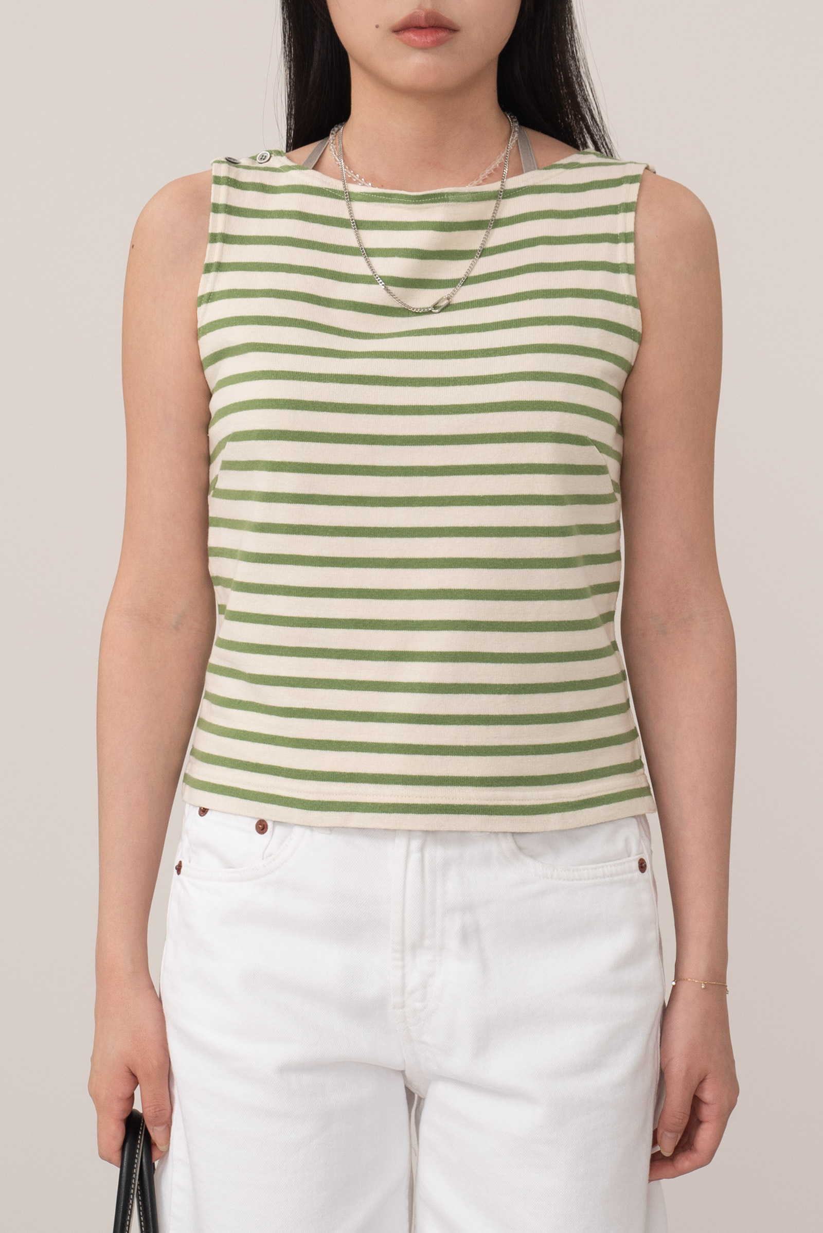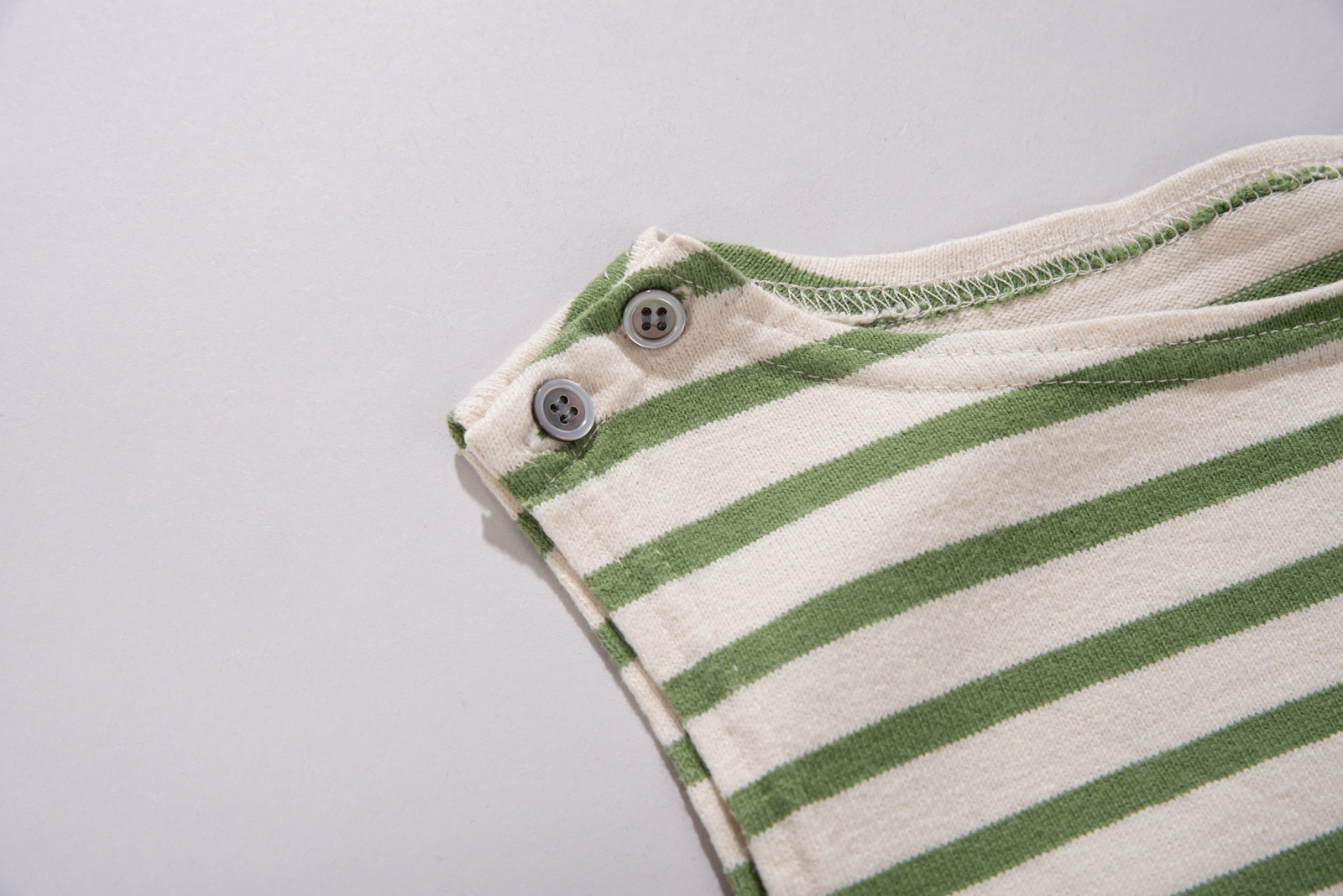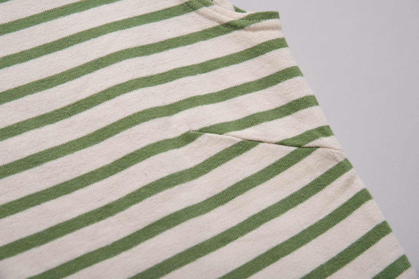 크림색 바탕에 올리브그린 컬러의 스트라이프 패턴, 왼쪽 숄더의 투 버튼 디테일, 그리고 탄탄하고 밀도 높은 100% 코튼 원단으로, 여름철 쾌적하면서도 클래식한 프렌치 마린 무드를 연출해 준답니다.