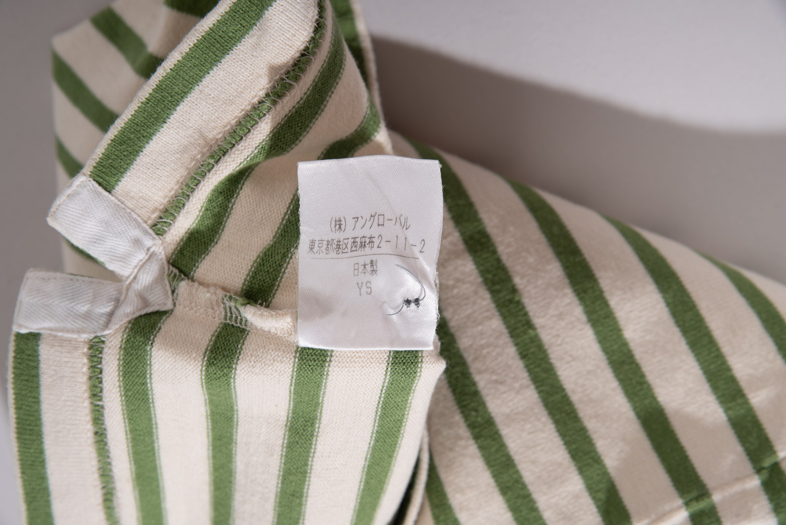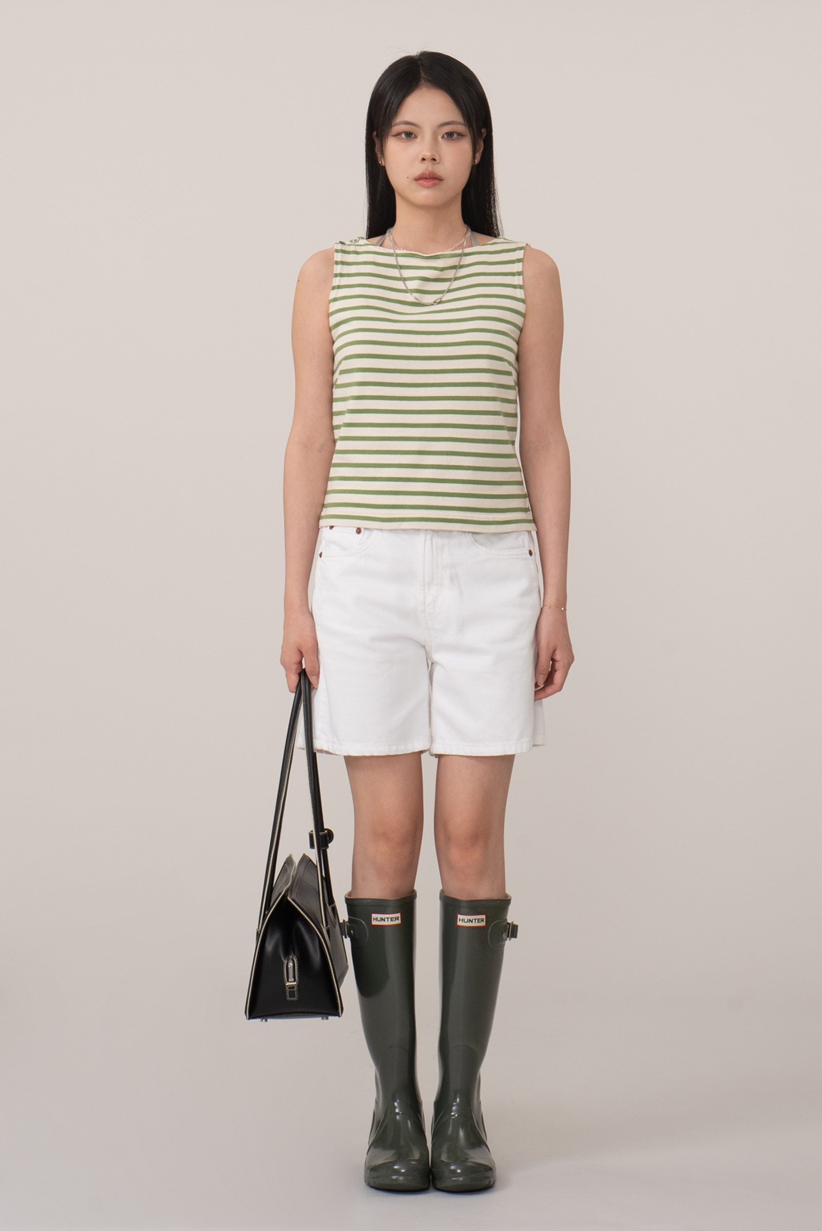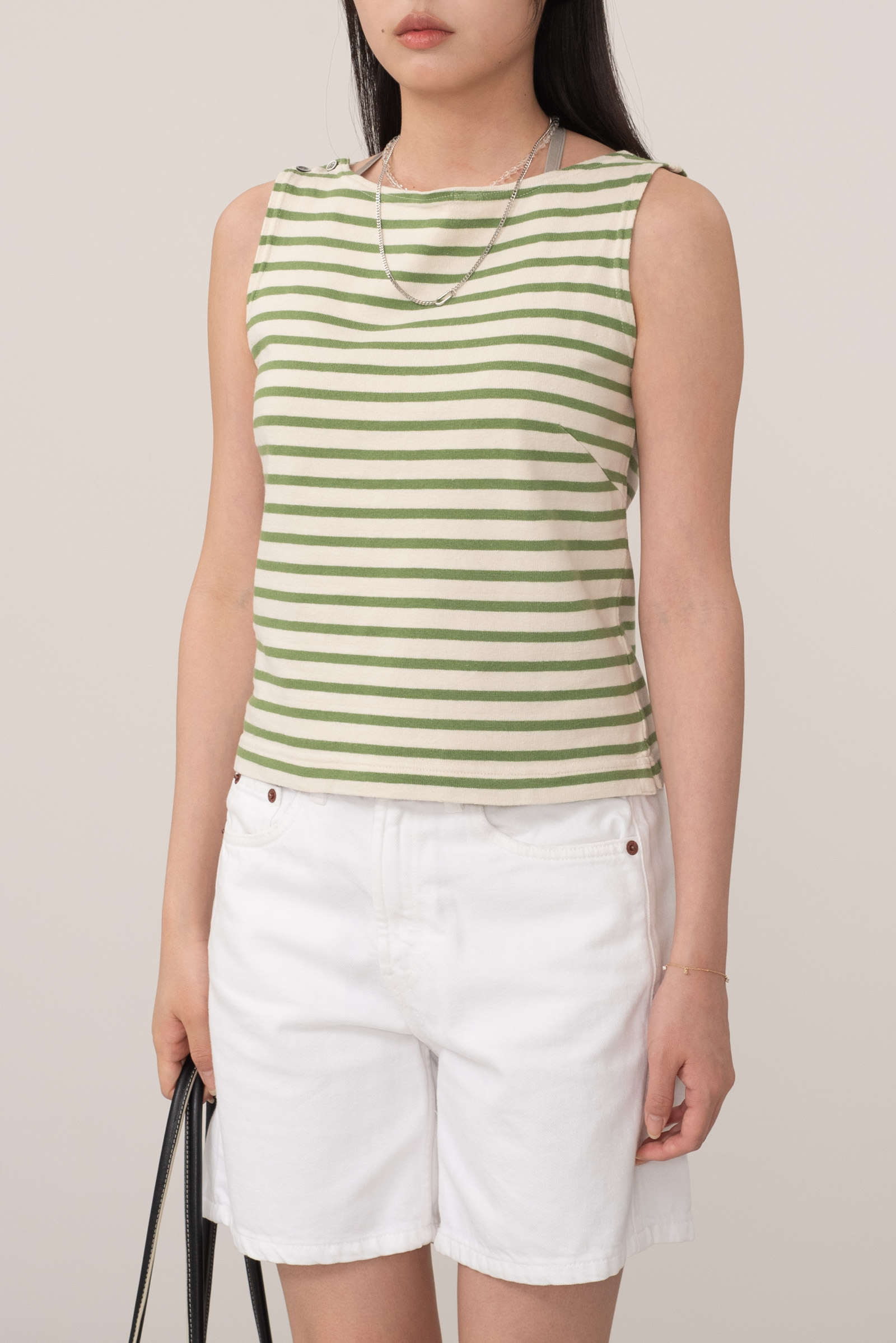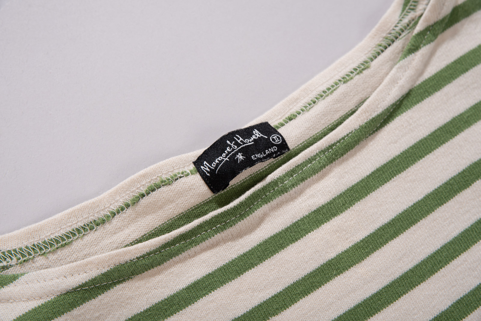 크림색 바탕에 올리브그린 컬러의 스트라이프 패턴, 왼쪽 숄더의 투 버튼 디테일, 그리고 탄탄하고 밀도 높은 100% 코튼 원단으로, 여름철 쾌적하면서도 클래식한 프렌치 마린 무드를 연출해 준답니다.