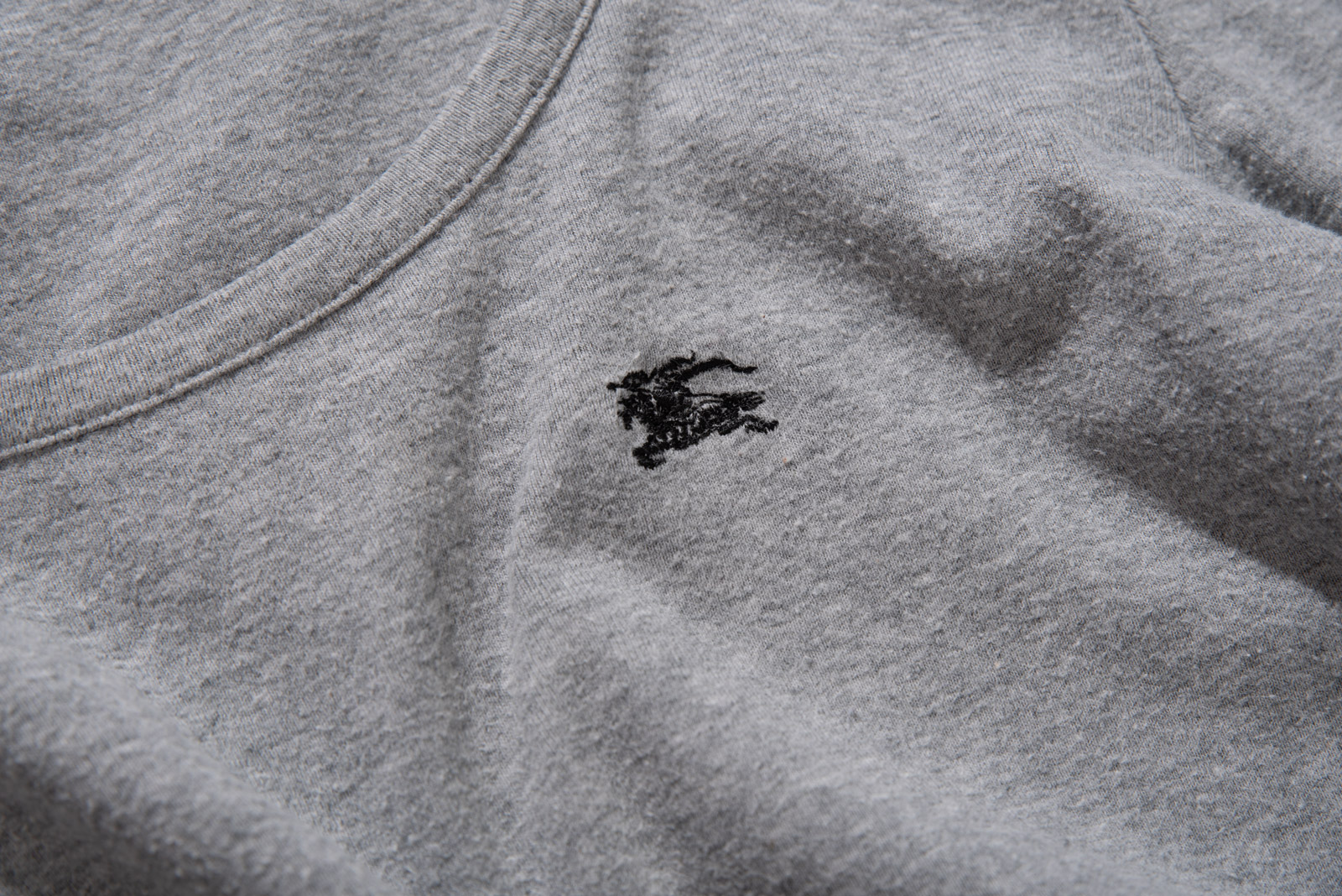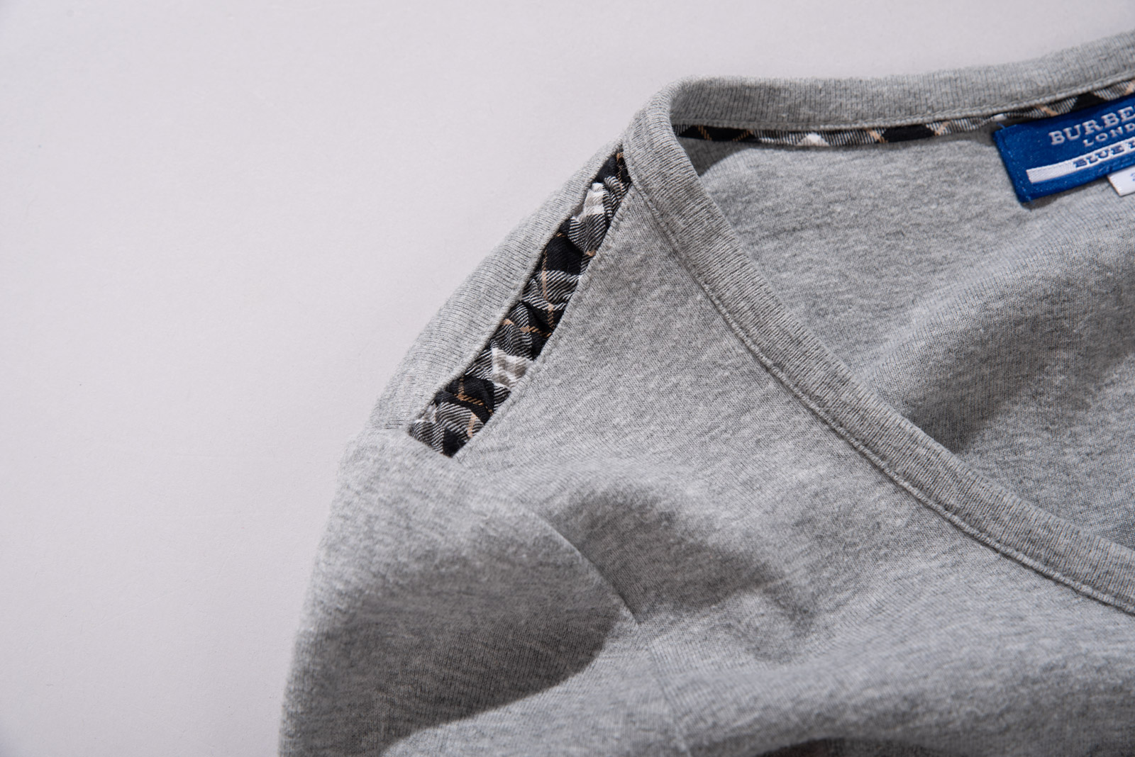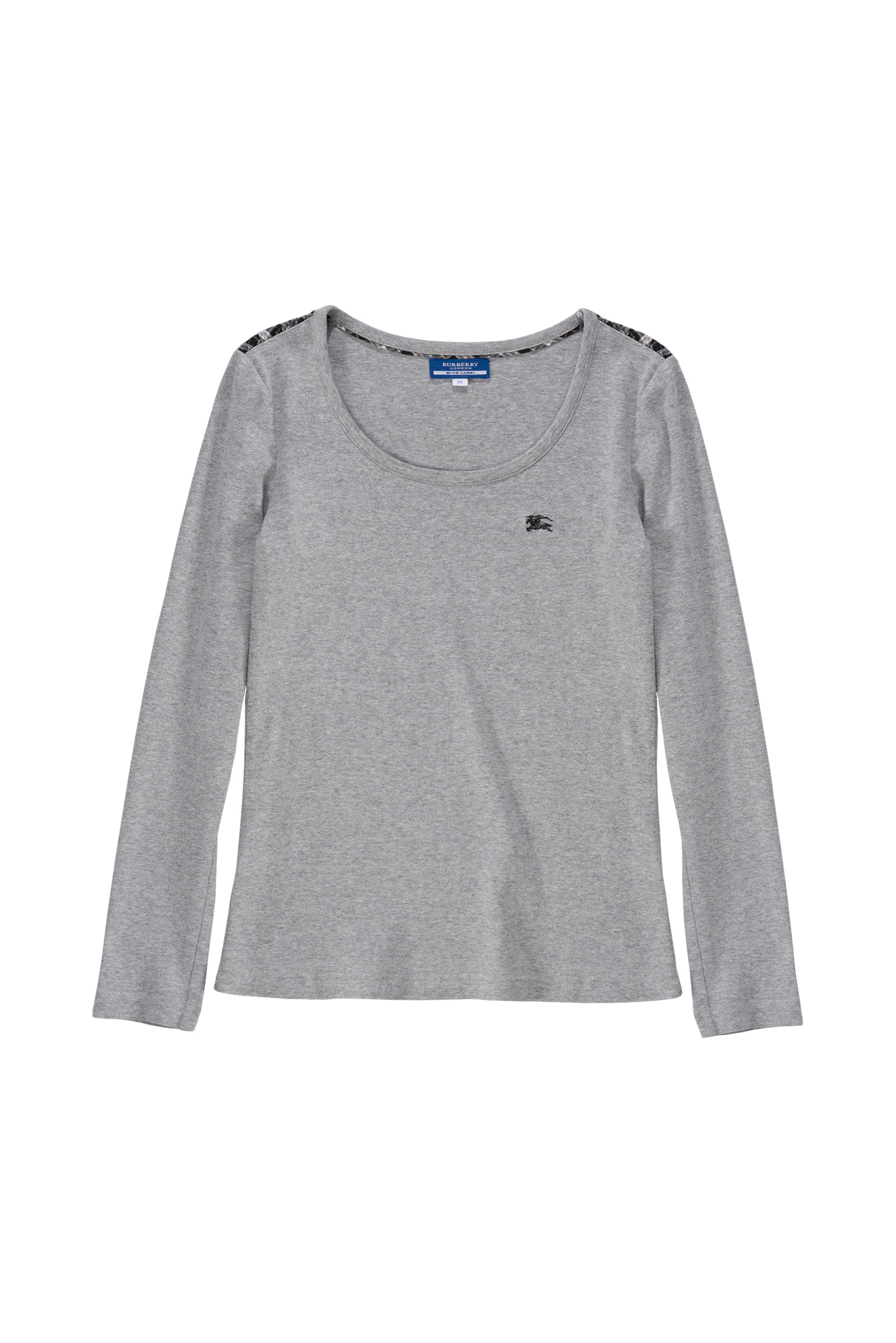 여유 있는 넥 라인에 미니멀하고 깔끔한 디자인, 어깨에는 버버리 특유의 체크무늬가 들어가 있고 가슴의 기수 로고가 눈에 띄네요.