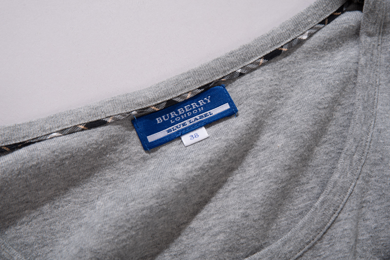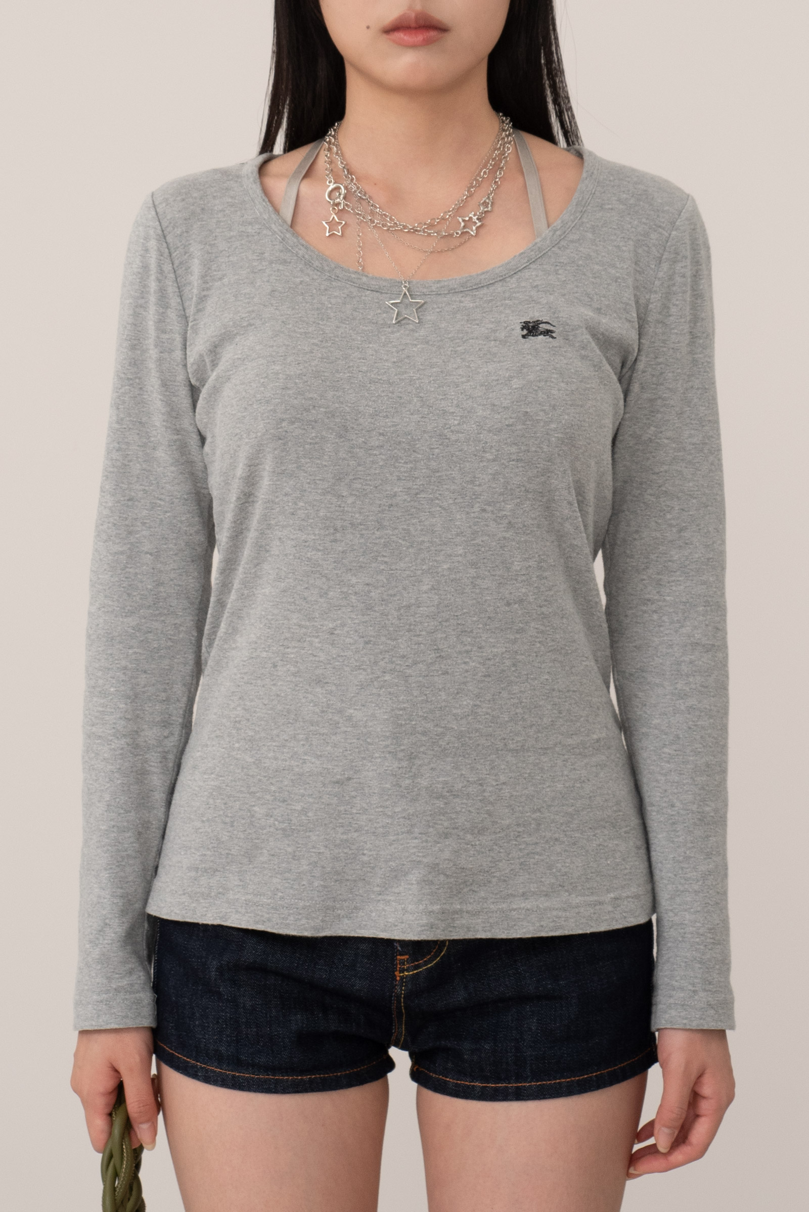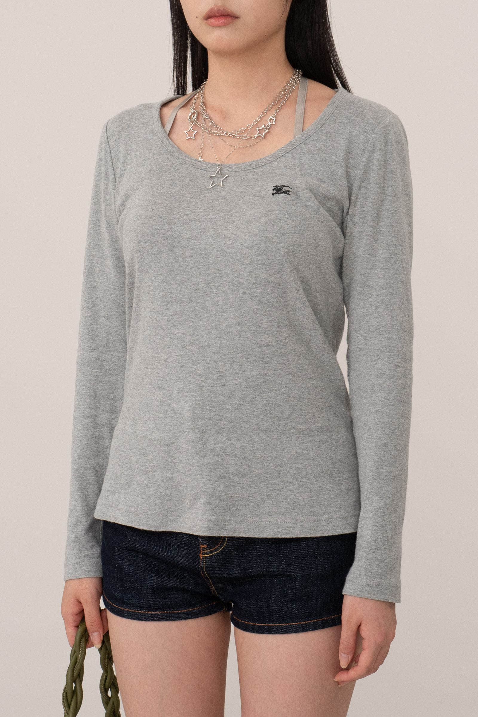 여유 있는 넥 라인에 미니멀하고 깔끔한 디자인, 어깨에는 버버리 특유의 체크무늬가 들어가 있고 가슴의 기수 로고가 눈에 띄네요.