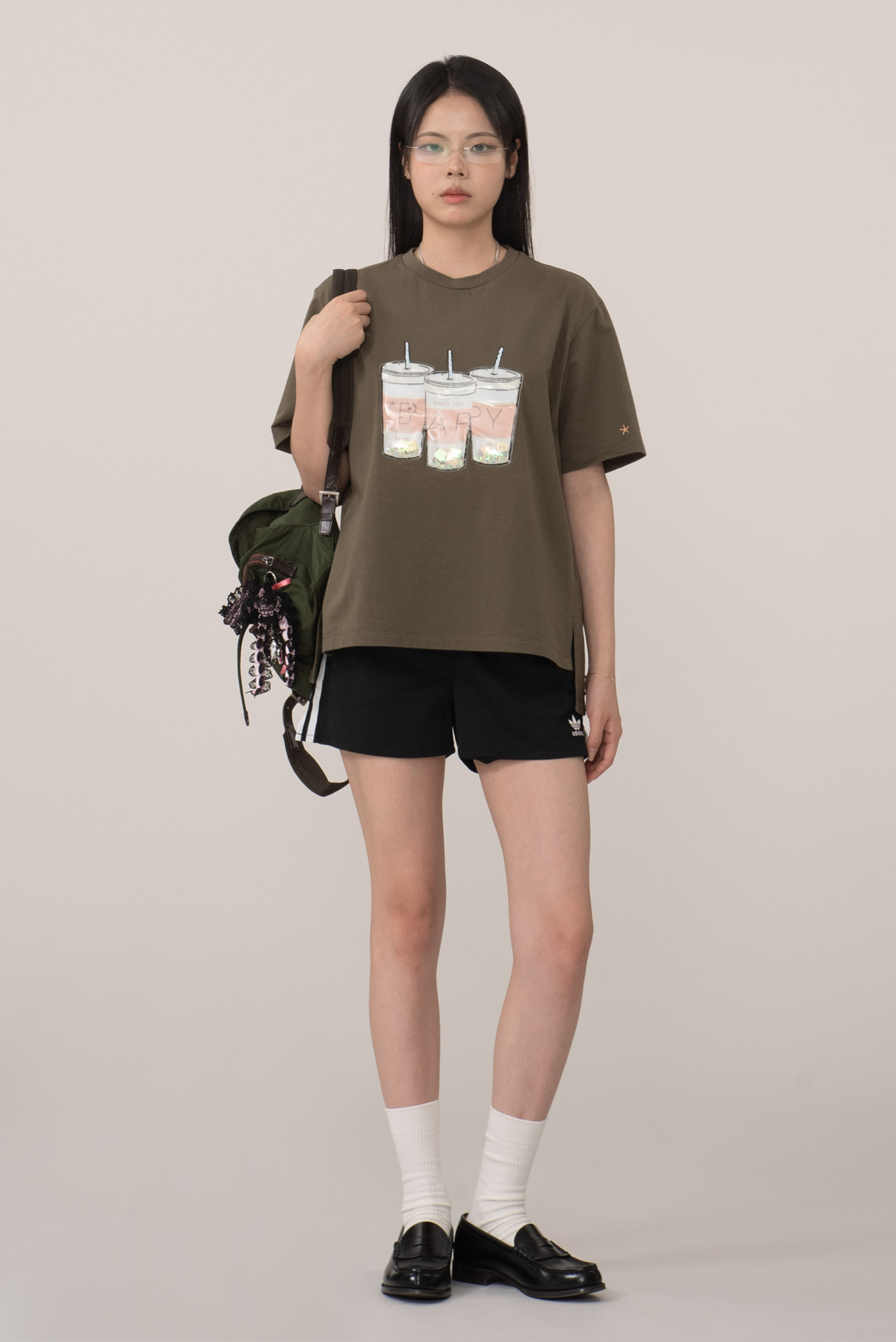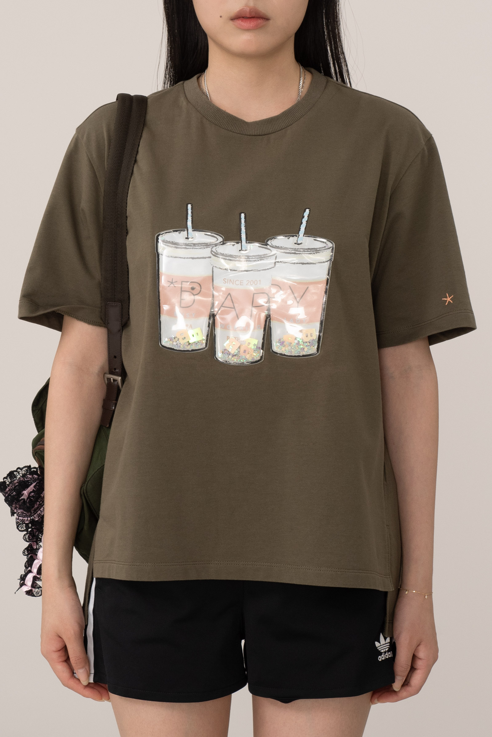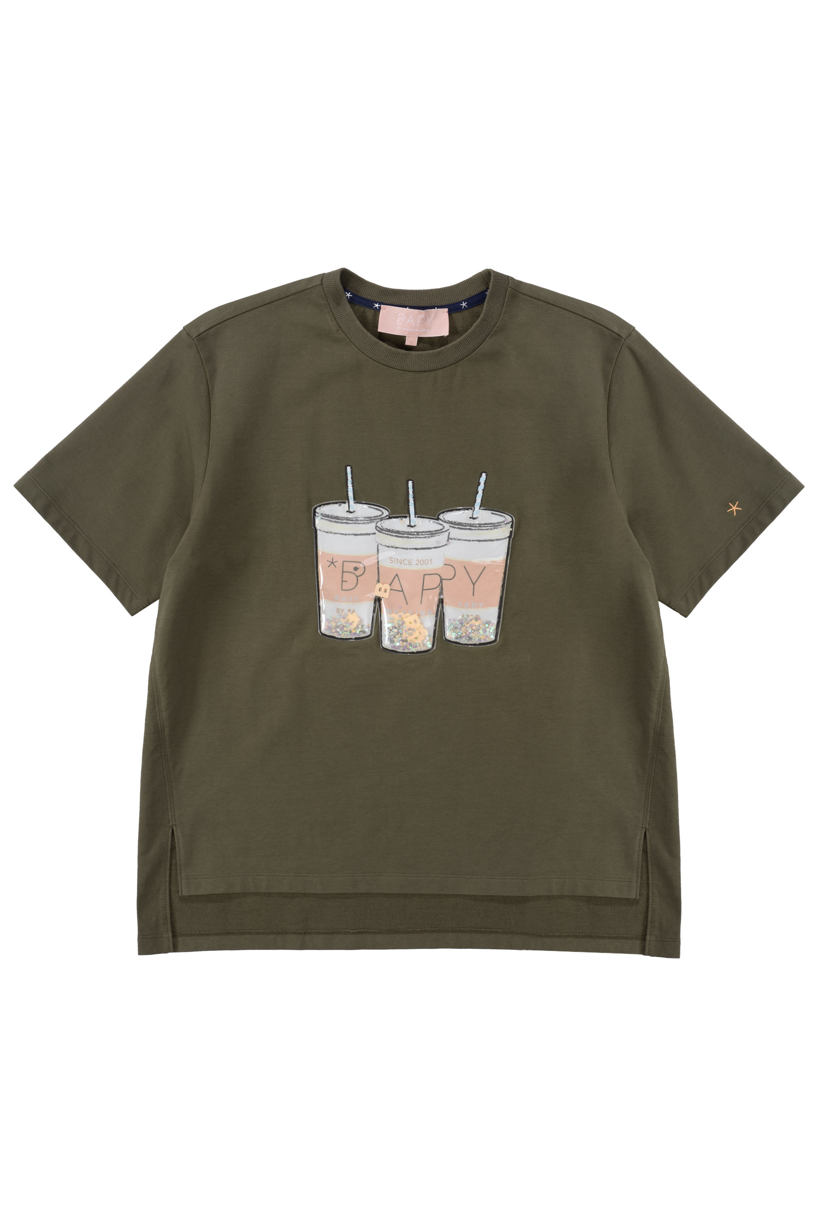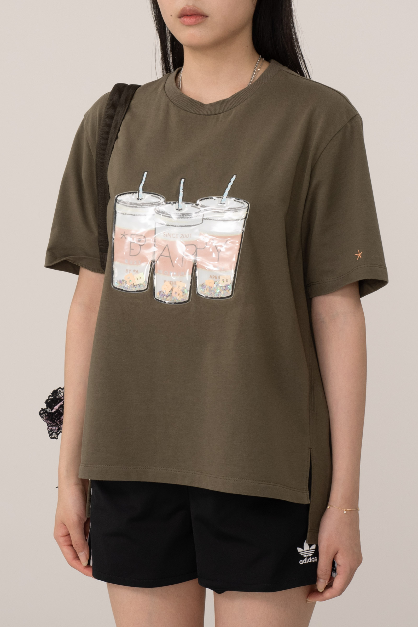 컬러는 카키 컬러로 차분하면서도 자연스러운 빈티지 무드를 잘 살리고 있으며 전면 컵 안에 플라스틱 글리터와 별 모양, BAPY 이니셜이 움직이는 입체적 디자인으로 실제로 손으로 만졌을 때 장난감 같은 촉감과 독특한 비주얼을 주는 게 포인트에요.