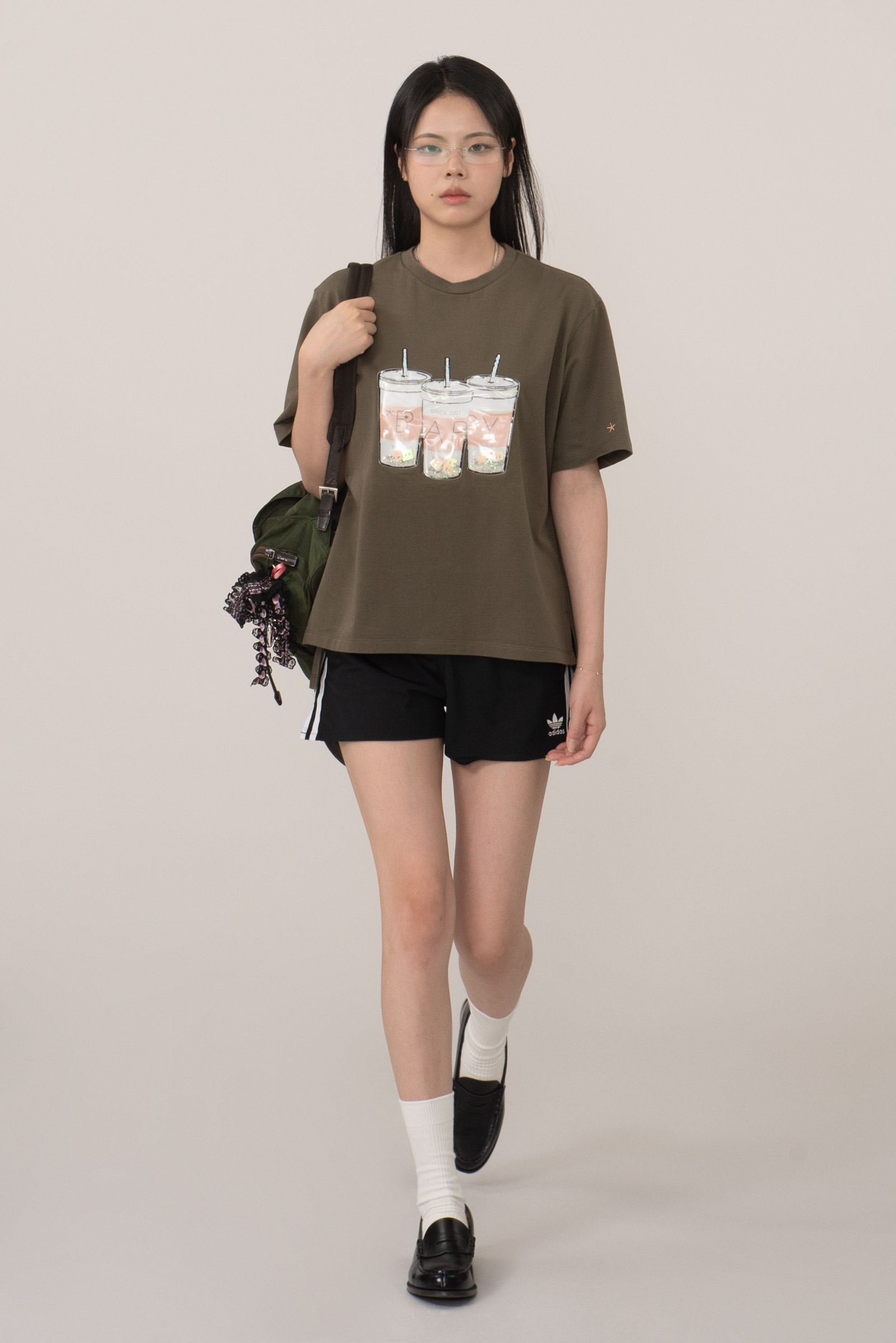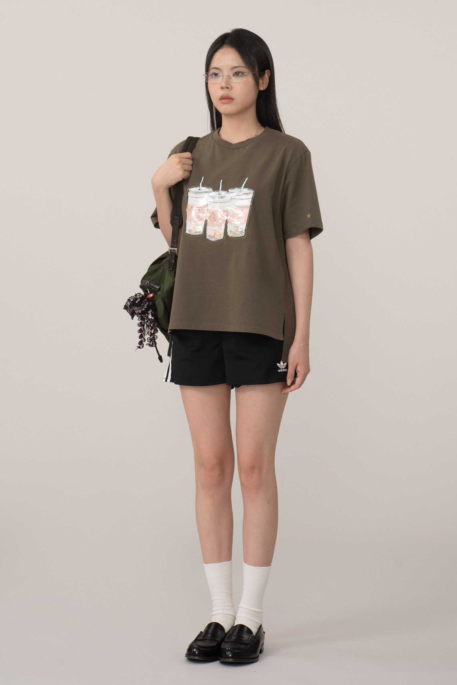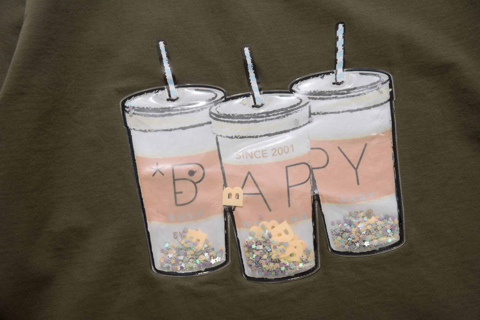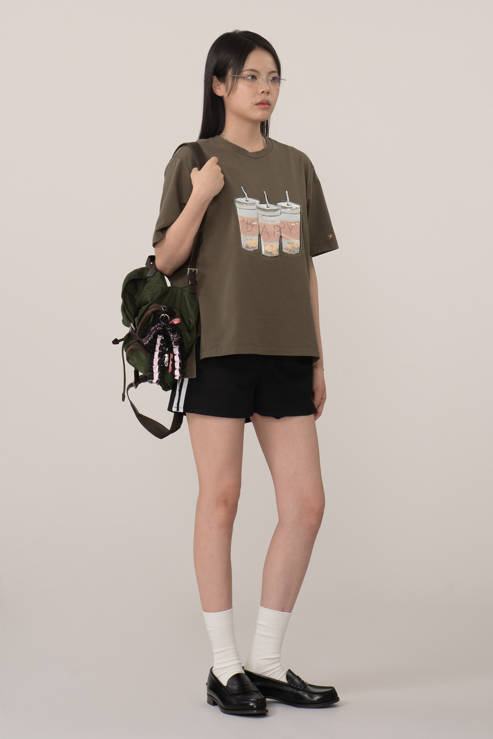 컬러는 카키 컬러로 차분하면서도 자연스러운 빈티지 무드를 잘 살리고 있으며 전면 컵 안에 플라스틱 글리터와 별 모양, BAPY 이니셜이 움직이는 입체적 디자인으로 실제로 손으로 만졌을 때 장난감 같은 촉감과 독특한 비주얼을 주는 게 포인트에요.