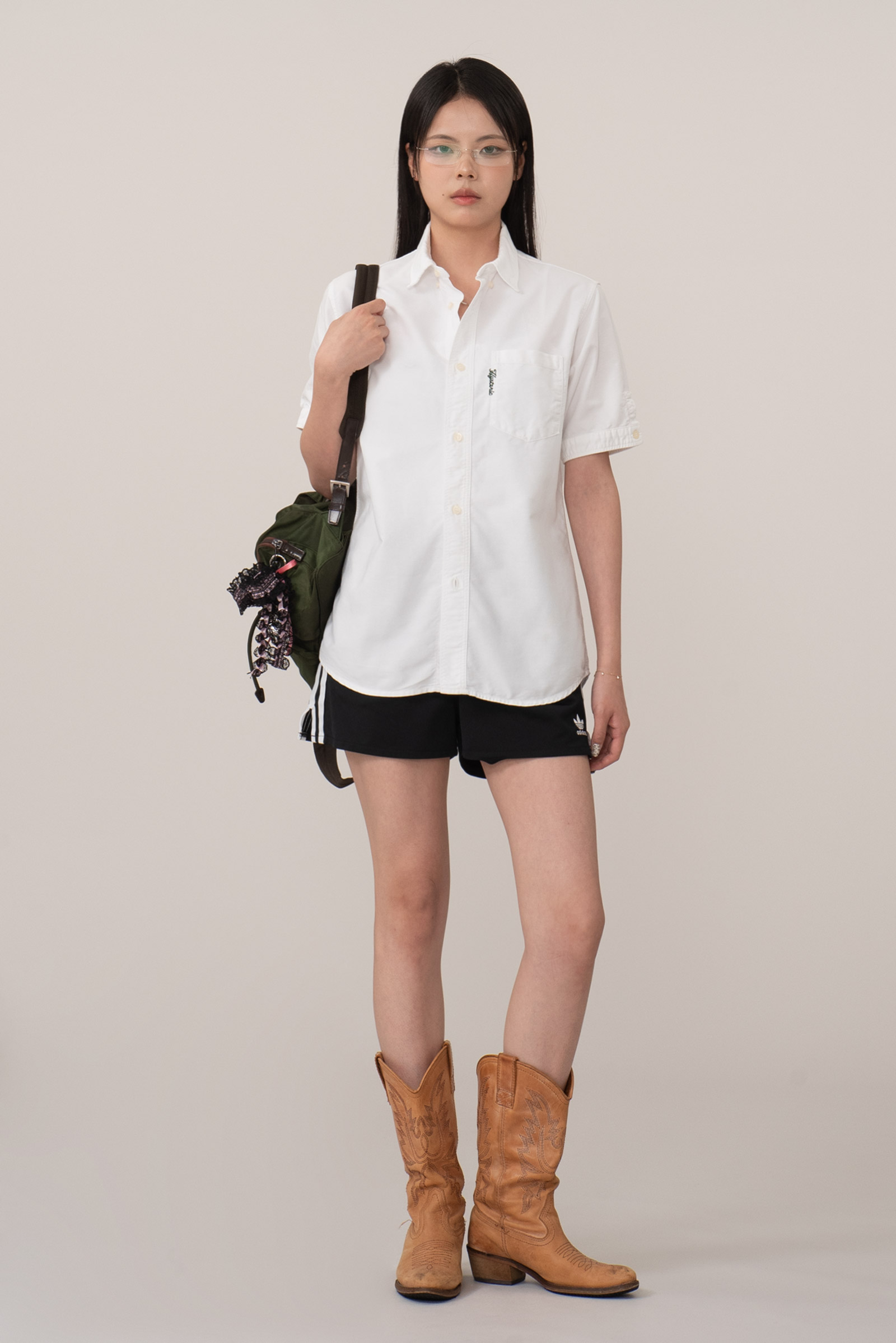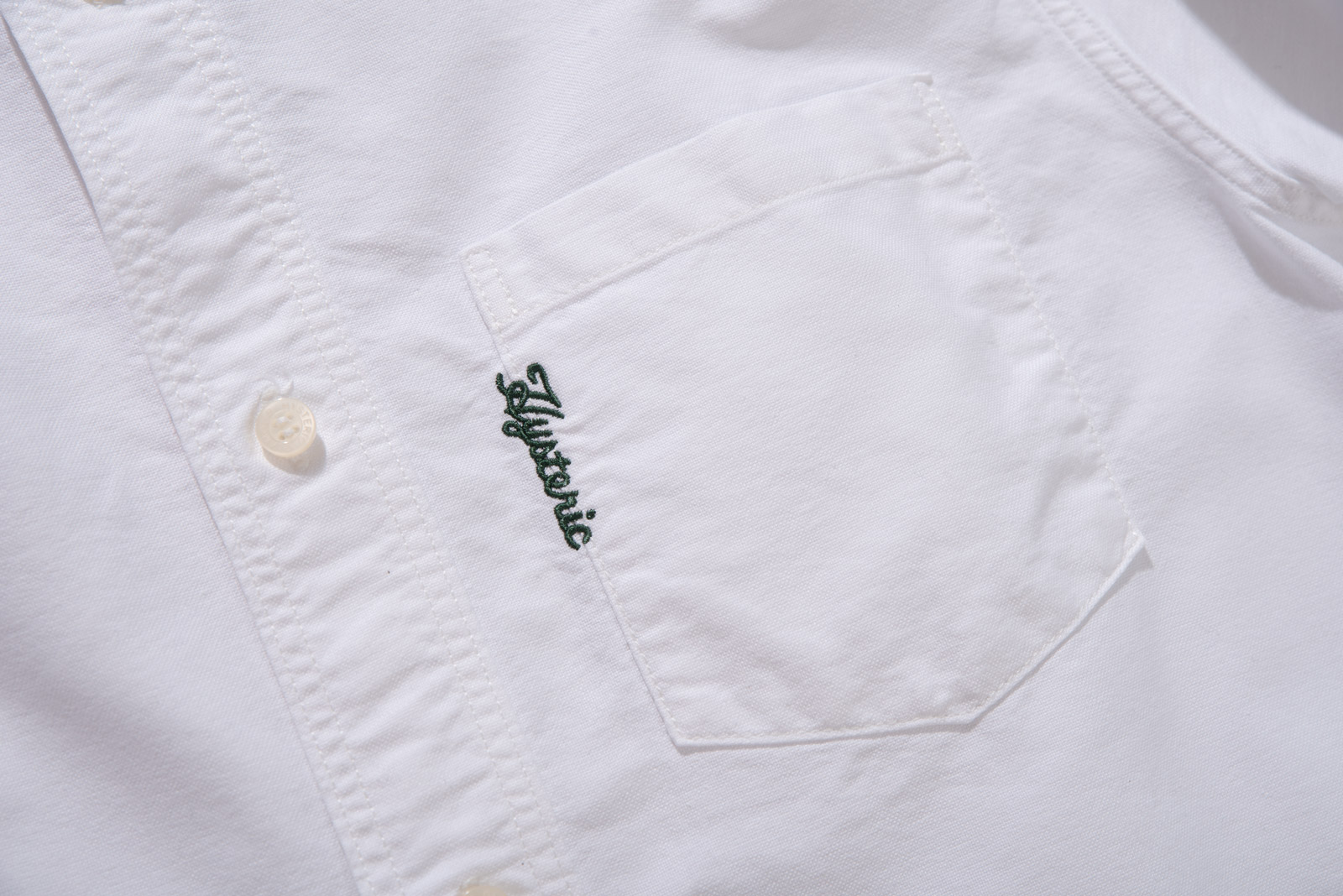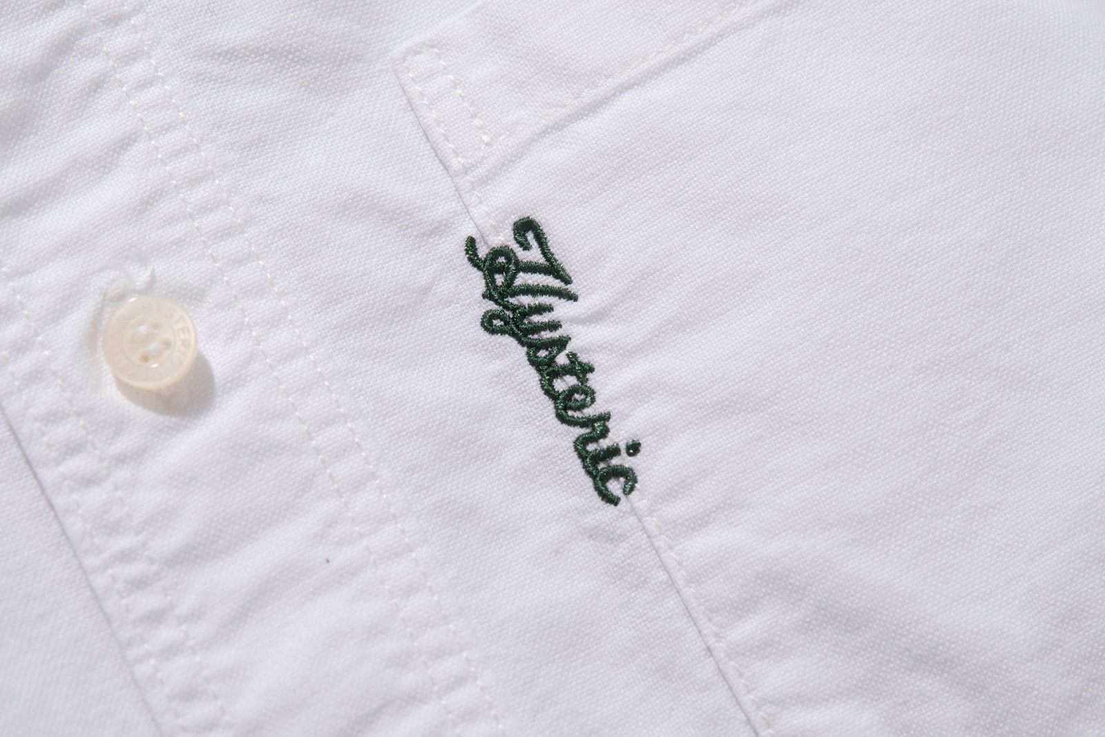 오늘 소개해 드리는 제품은 반소매 버튼다운 셔츠로, 깨끗하고 선명한 화이트 컬러와 더불어 프론트 포켓 위에 다크 그린 자수 로고, 셀비지 마감 등 반항적이고 개성 있는 기존의 히스테릭글래머와는 다르게 단정하고 심플한 옥스포드 셔츠인데요.