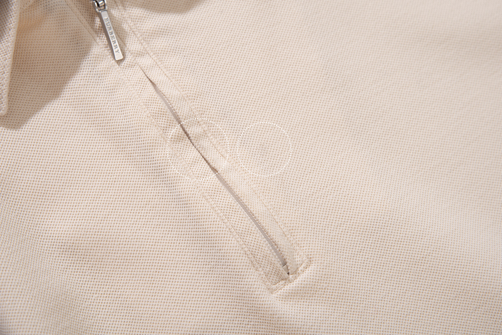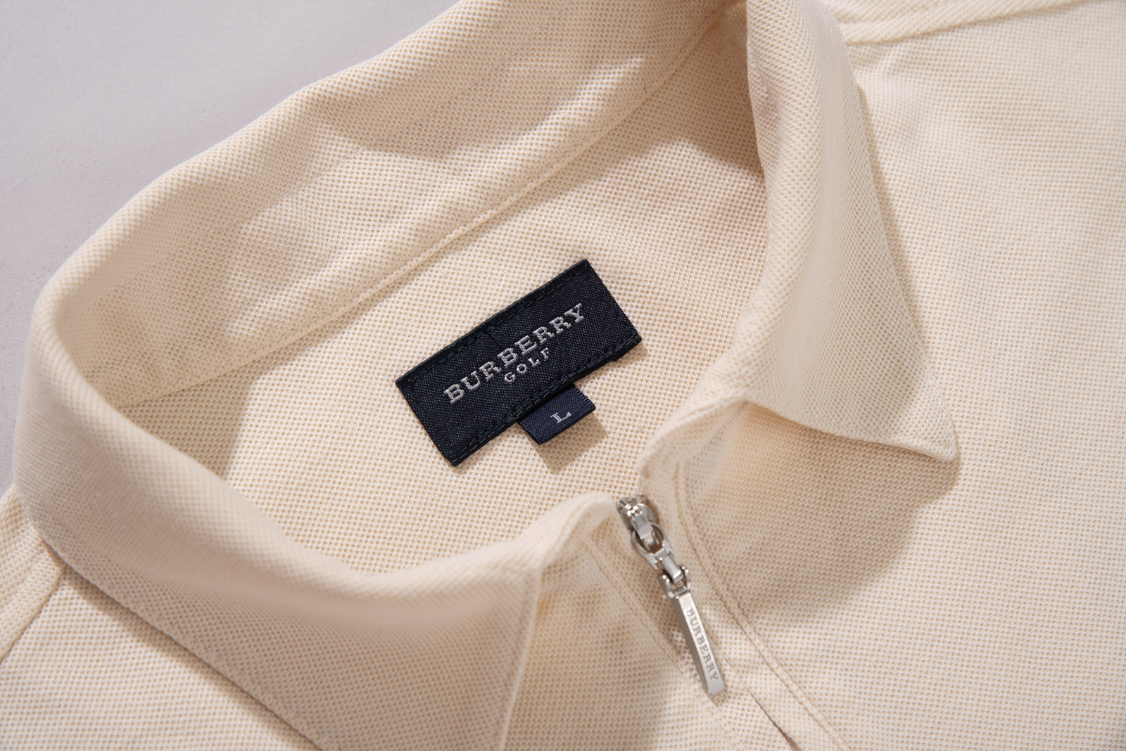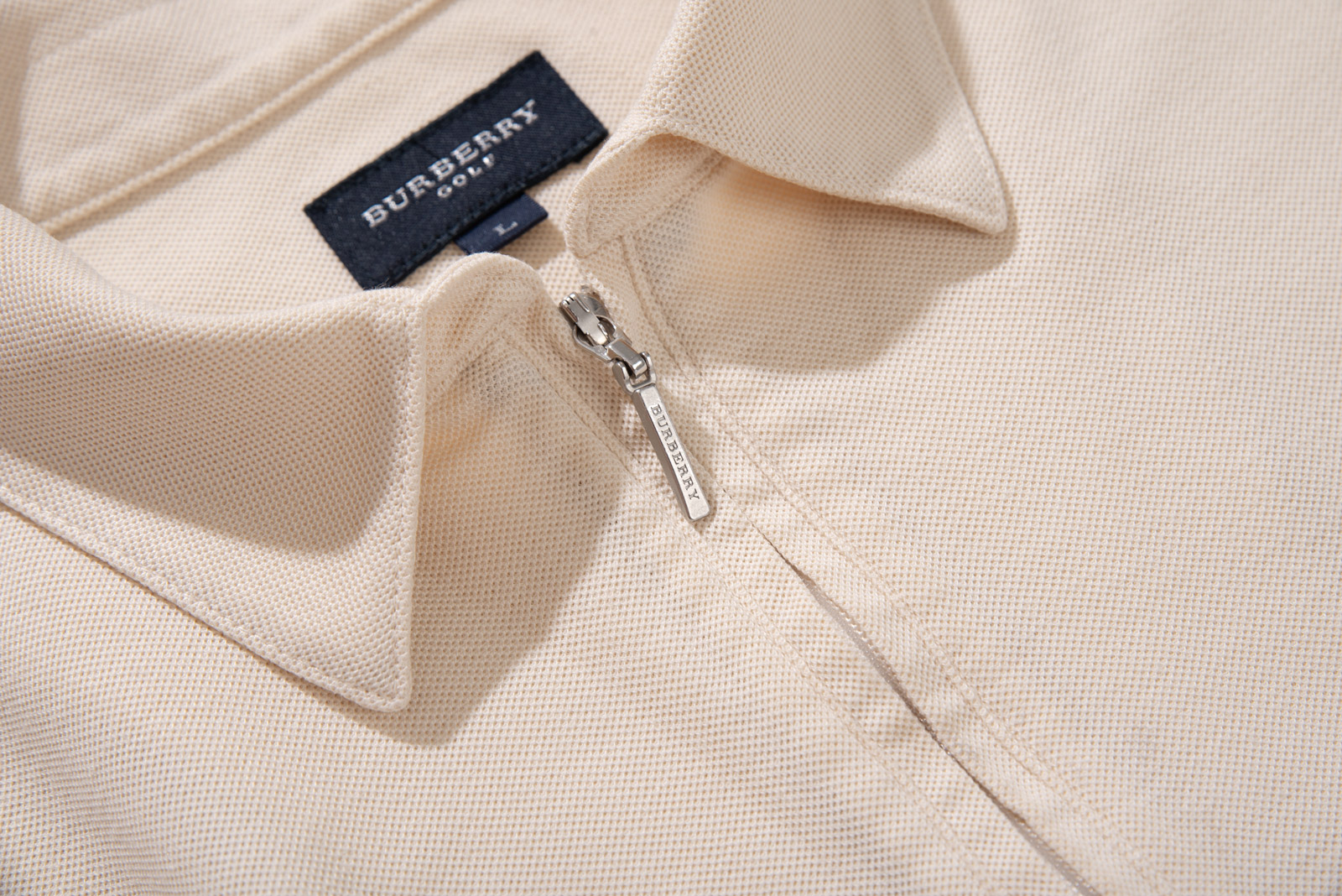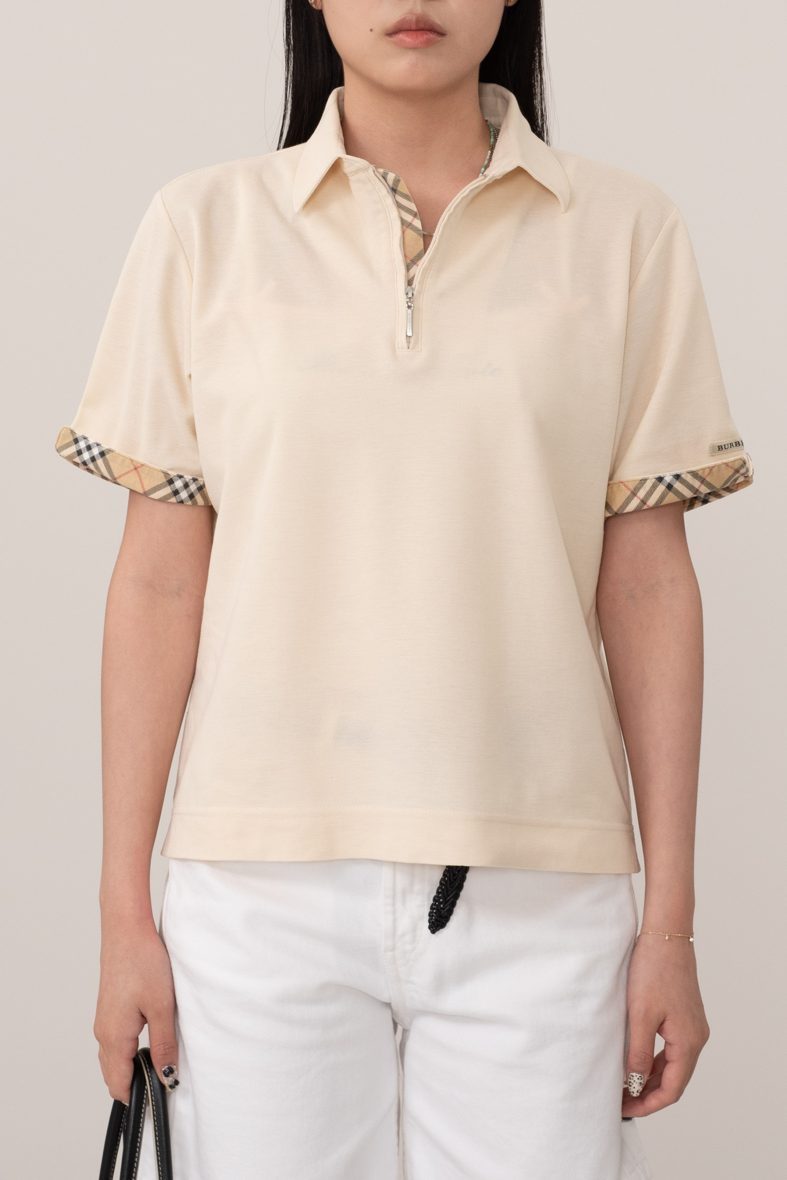 따뜻한 아이보리 컬러에 스포티한 느낌의 하프 집, 소매에는 버버리 시그니처인 노바 체크와 버버리 태그가 부착되어 있네요.