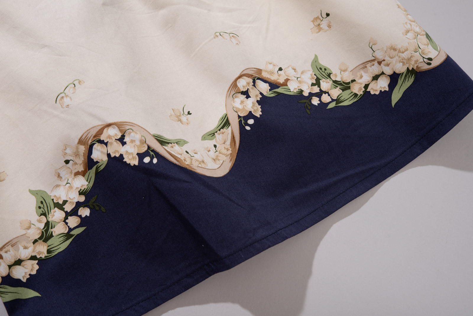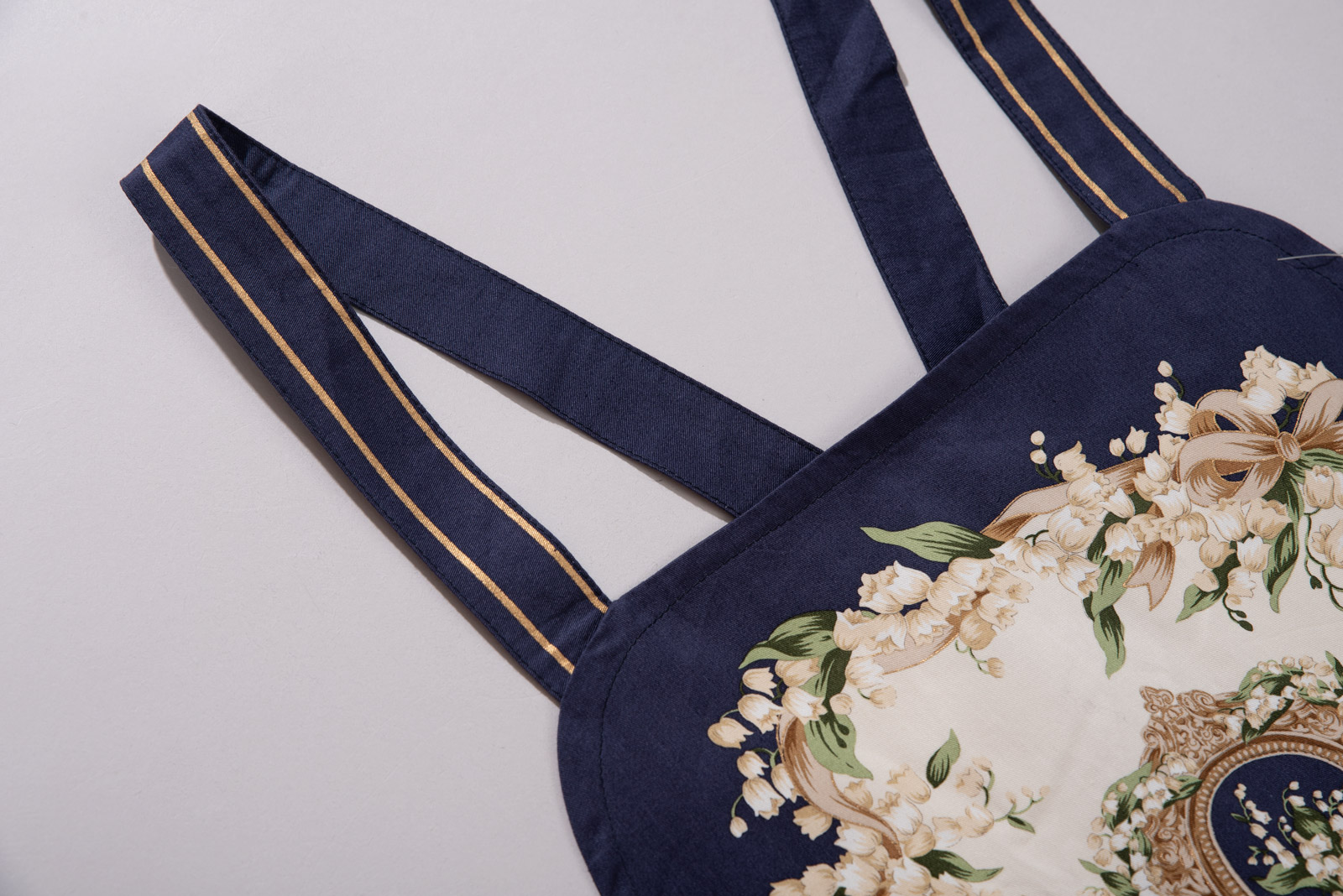 전체적으로 귀족적이면서도 부드러운 분위기를 주는 은방울꽃 프린트와 전통적인 메달리온 장식이 조화를 이루고 뒷면 X자 스트랩과 리본 디테일로 기능성과 아름다움을 동시에 표현했네요.