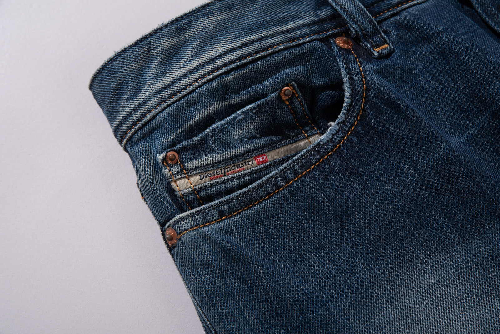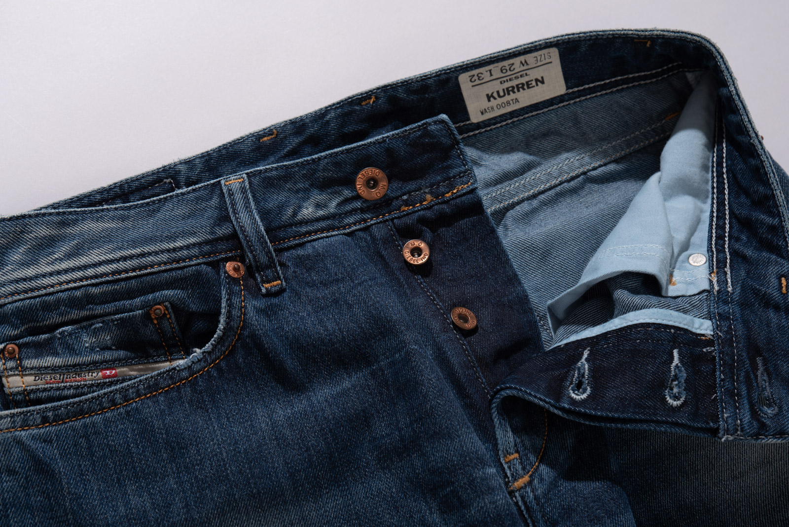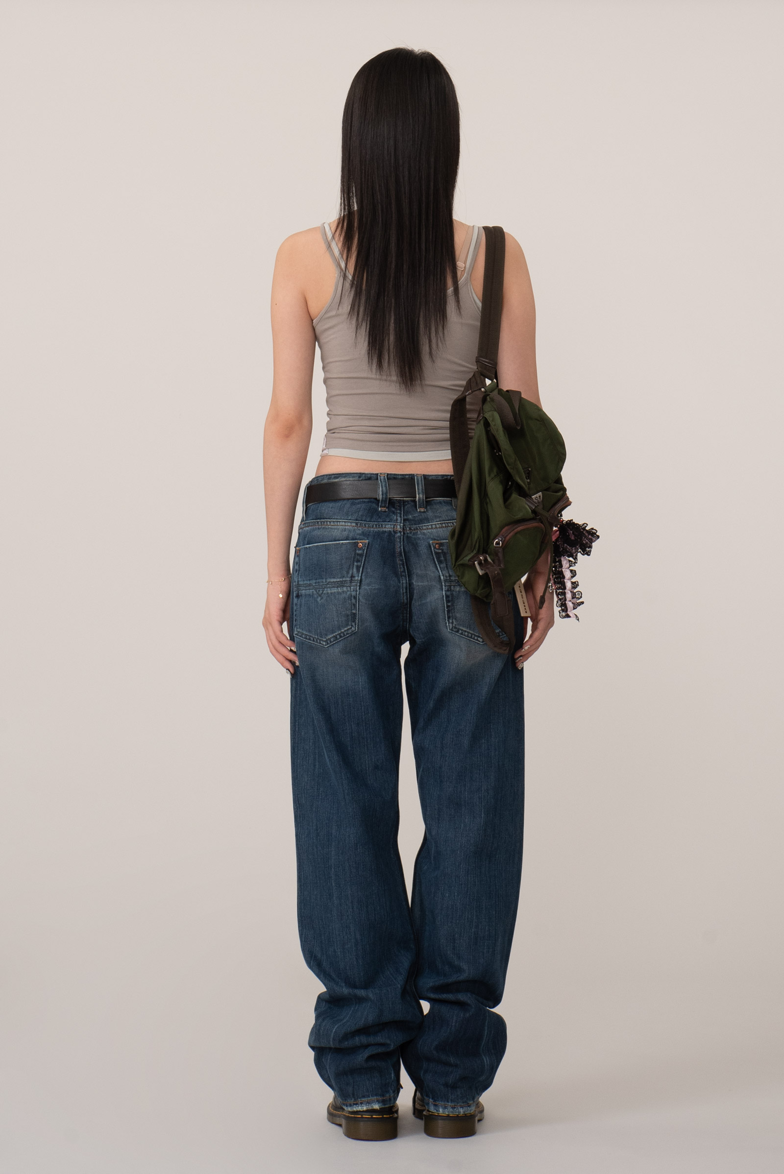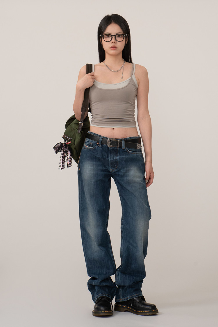 중청에 가까운 컬러와 자연스러운 워싱, 그리고 2000년대 유행했던 벌키하고 루즈한 스트레이트 실루엣이 특징이며 프론트 리벳, 버튼 플라이, 백 포켓의 입체적인 스티치 등 당시 디젤 특유의 디테일이 그대로 살아있네요.
