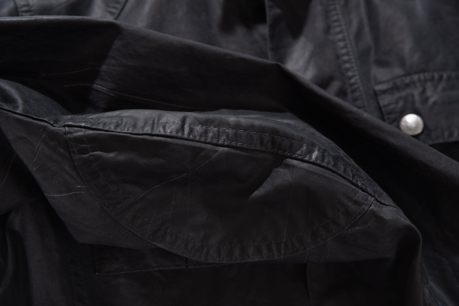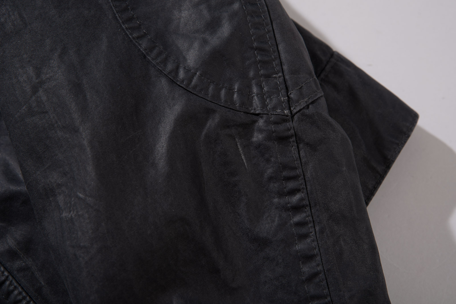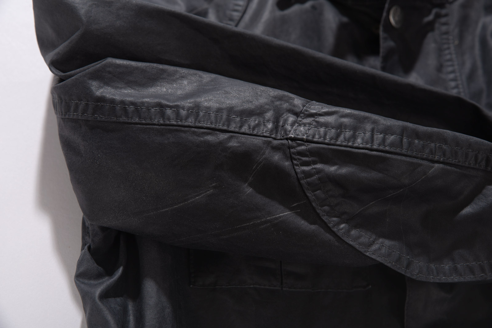 왁스 코튼 소재 특유의 방수성과 바람막이 기능이 있지만 현재는 세탁을 거쳐 표면 왁스감은 은은한 광택과 질감, 그리고 왁스 냄새 정도만 남아 있는 상태이며 다시 왁스 리프레쉬를 하면 왁스 재킷의 깊은 질감과 방풍 효과, 그리고 빈티지한 분위기를 다시 살려 착용하실 수 있답니다.