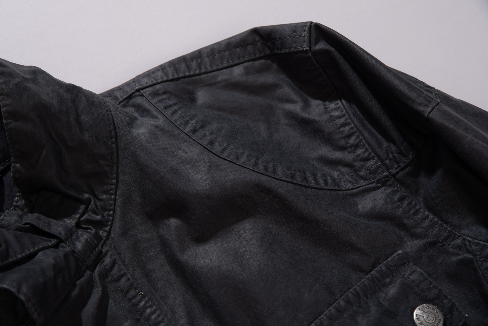 오늘 소개해 드리는 피스 역시 클래식 벨스타프 디자인답게 하이넥 버클 칼라와 체스트 포켓, 슬랜트형 지퍼 포켓, 허리 벨트, 소매와 어깨의 패널 디테일이 모두 적용되어 있네요.
