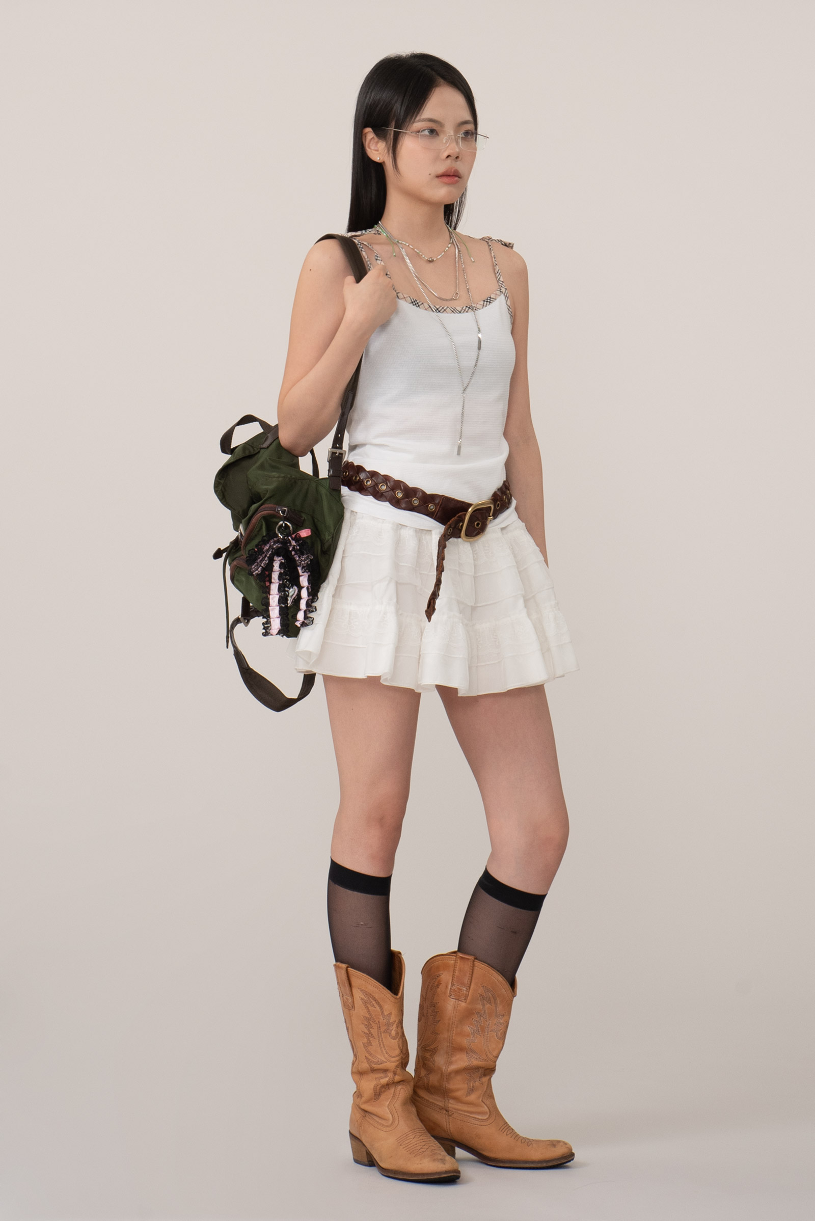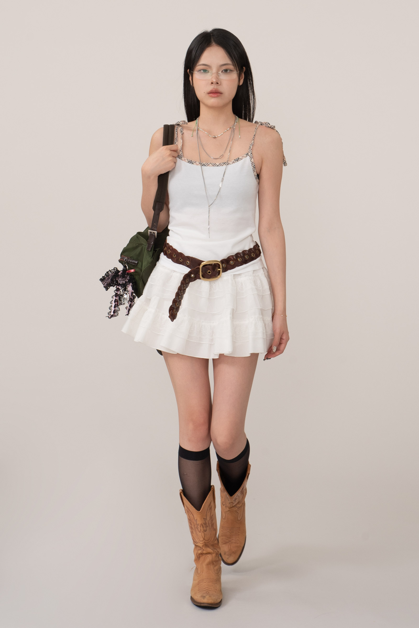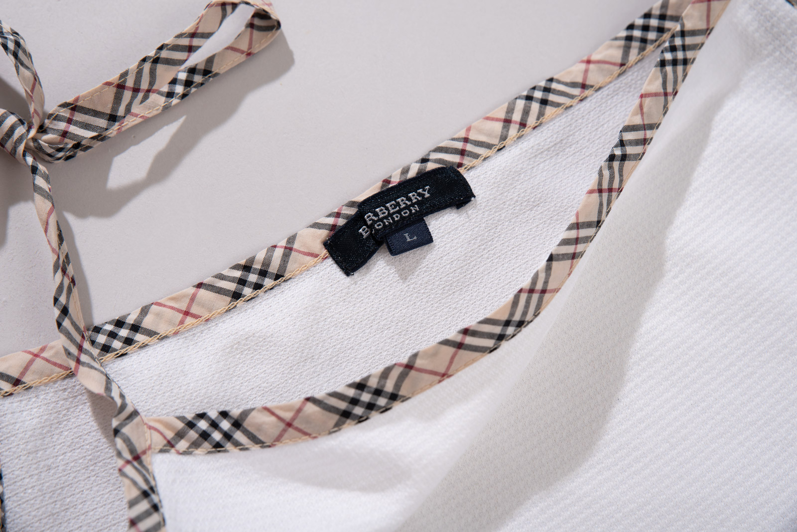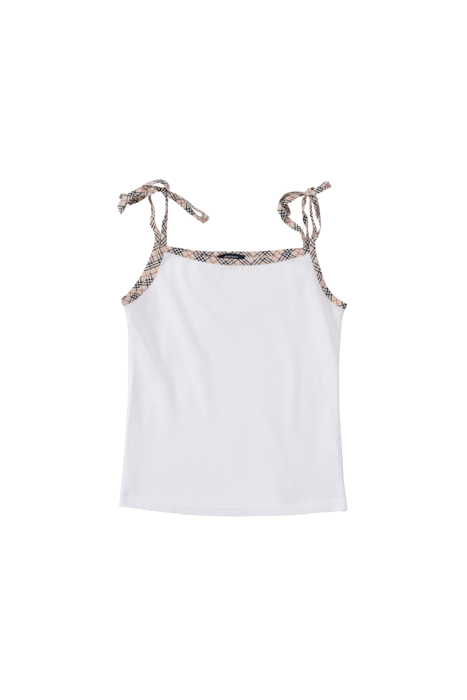 맑은 화이트 컬러, 버버리 시그니처 체크 패턴이 돋보이는 어깨 리본 디테일과 암홀, 가슴의 바이어스가 매력적인 피스인데요.