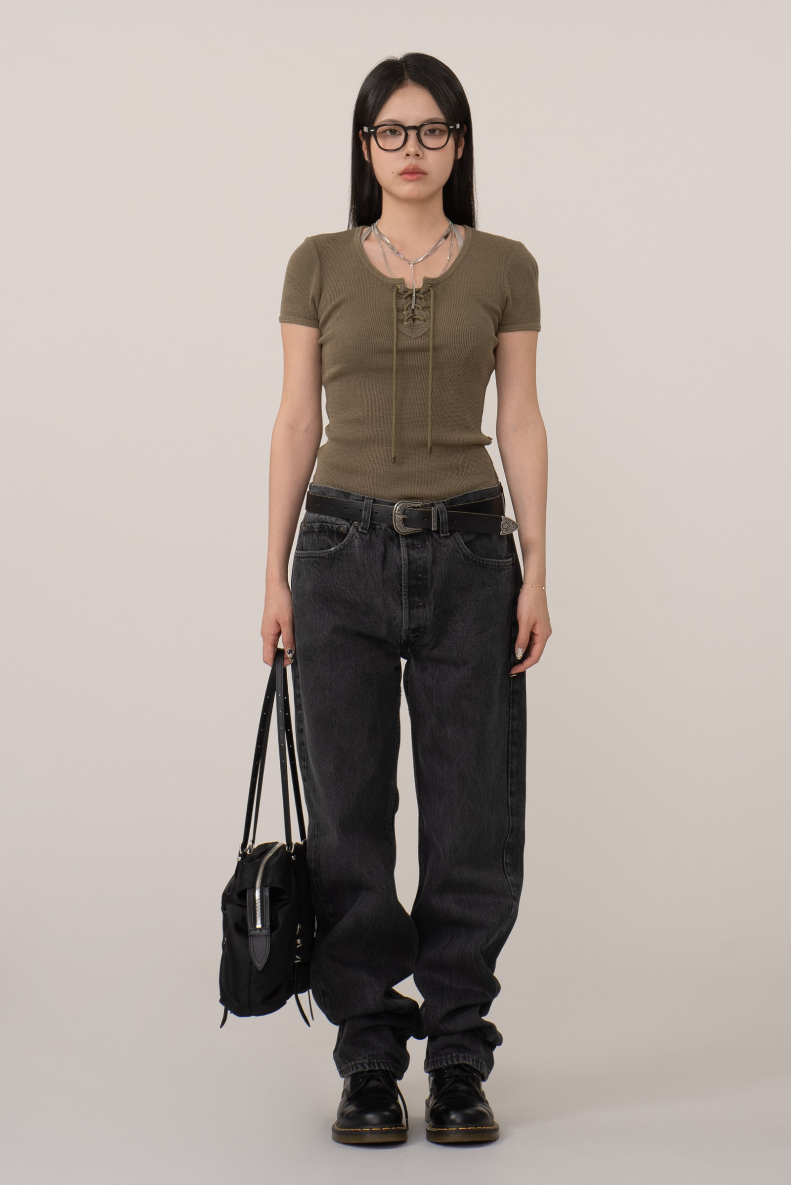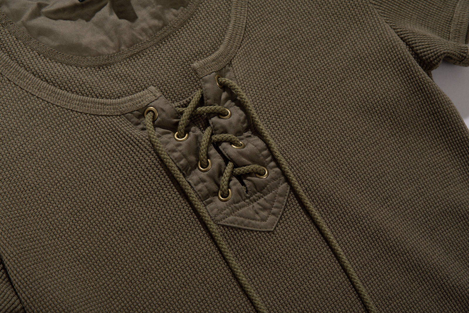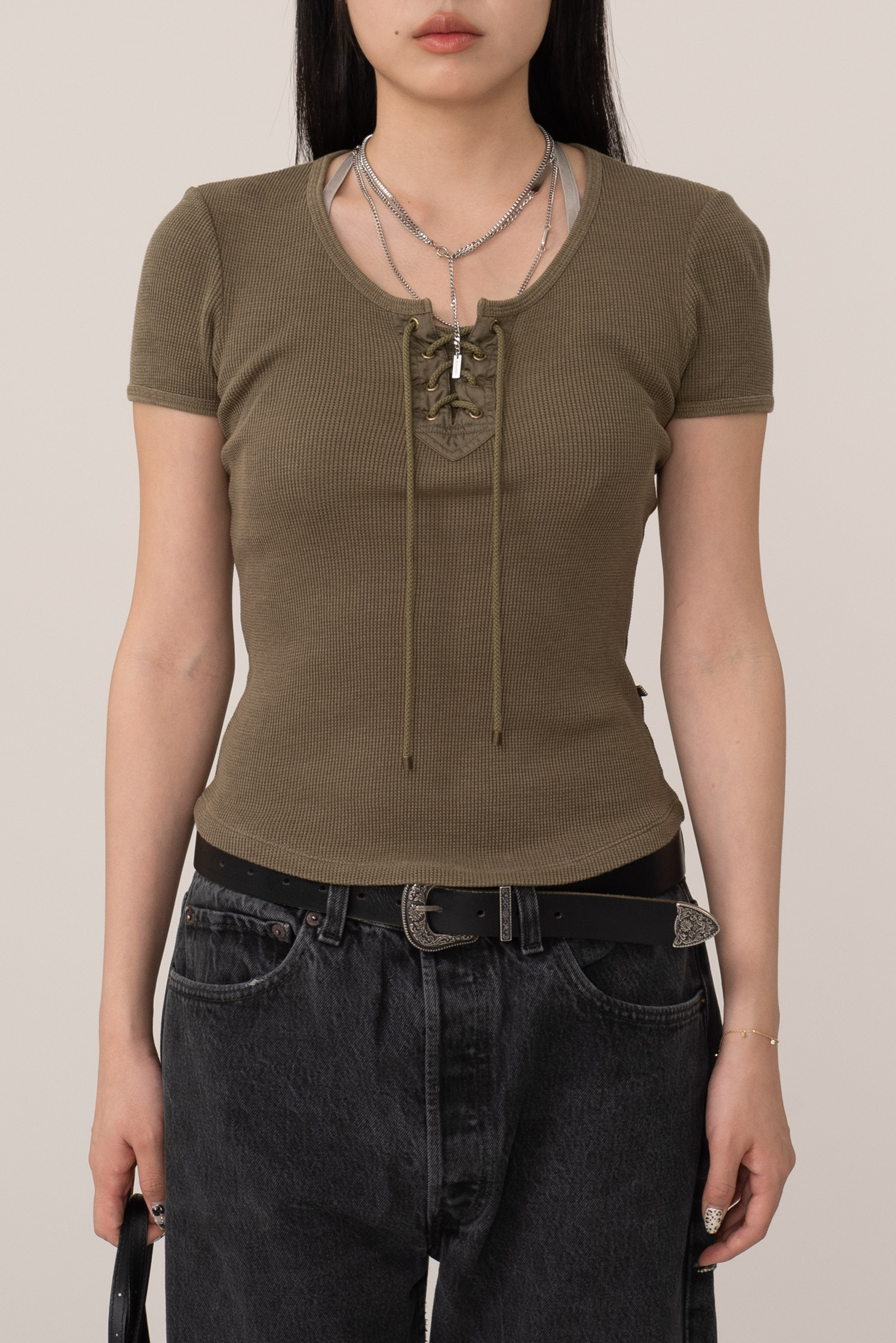 카키 컬러, 레이스업 헨리넥 반팔 디자인에 밀리터리 감성이 결합되어 좀 더 캐주얼한 스타일인데요.