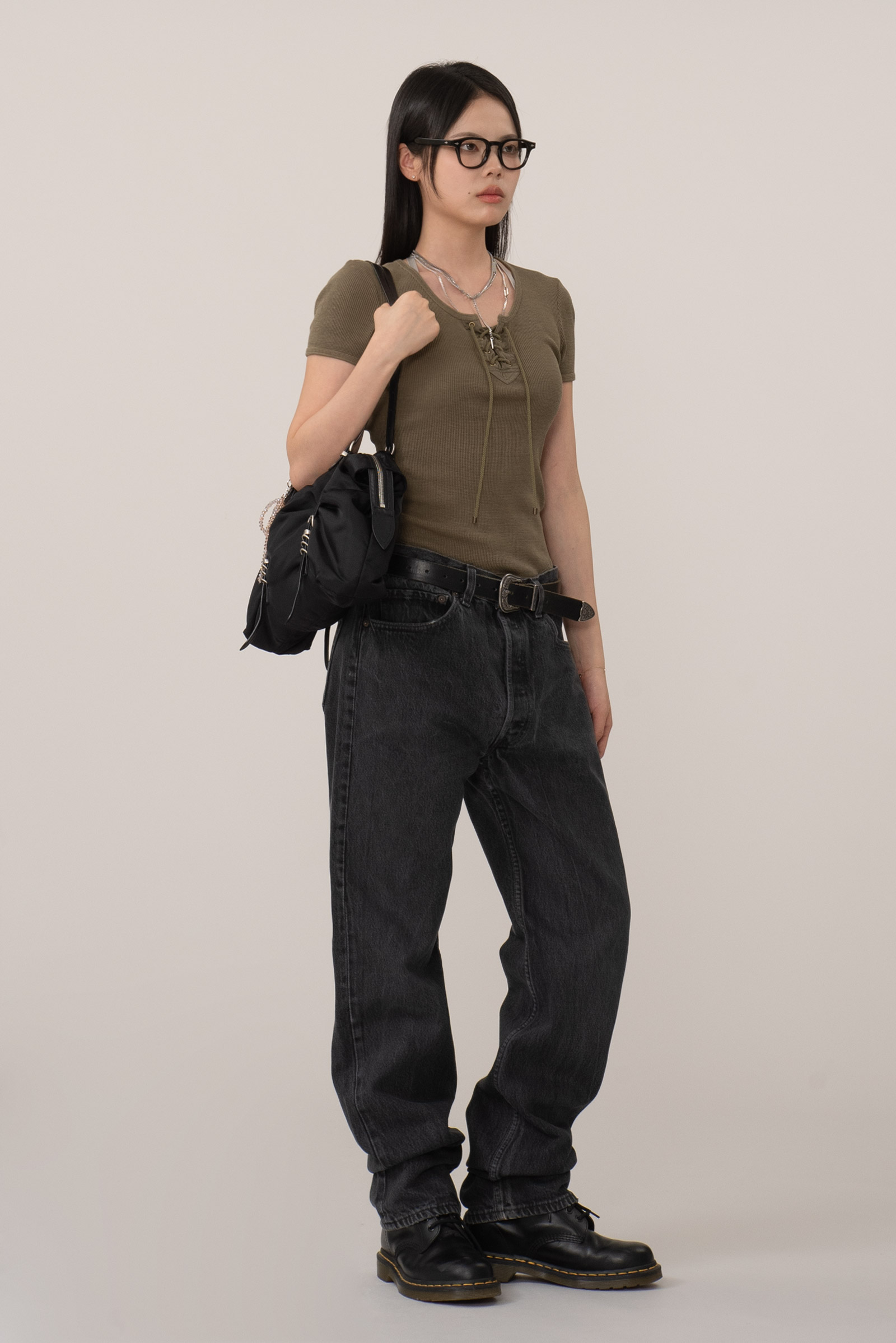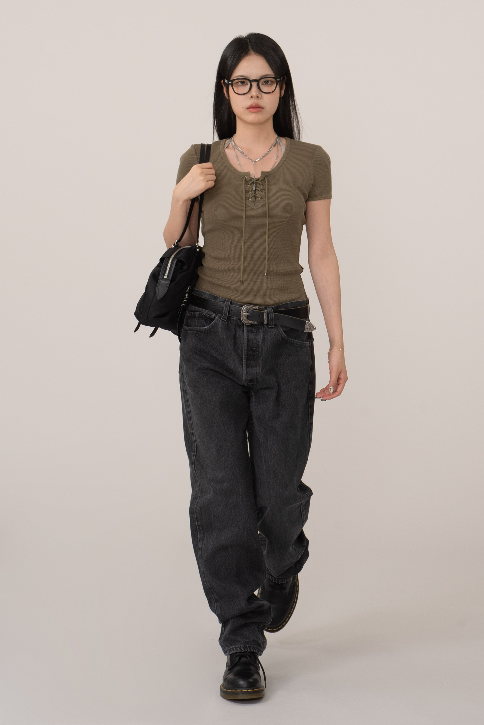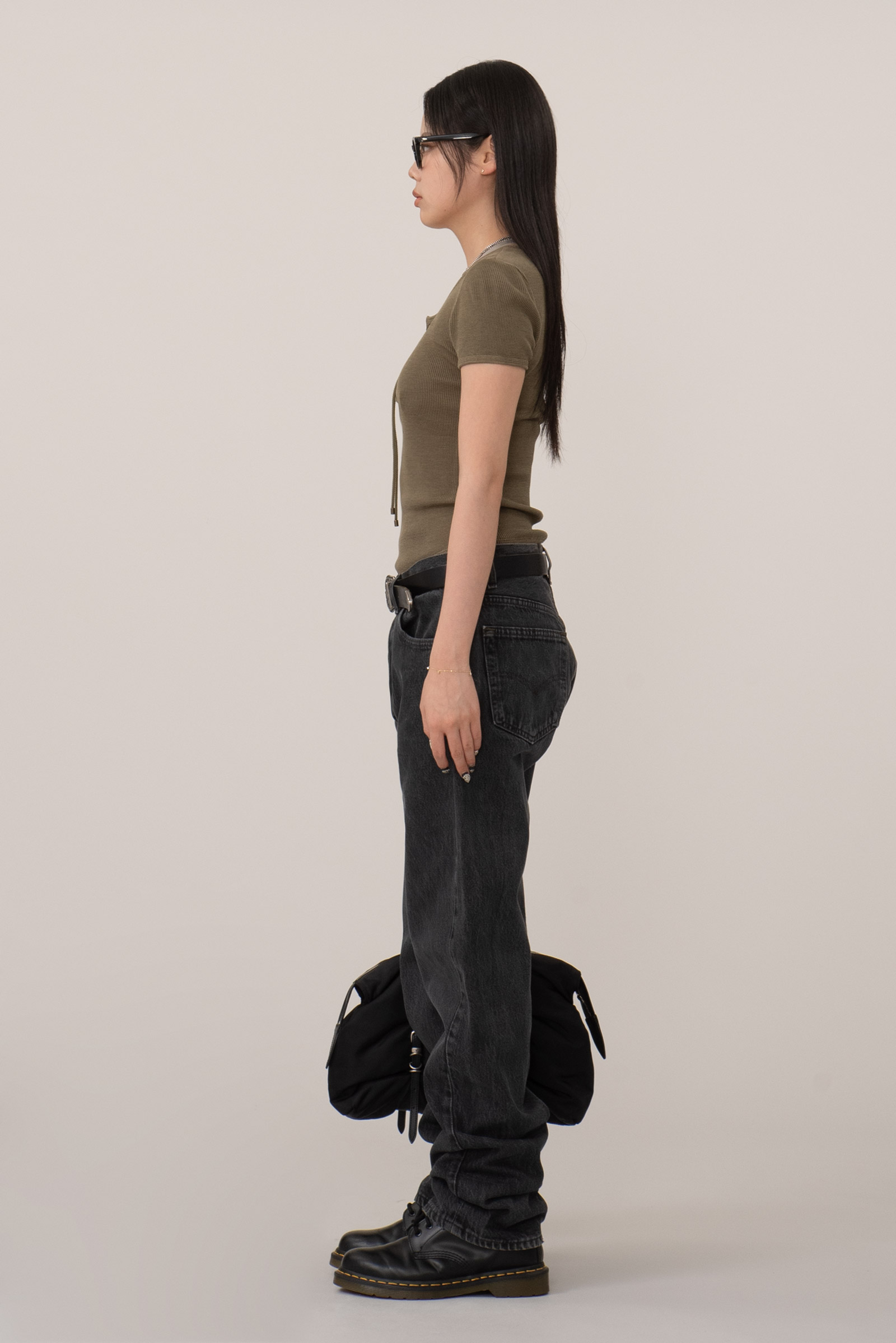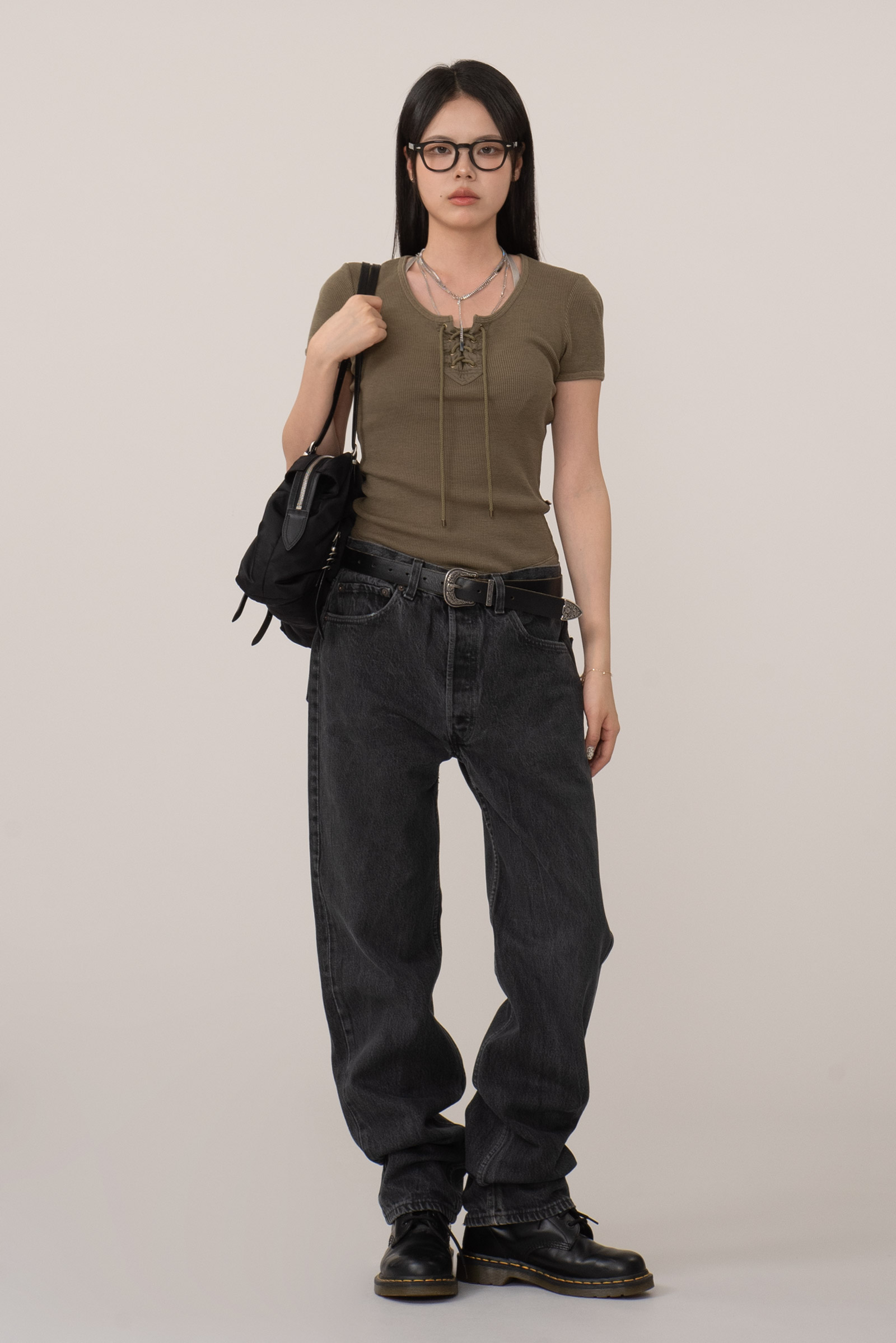 카키 컬러, 레이스업 헨리넥 반팔 디자인에 밀리터리 감성이 결합되어 좀 더 캐주얼한 스타일인데요.