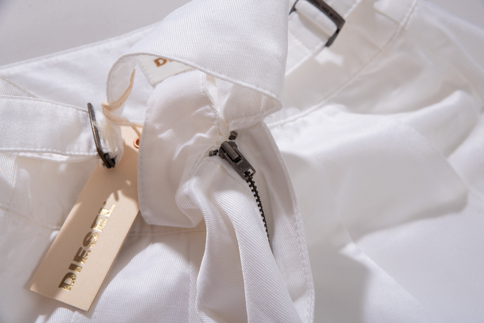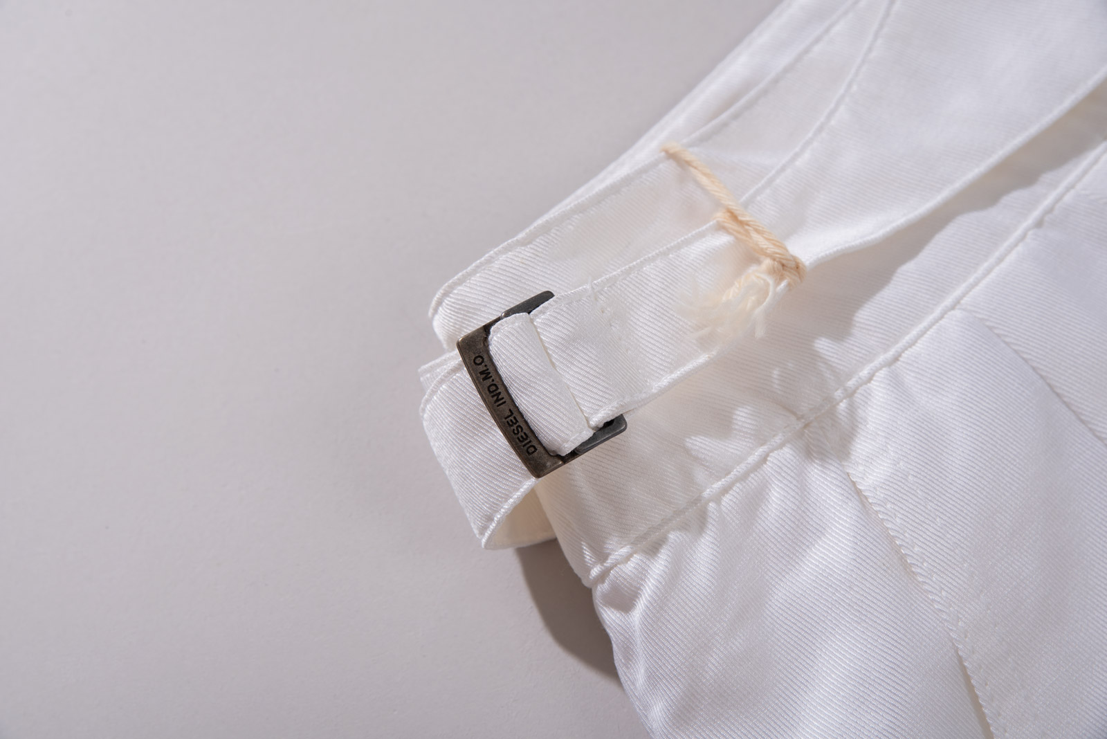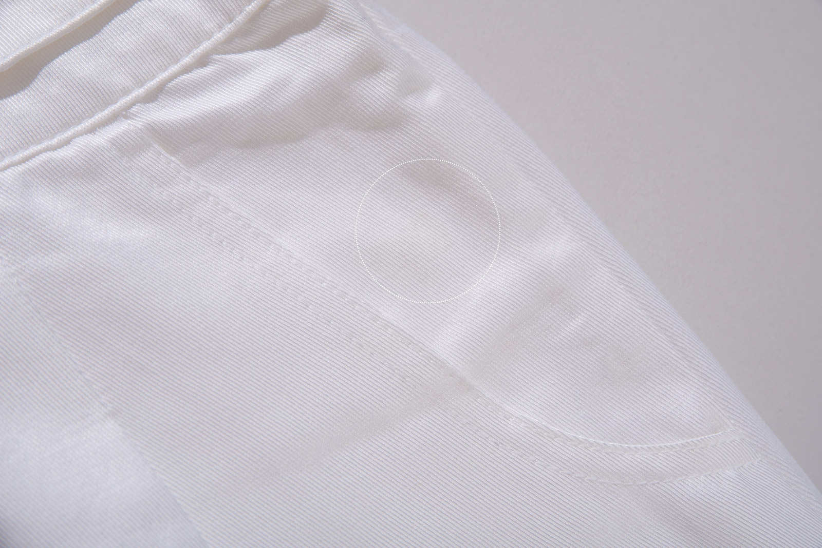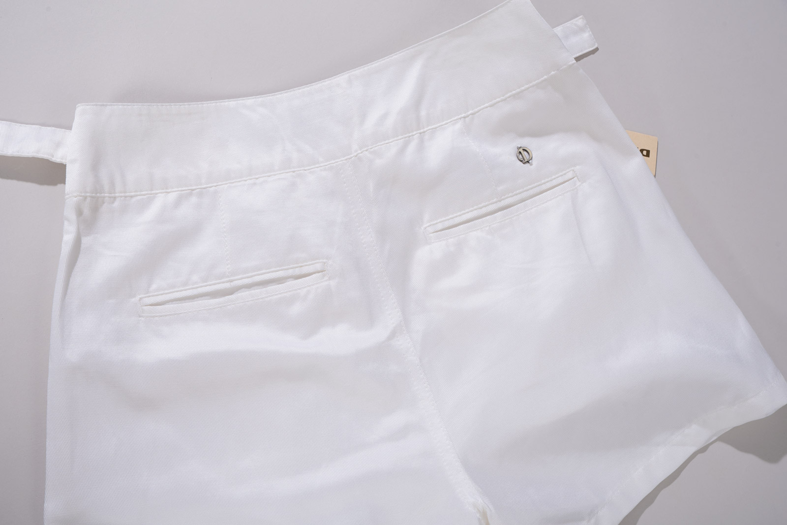 전형적인 카키나 베이지 대신 화이트 컬러를 적용해 여름 시즌 리조트 룩이나 도회적인 셋업 스타일에 이상적인 아이템이에요.
