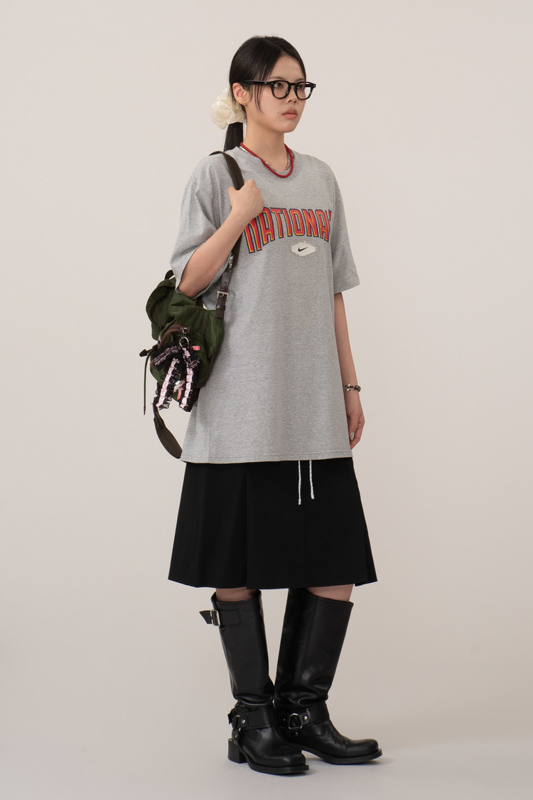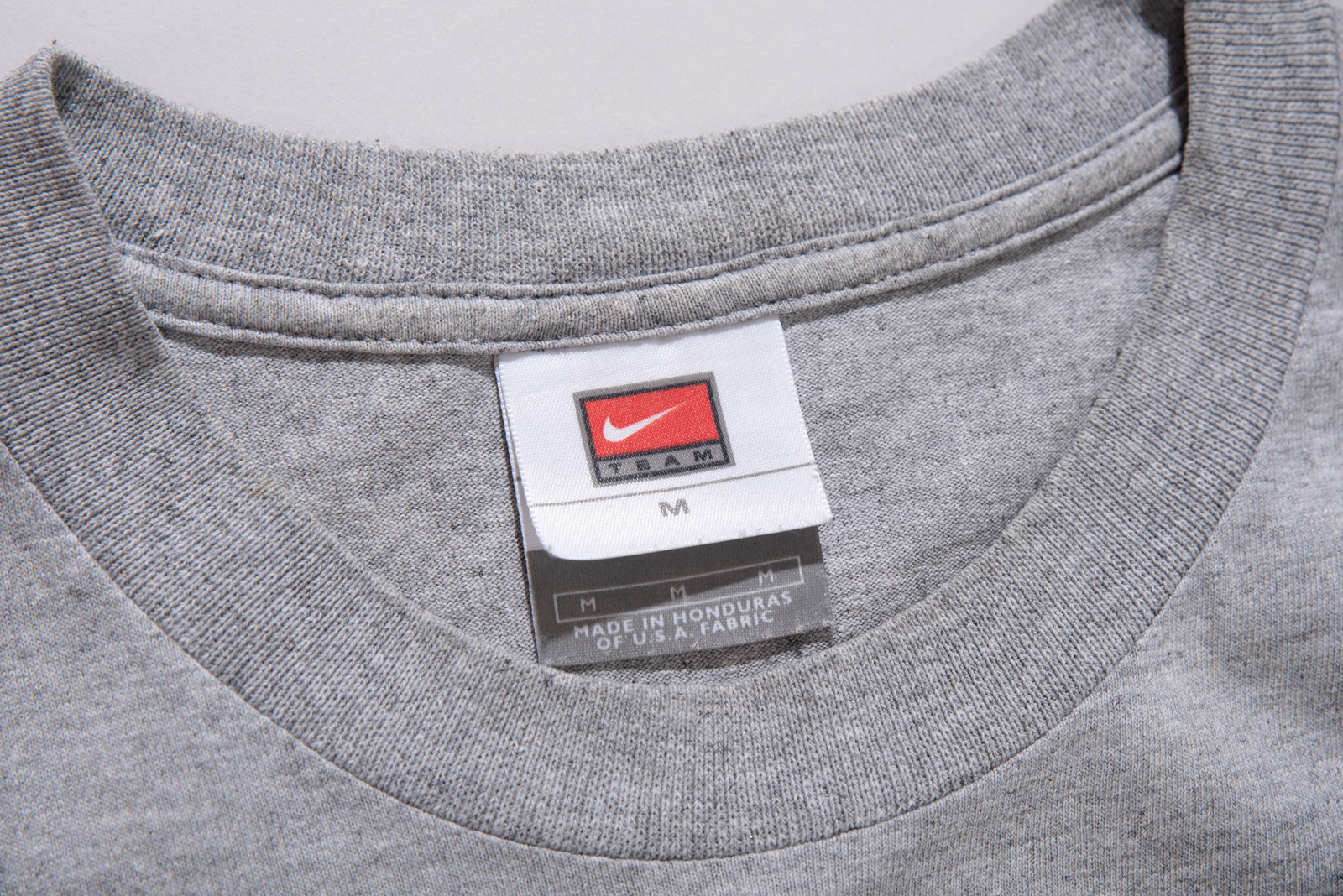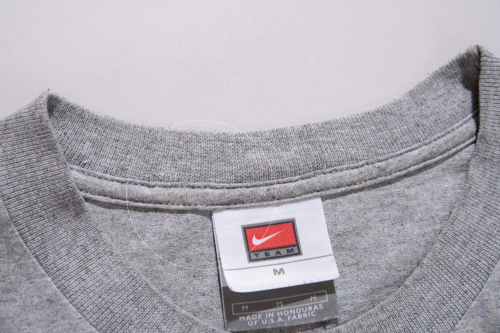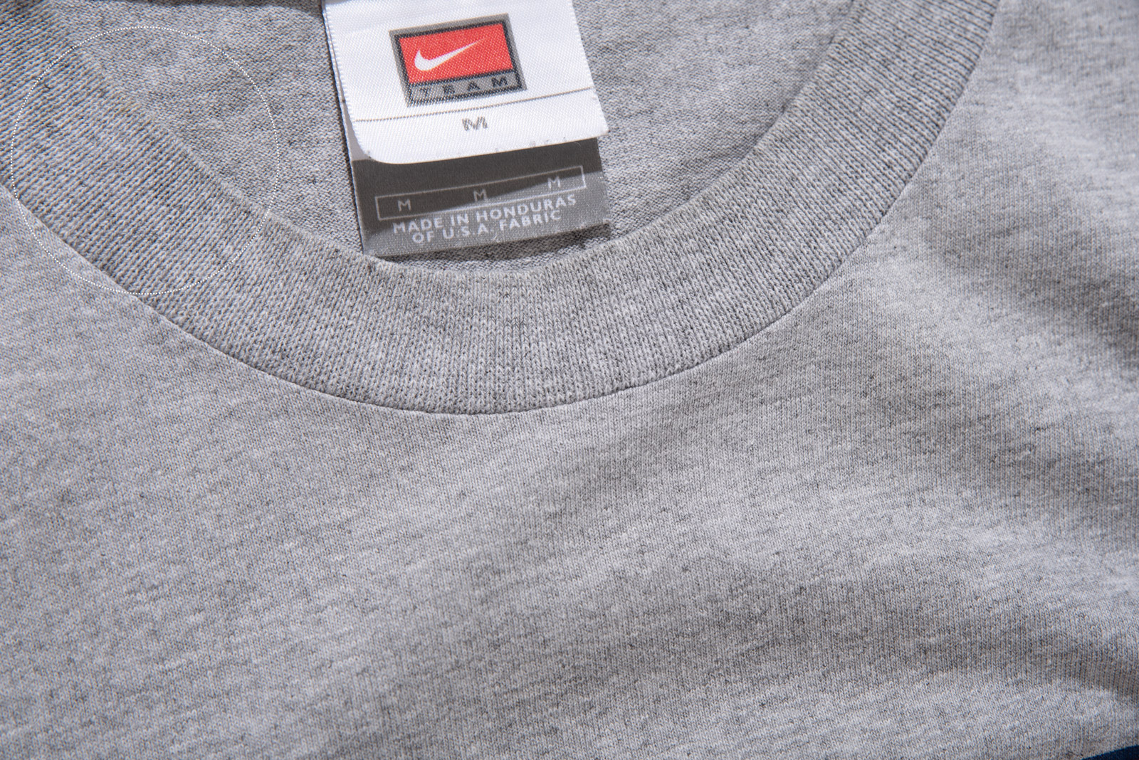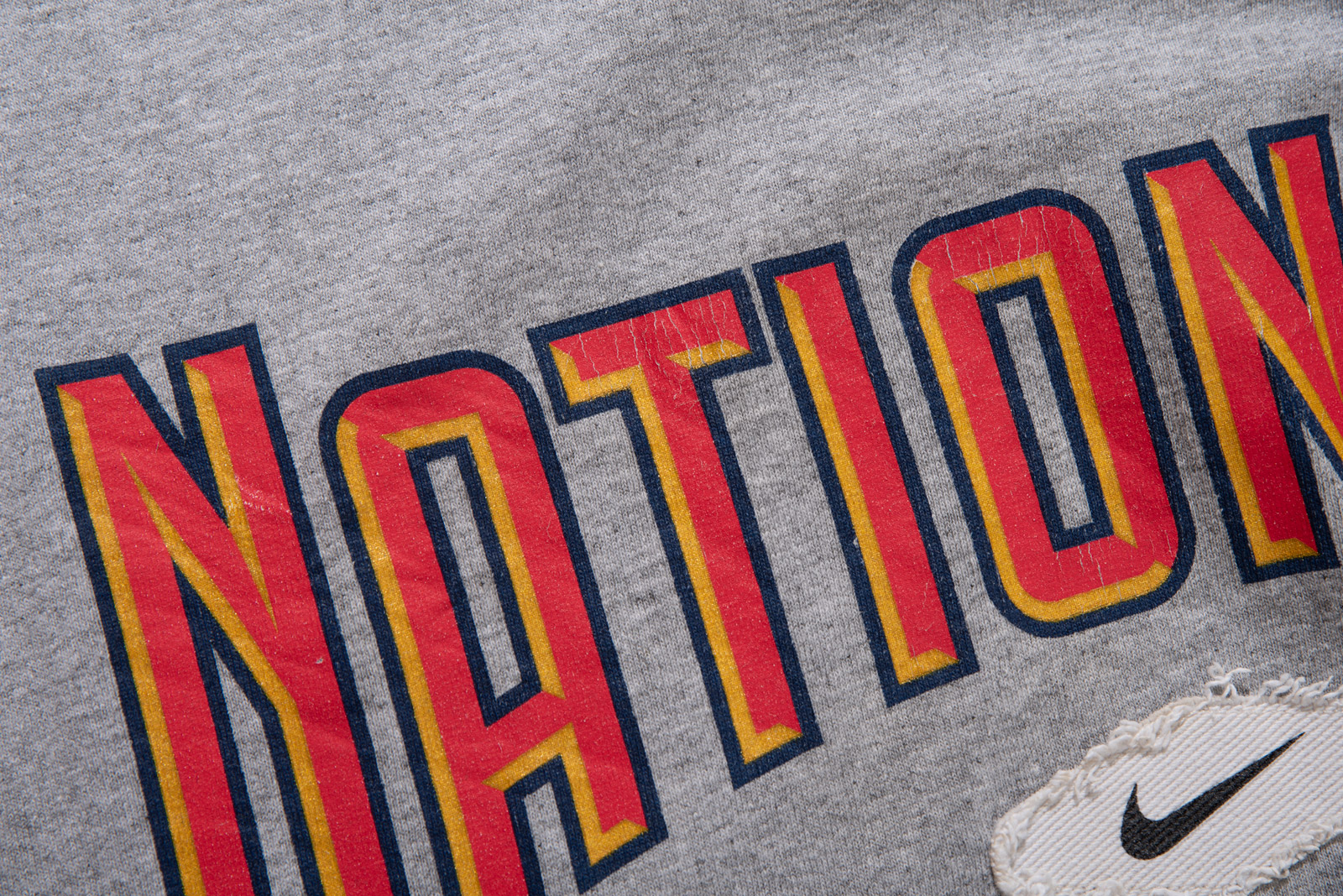 나이키의 스포티함을 잘 살려주는 시그니처 컬러, 멜란지 그레이에 90~00년대 특유의 톱톱한 100% 코튼 소재, 강렬한 레드+옐로우 아치형 팀 로고와 거친 컷팅 디테일의 스우시 패치가 인상적인데요.