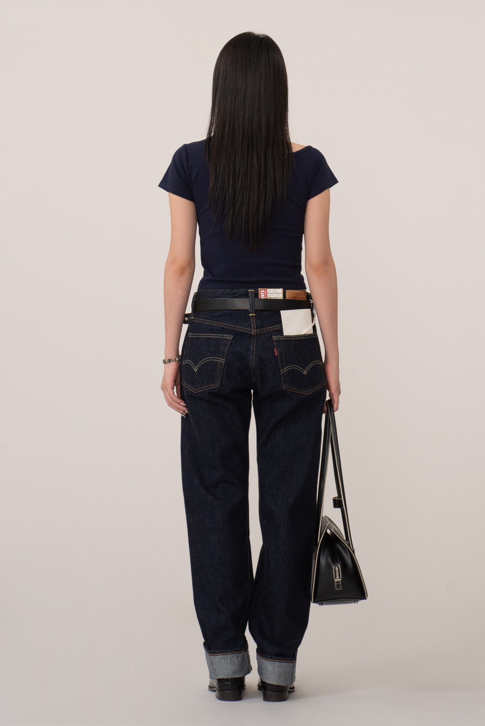 전형적인 40년대 말~50년대 초 501 실루엣으로 허벅지와 힙에 적당한 여유가 있고 세미 테이퍼드 핏, 일본산 셀비지 데님에 불규칙 슬럽감이 살아있어 워싱 전후 변화가 크고 추후 빈티지 페이딩이 매력적에요.