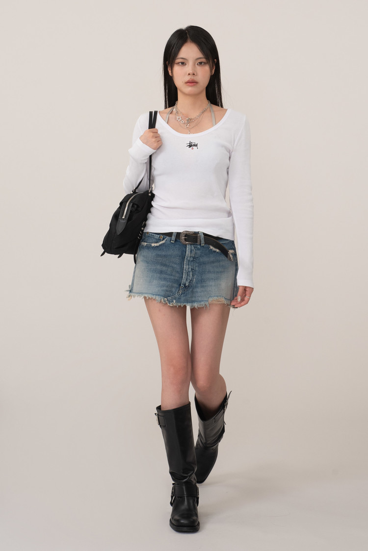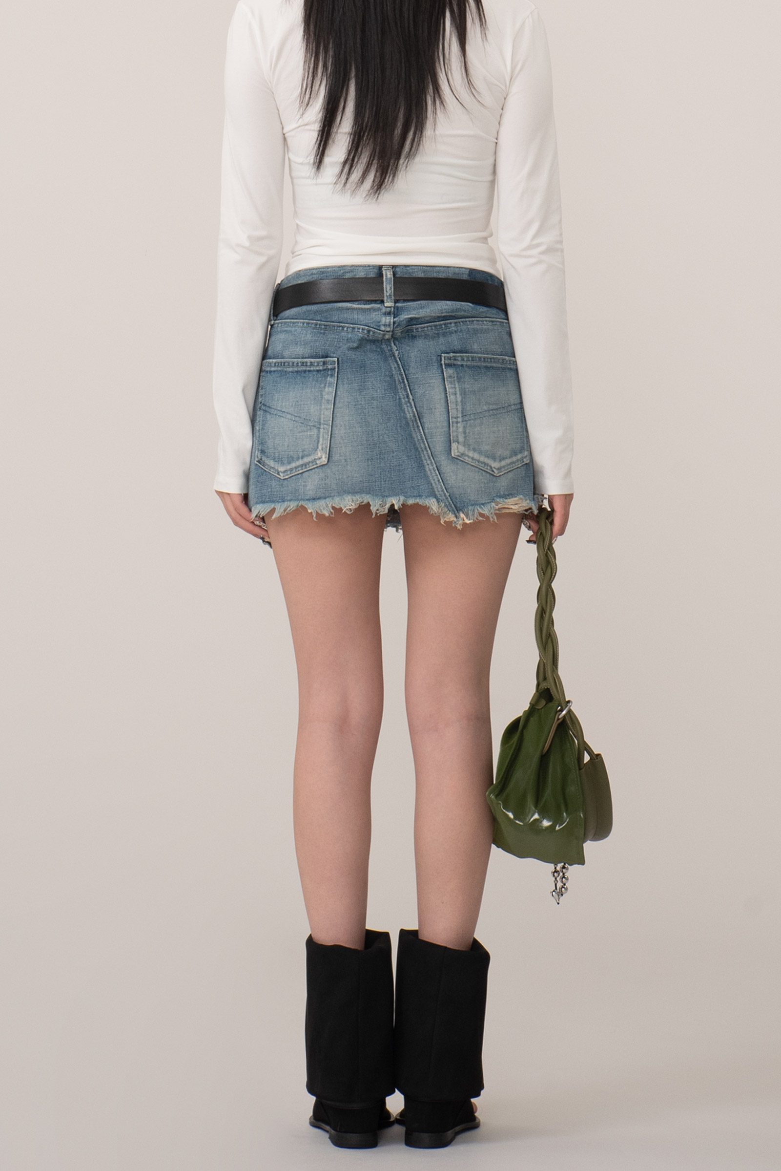 100% 코튼 소재, 과감한 컷오프 디테일과 자연스러운 올 풀림, 버튼 플라이 등 빈티지 스커트를 복각한 디자인이 눈에 띄는데요.