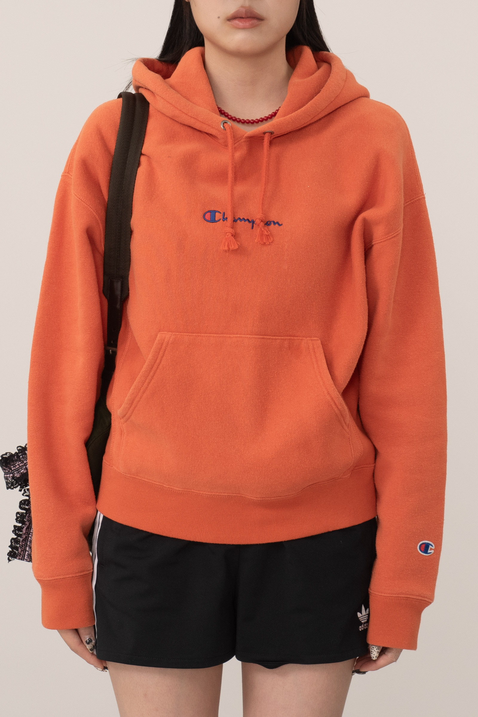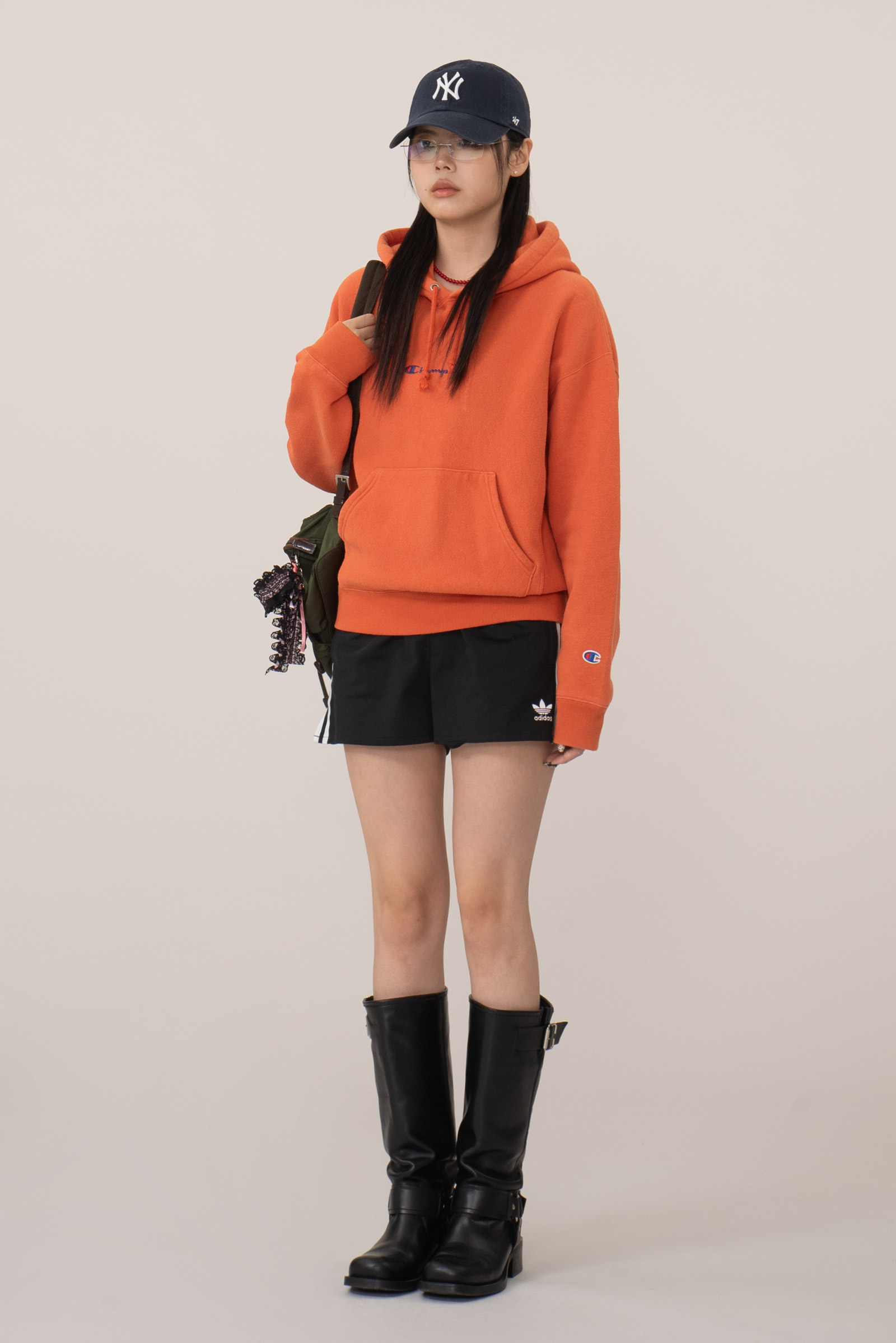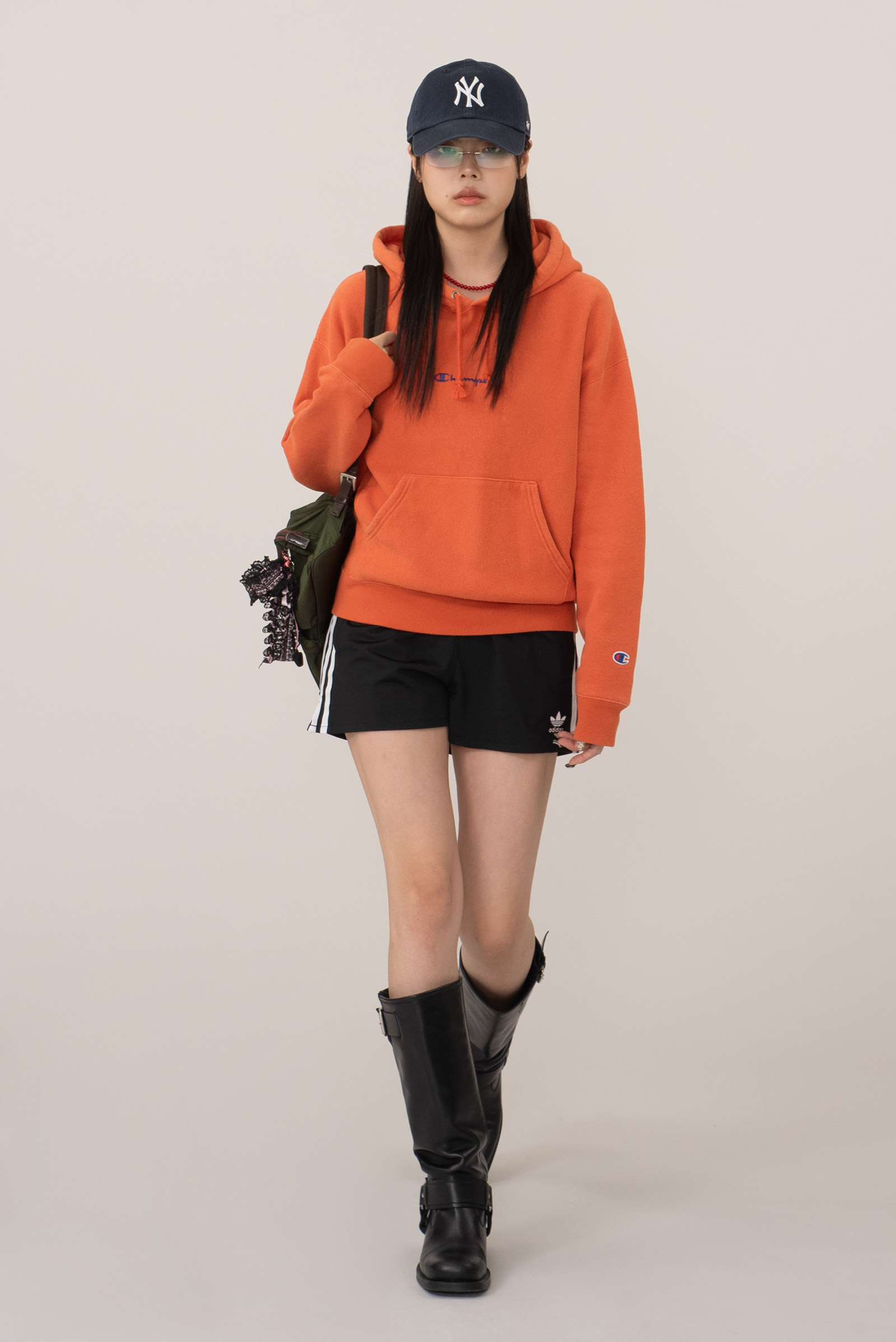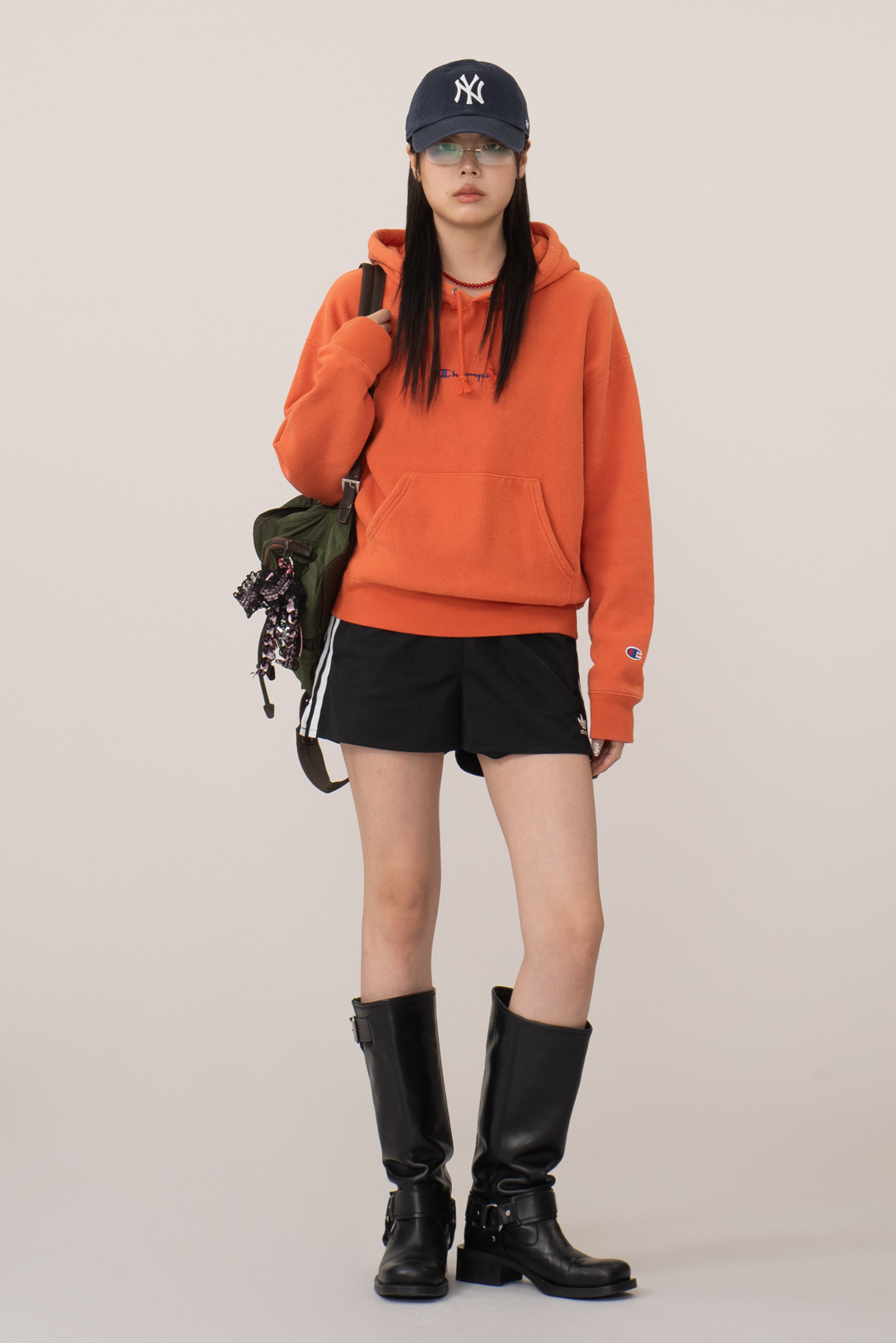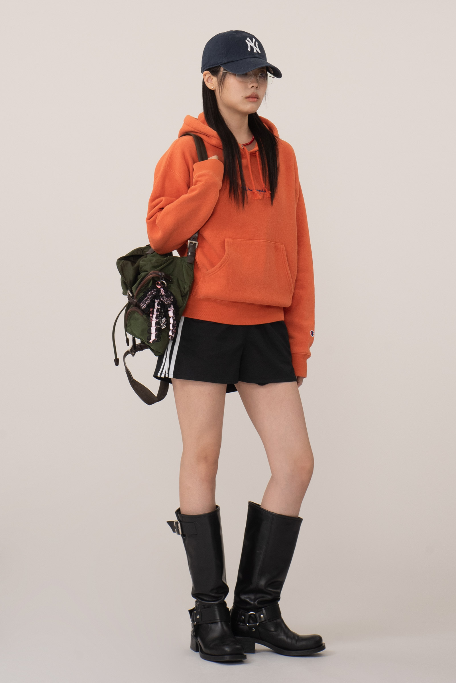 비비드한 오렌지 톤 컬러가 일반적인 블랙, 그레이 계열과 달라 희소성을 띠고 가슴이 아닌 전면 중앙에 챔피온 자수가 들어가 있어서 훨씬 유니크하답니다.