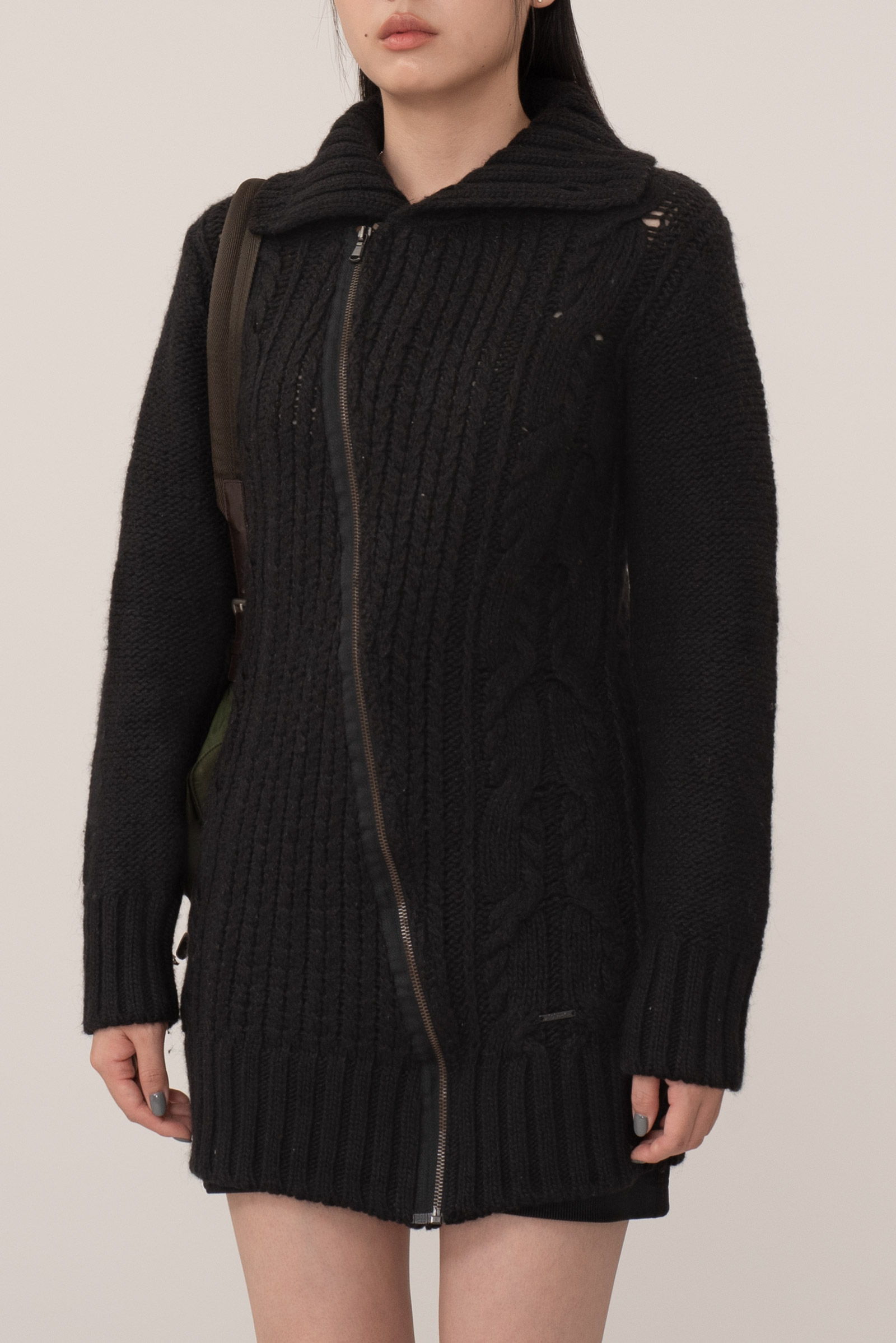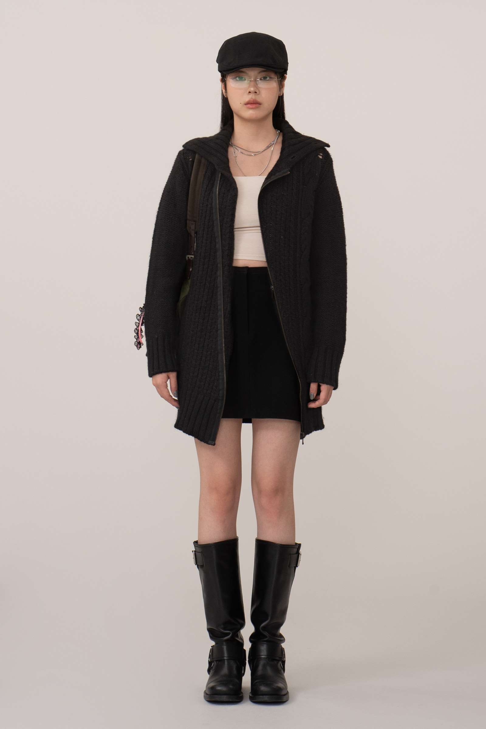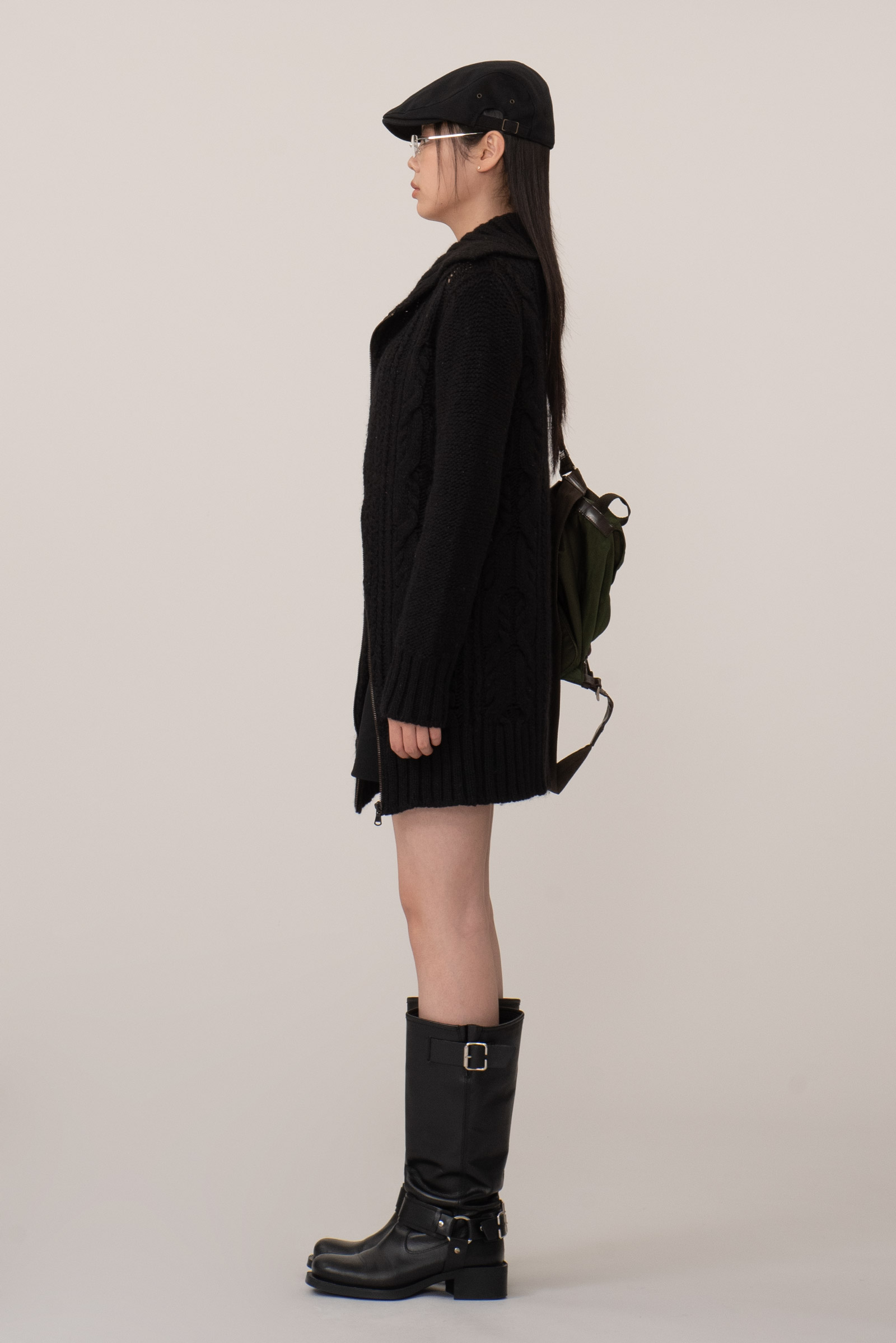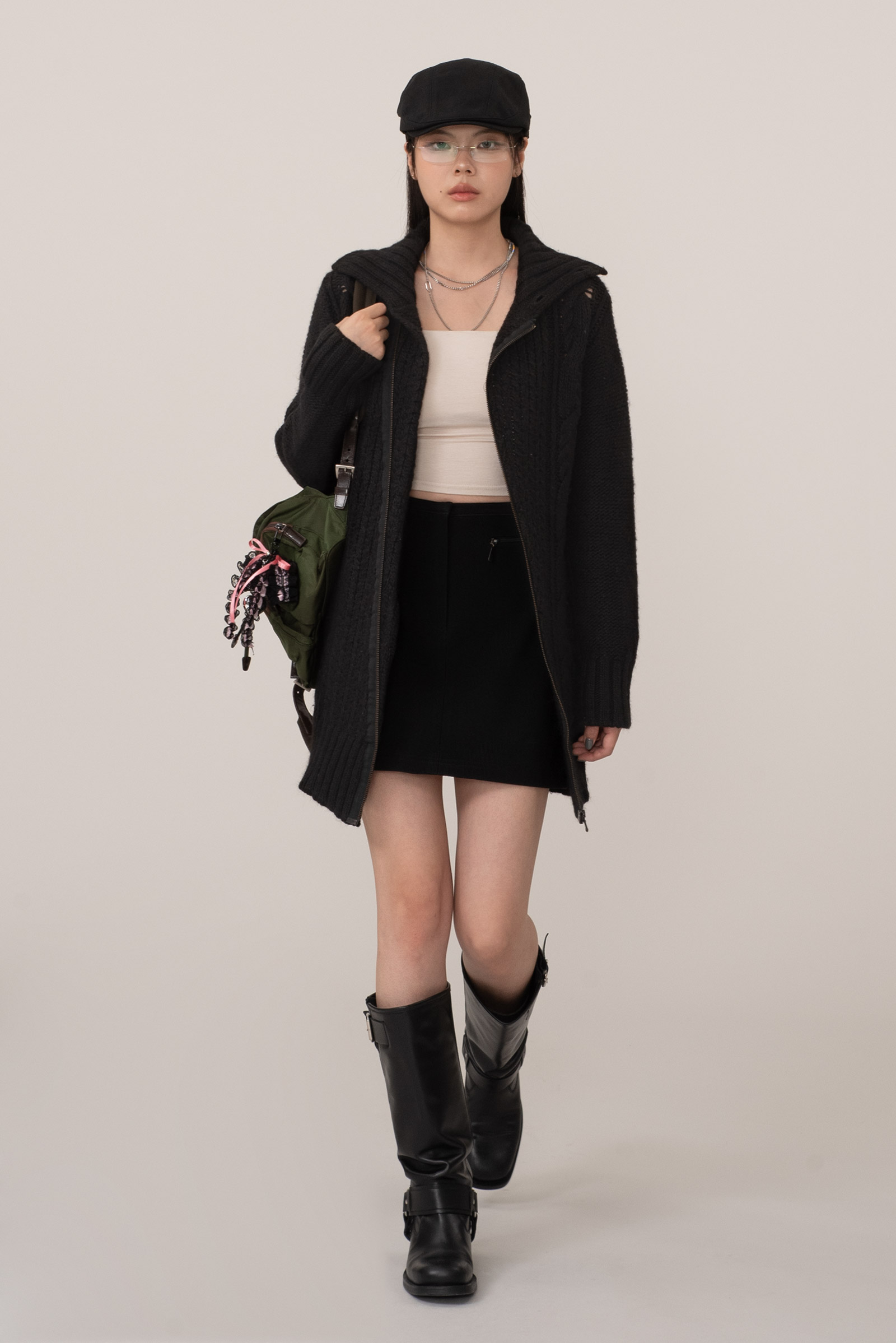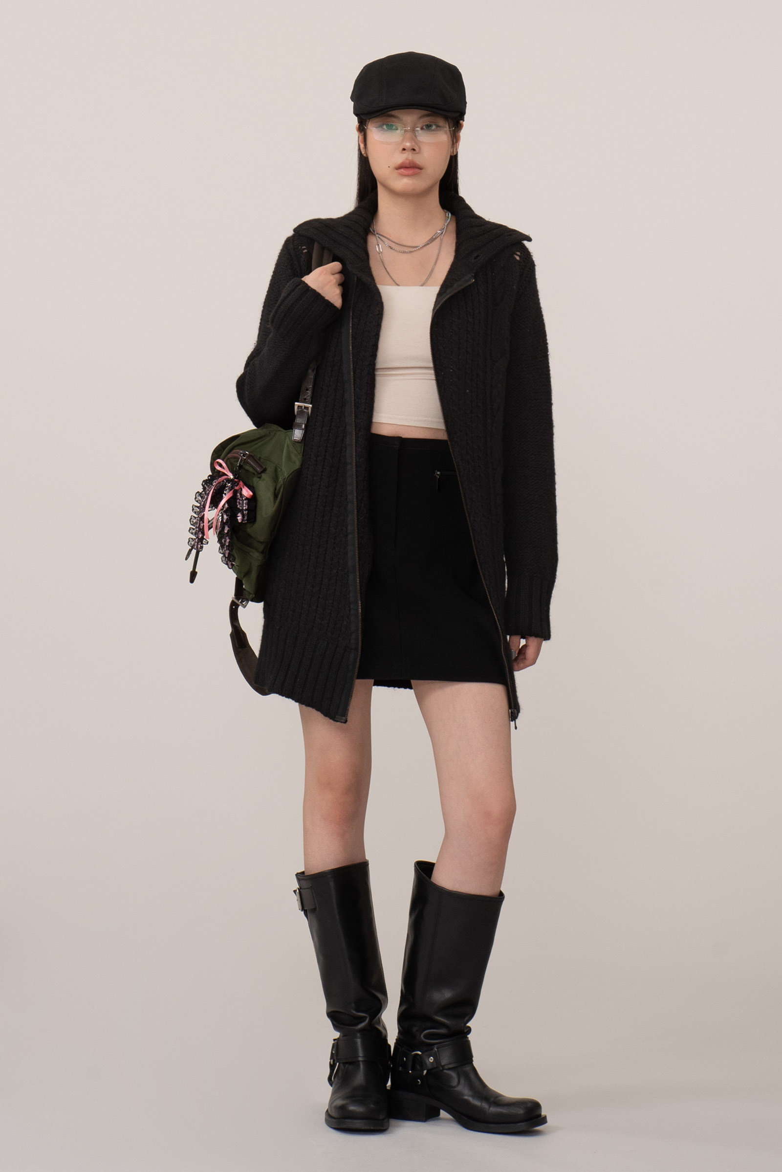 전통적인 니트 가디건에서 벗어나 모토 재킷처럼 기울어진 지퍼를 적용해 캐주얼 니트에 아방가르드한 무드를 더하고 하이넥 디자인이라 오픈했을 때 커다란 카라가 대비되어 얼굴이 작아 보이는 효과, 전부 올려 밀리터리나 모터사이클 느낌으로 입을 수도 있고요.