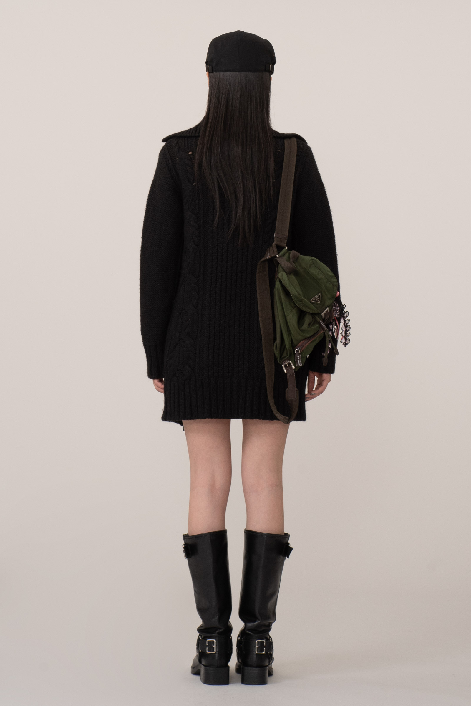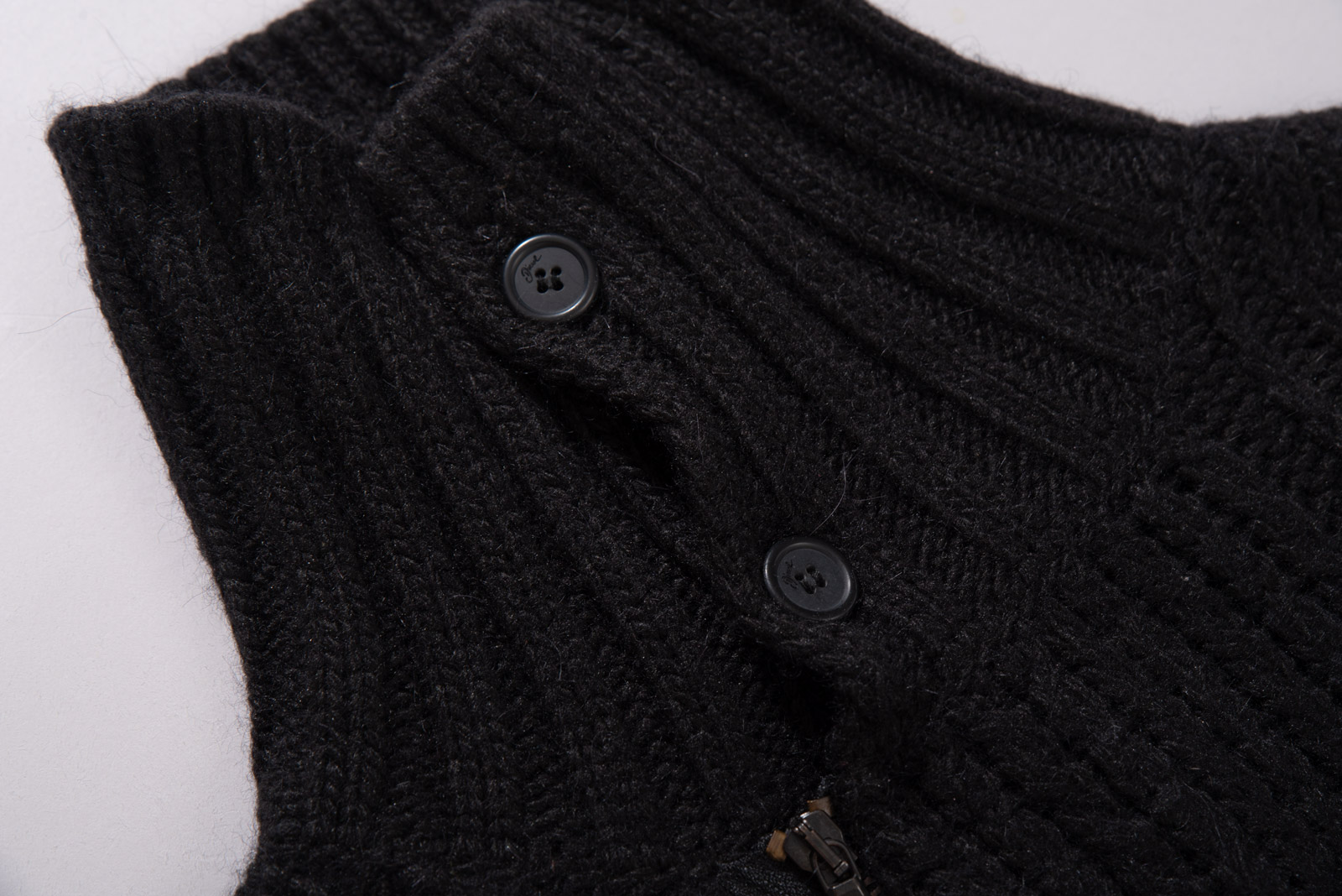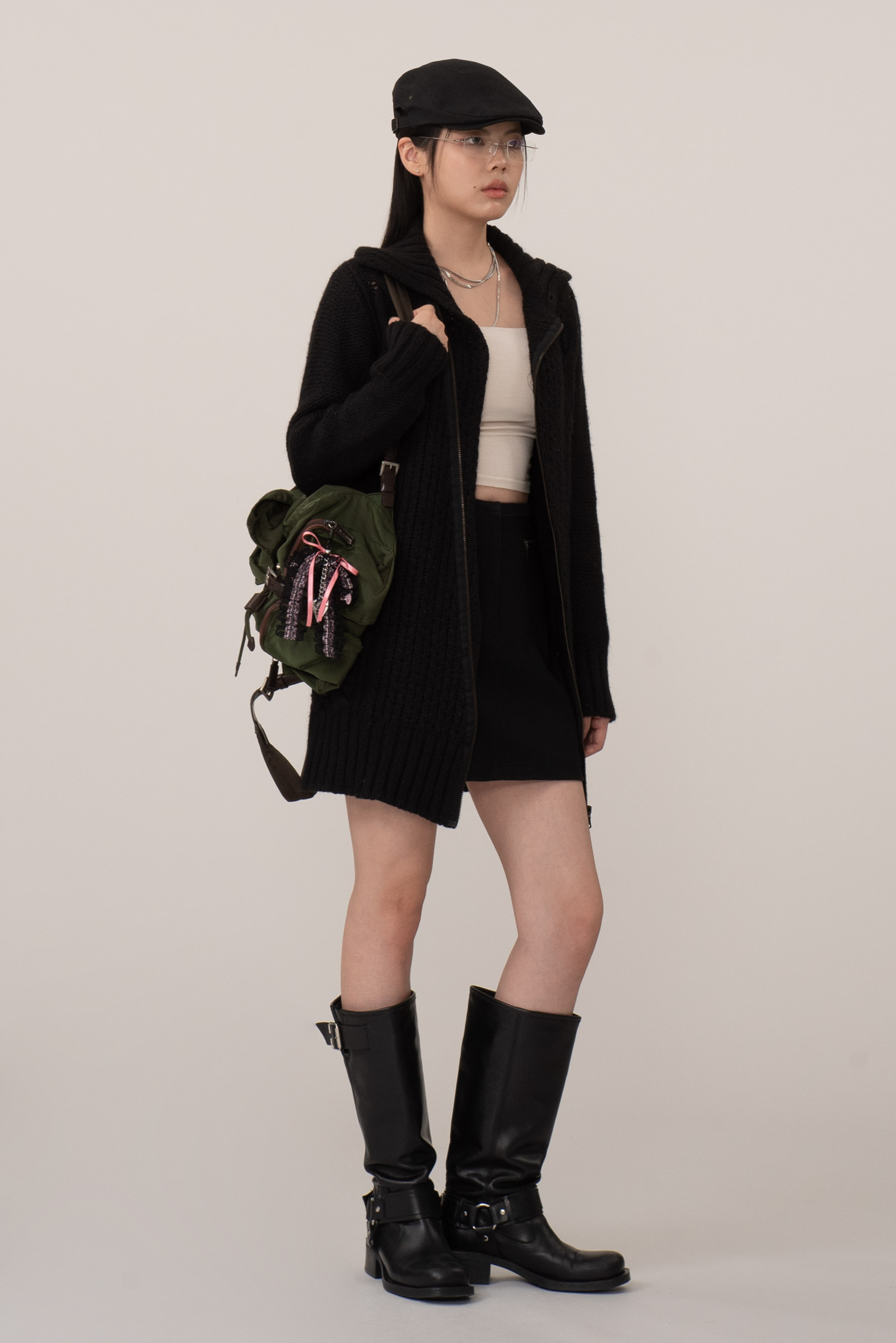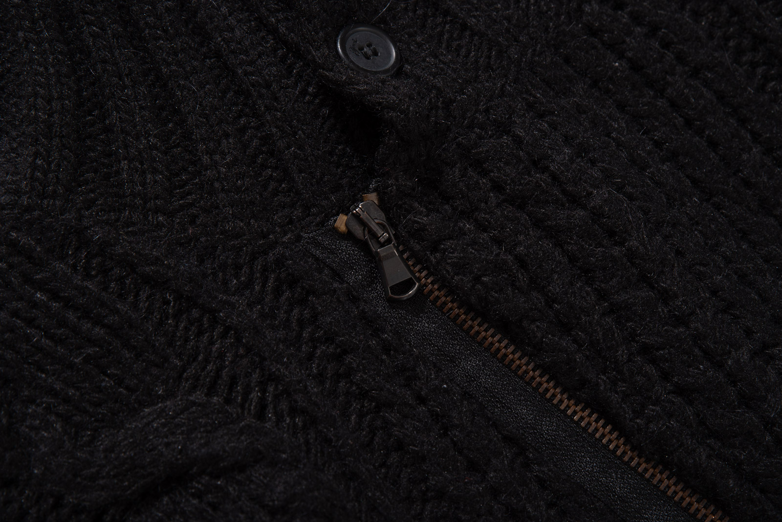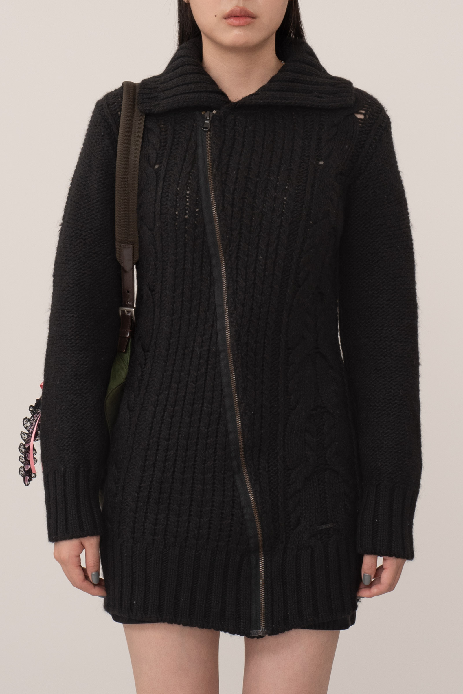 전통적인 니트 가디건에서 벗어나 모토 재킷처럼 기울어진 지퍼를 적용해 캐주얼 니트에 아방가르드한 무드를 더하고 하이넥 디자인이라 오픈했을 때 커다란 카라가 대비되어 얼굴이 작아 보이는 효과, 전부 올려 밀리터리나 모터사이클 느낌으로 입을 수도 있고요.