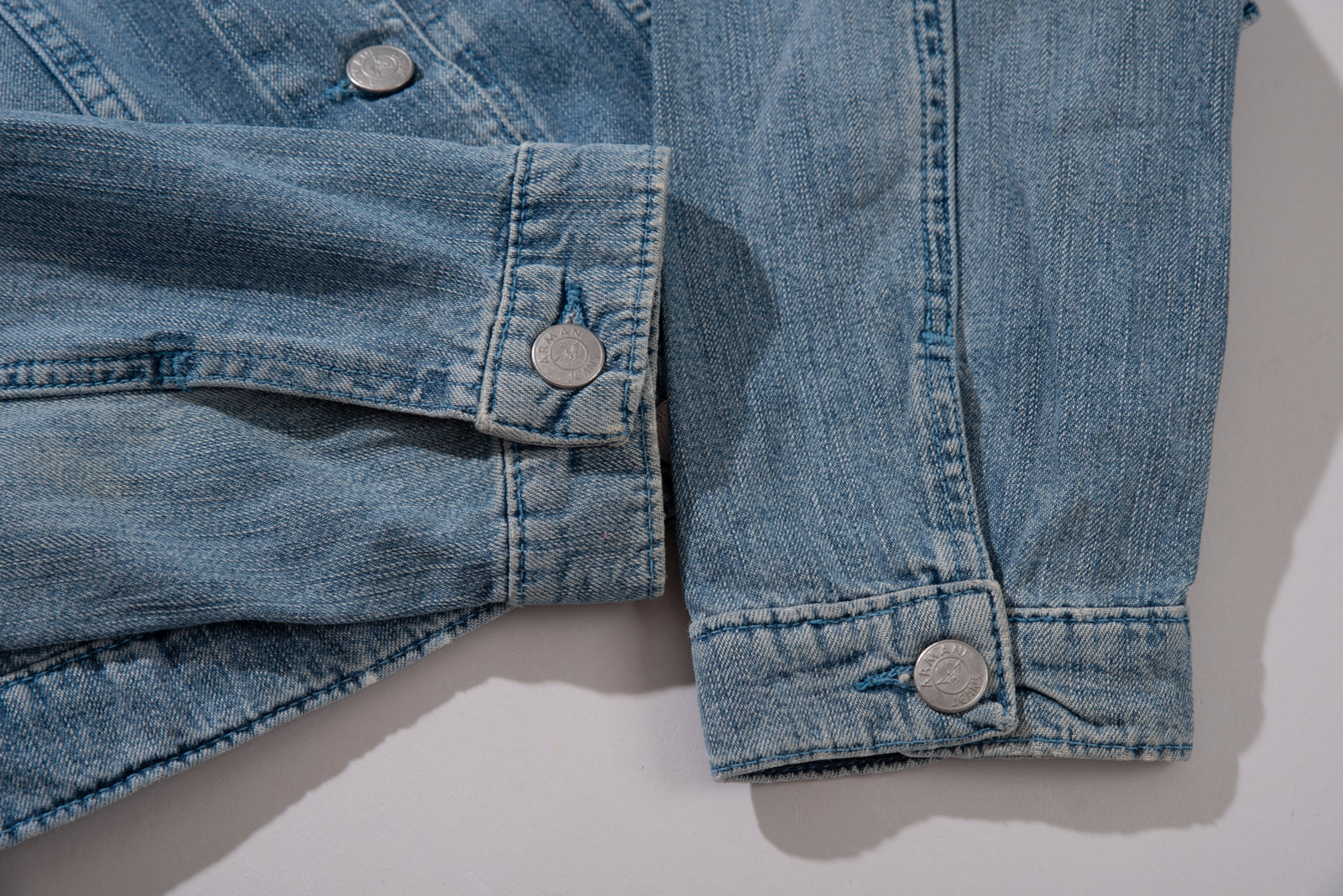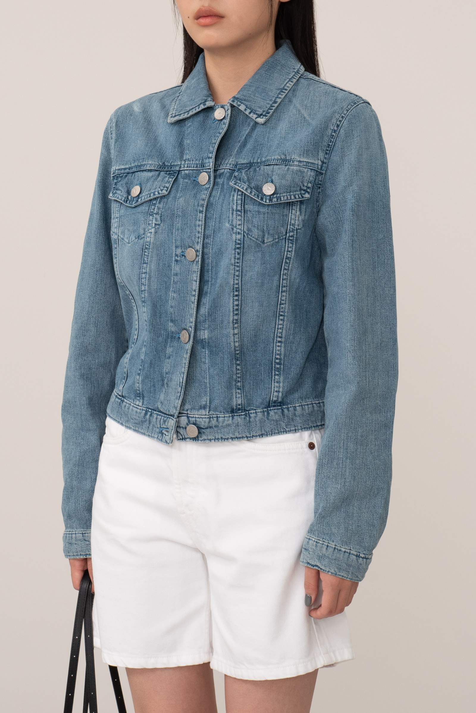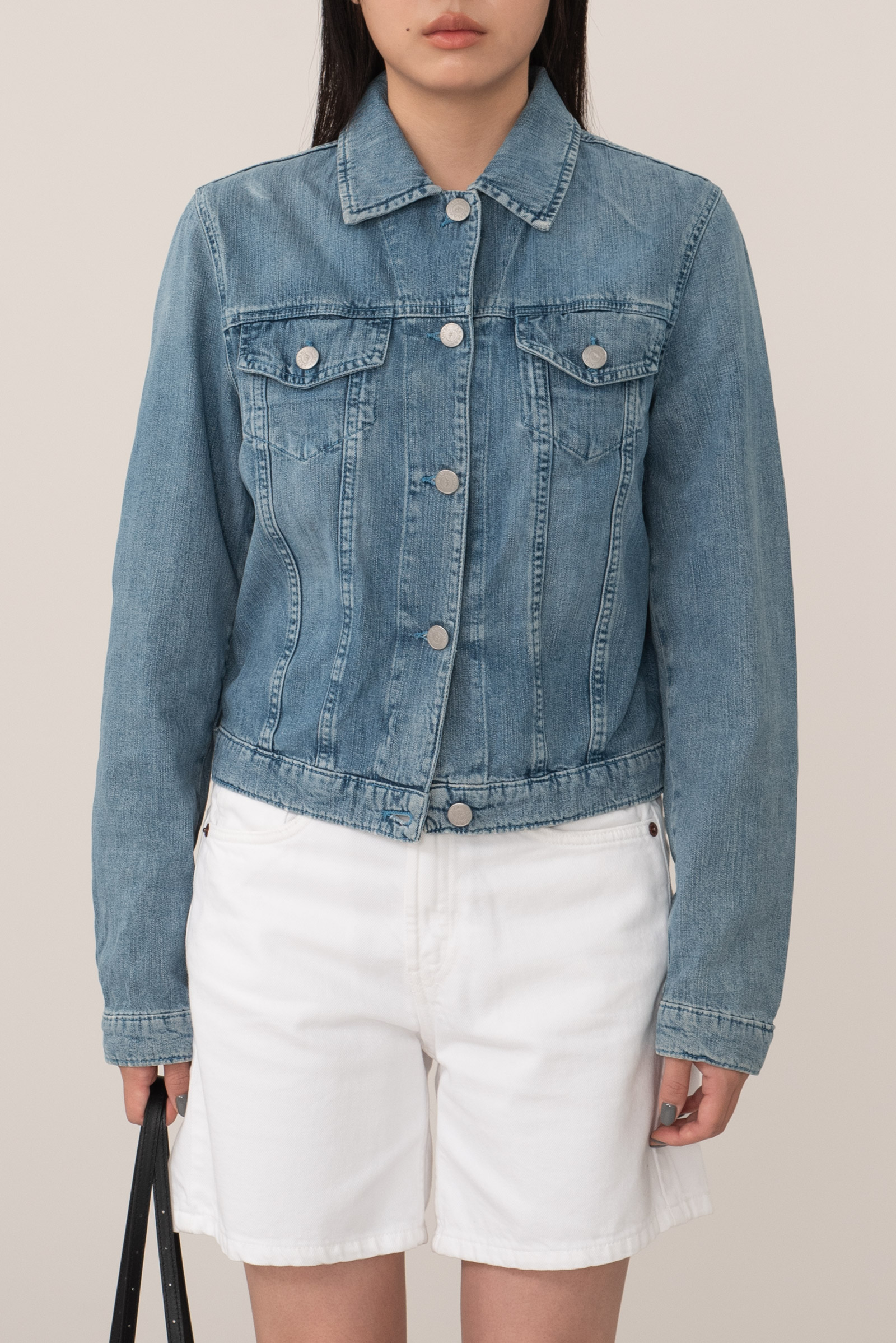 오늘 소개해 드리는 피스는 아르마니 진의 여성용 데님 재킷으로 전형적인 트러커의 형태를 띠고 있지만 좀 더 심플하면서 현대적인 실루엣이 특징이며 은은하고 밝은 컬러에 과하지 않은 워싱, 경쾌하고 영한 무드가 일품이랍니다.