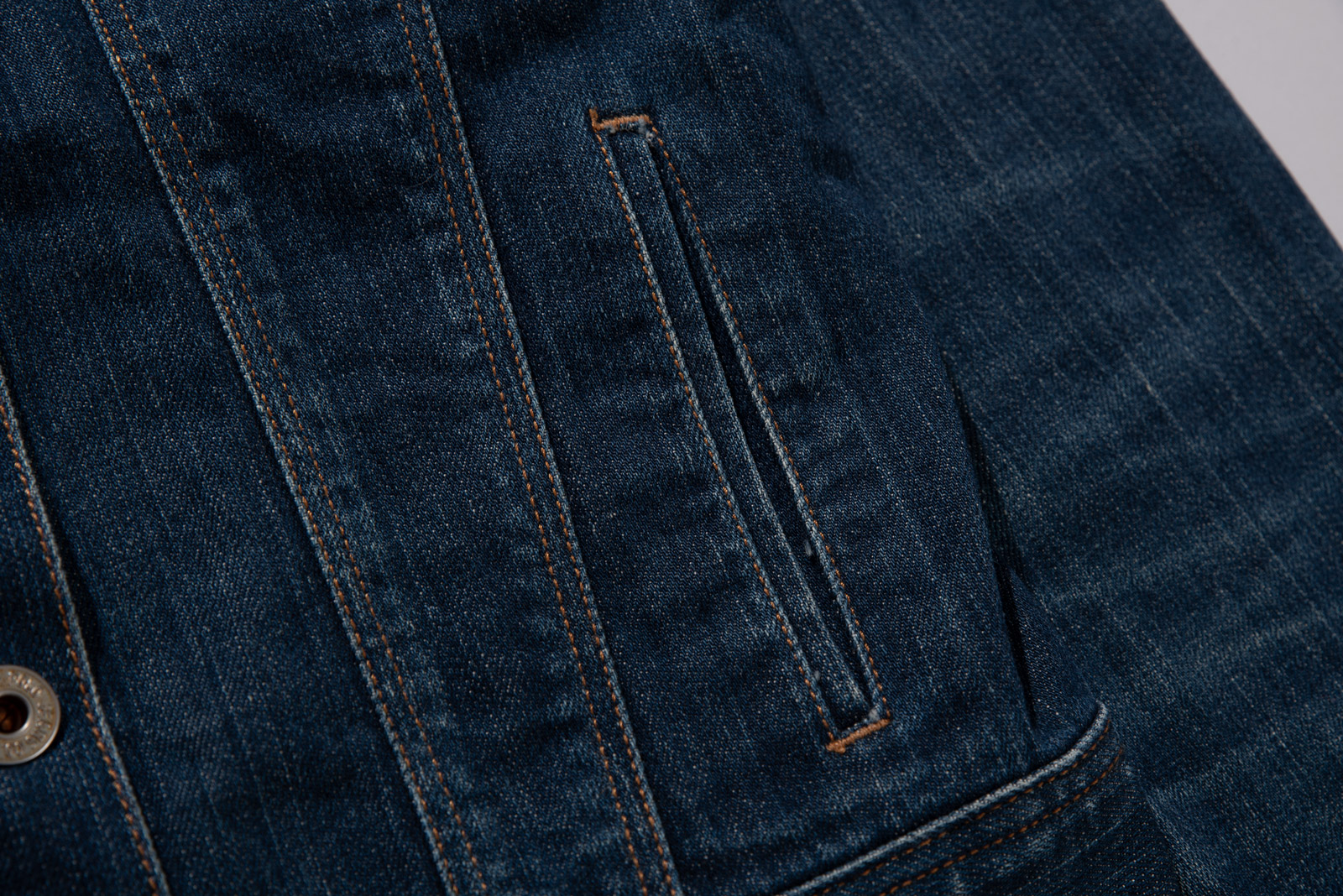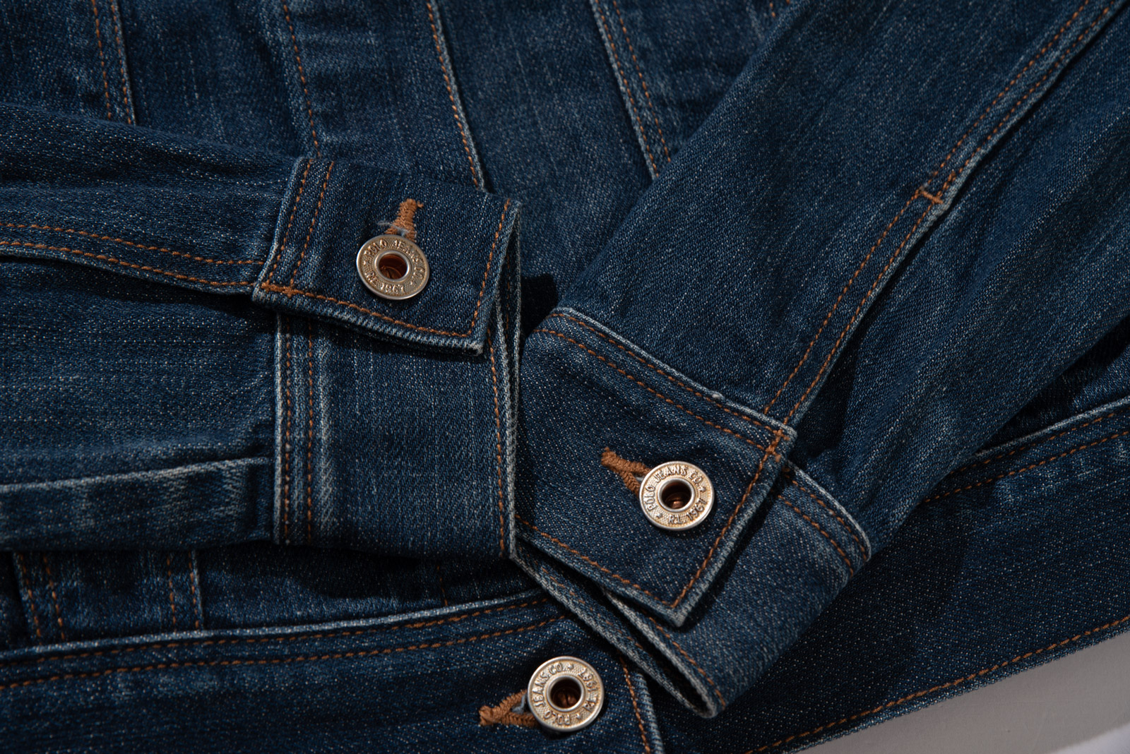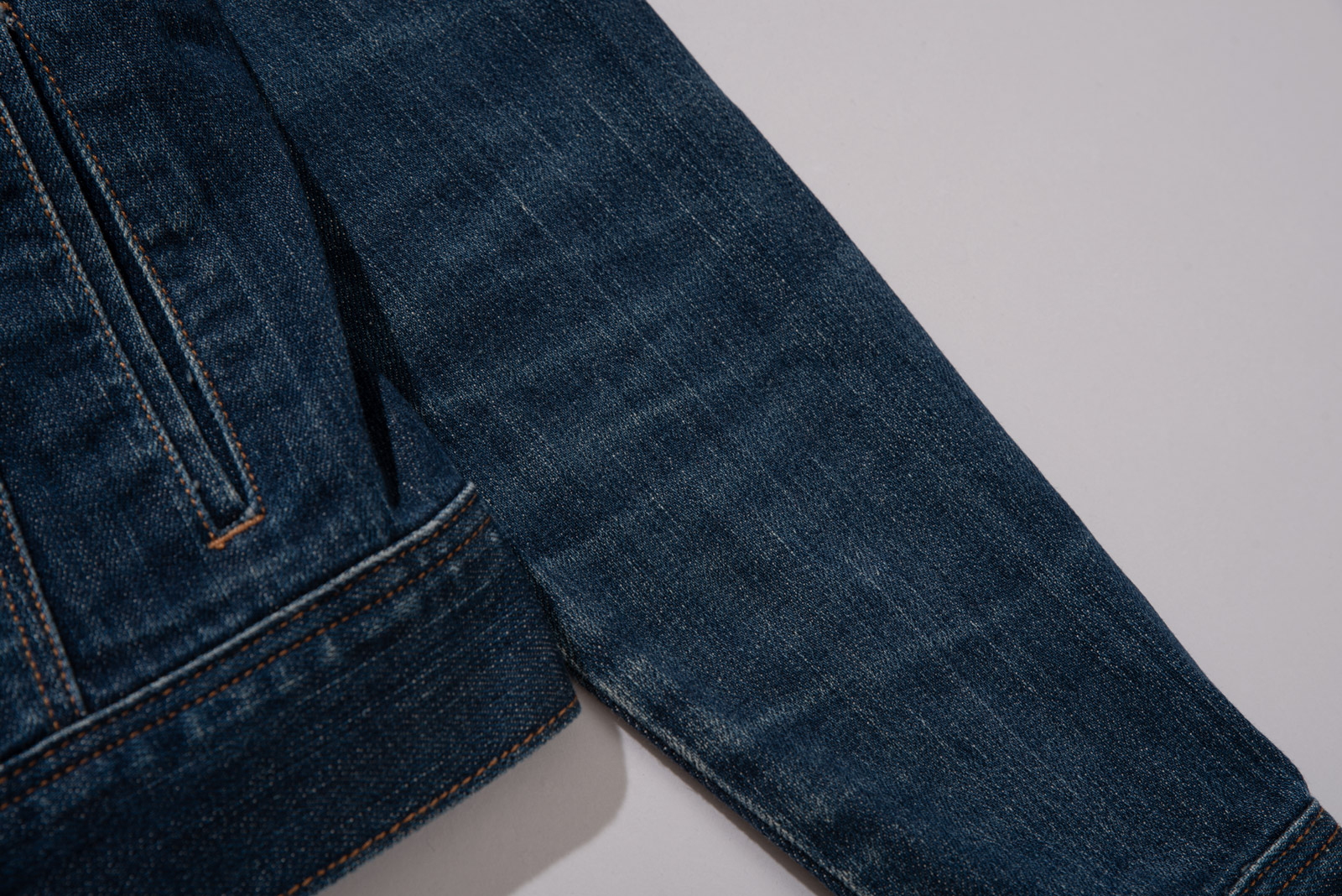 슬림하고 여유 있는 기장의 소매와 자연스럽지만 매니악 하지 않은 워싱, 오리지널리티를 살린 주황색 스티치와 베이직한 핏 감이라 유행 없이 두고두고 착용 가능하며 편안하게 착용되는 두께감과 비교적 부드러운 데님이라 부담 없이 연출되어요.