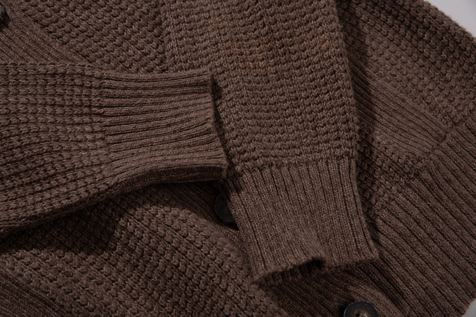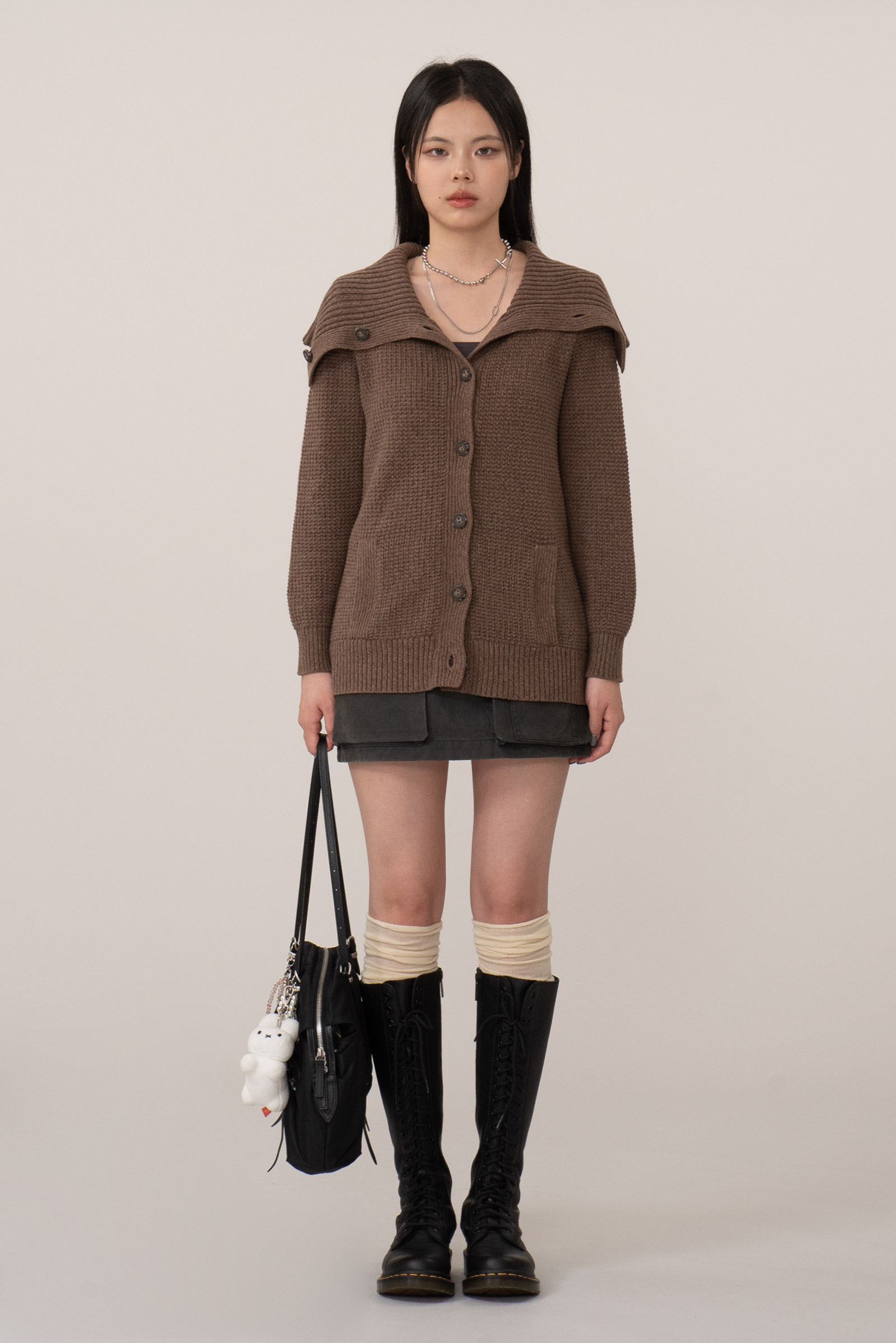 카라가 목선을 부드럽게 감싸며 원목 느낌을 살린 버튼으로 탈착이 가능한 구조, 단추를 모두 잠그면 하이넥 니트처럼 착용 가능하고 오픈 시에는 자연스럽게 떨어져 클래식한 실루엣을 연출한답니다.