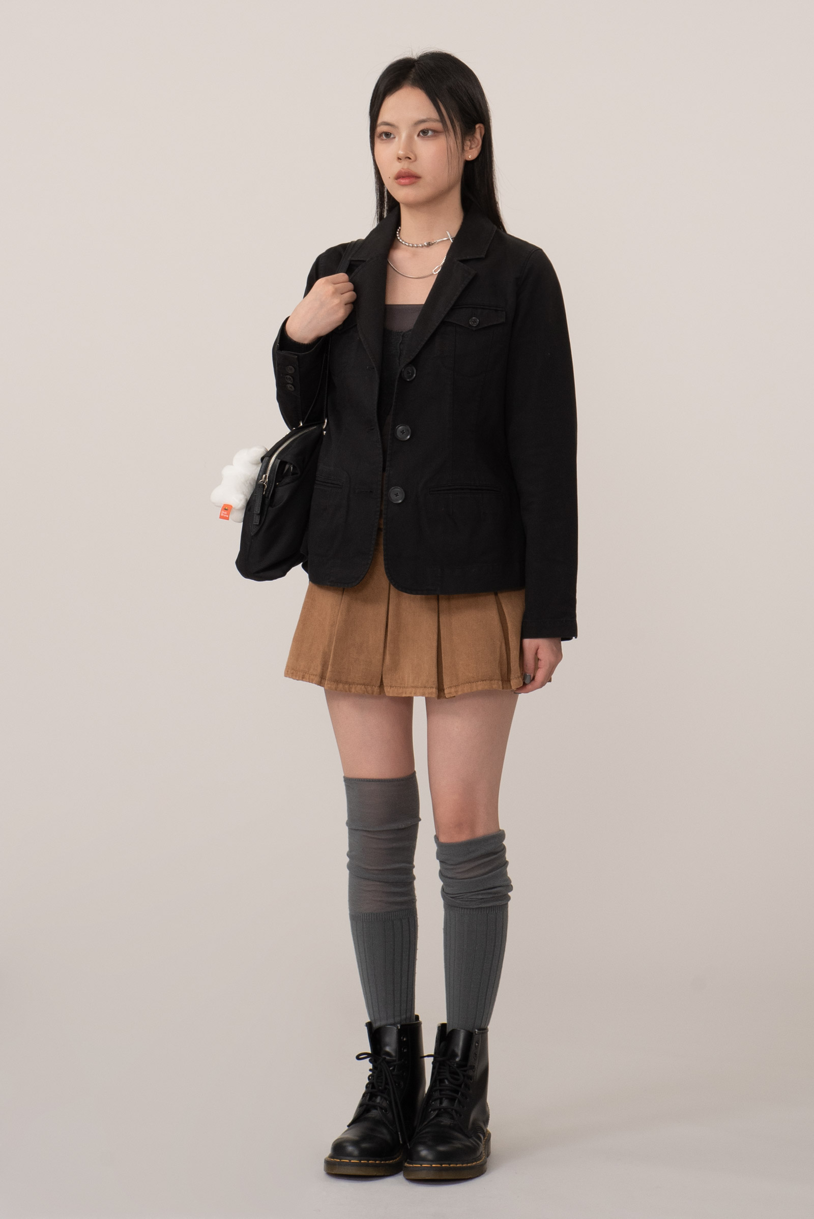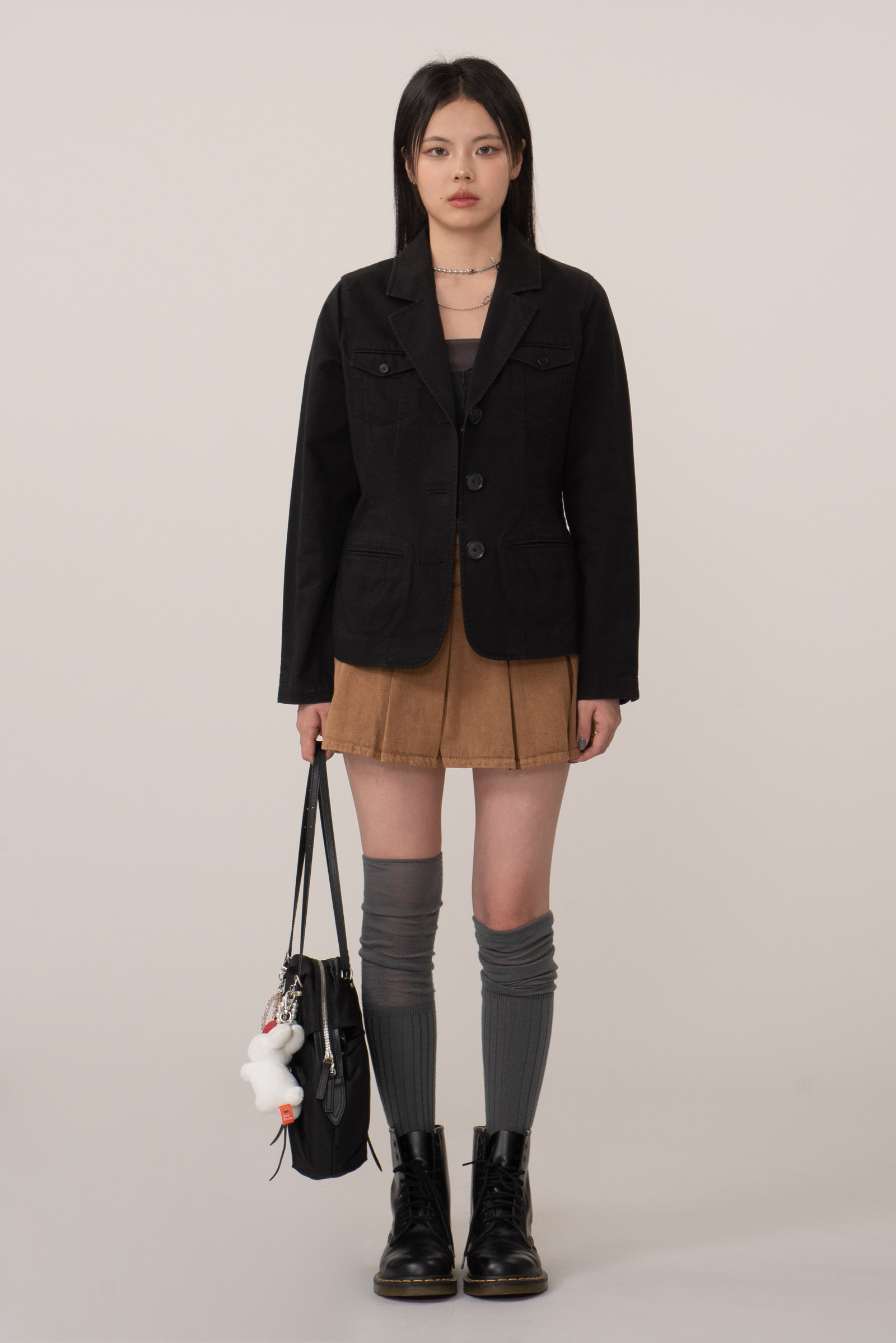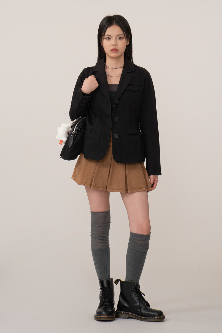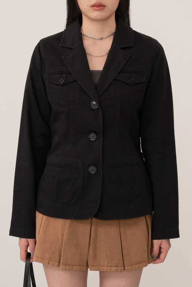 밀도 높은 100% 코튼 소재를 사용하여 형태를 안정적으로 유지하며 동시에 가볍고 편안한 착용감, 3버튼 재킷으로 캐주얼 블레이저와 밀리터리 유니폼의 디테일이 교차된 디자인이라 심심하지 않아요.