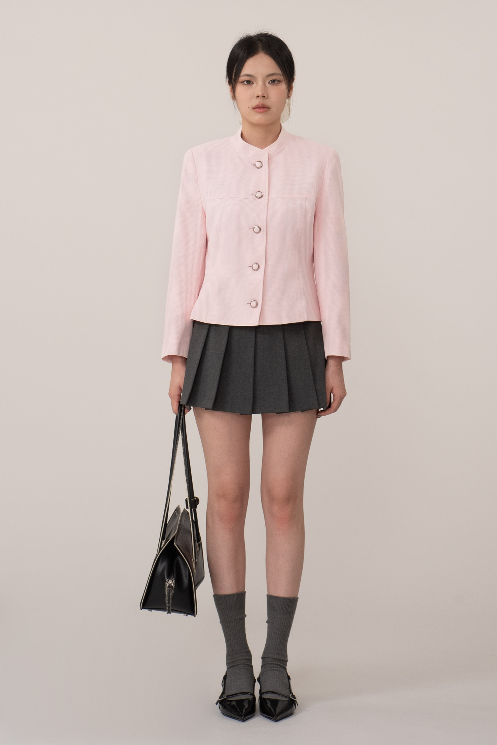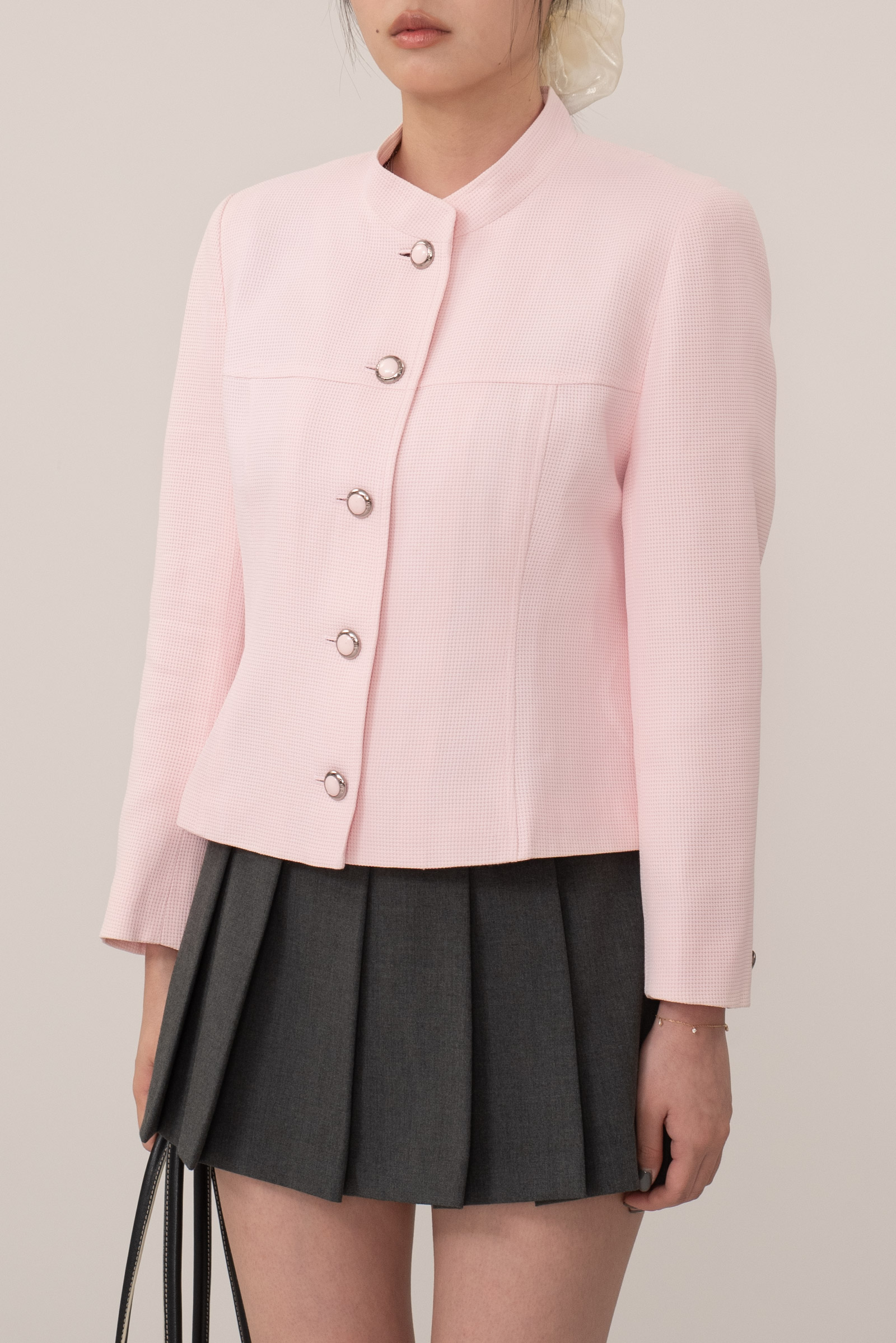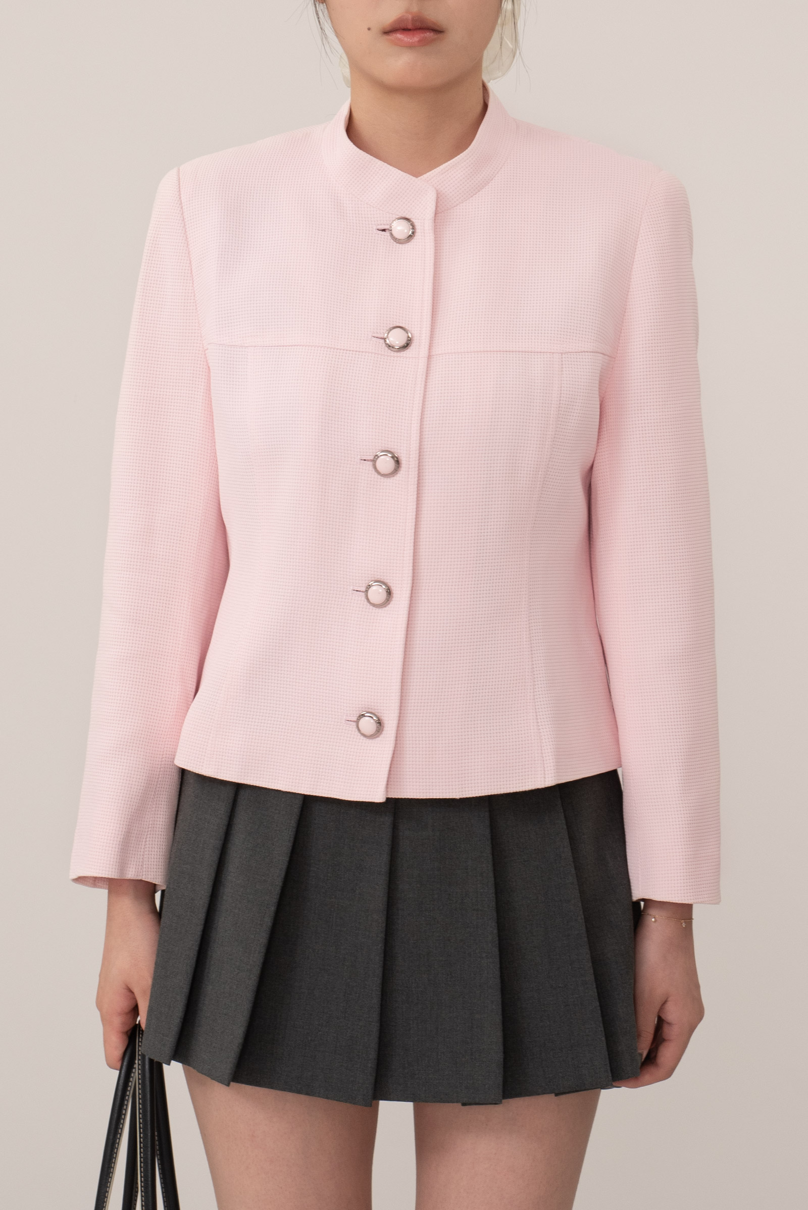 노카라 형태의 목선이 특징으로 꾸레쥬 특유의 미니멀한 모더니즘 라인을 완벽히 보여주며 전면 볼드한 프레임 버튼으로 포인트를 주었어요.