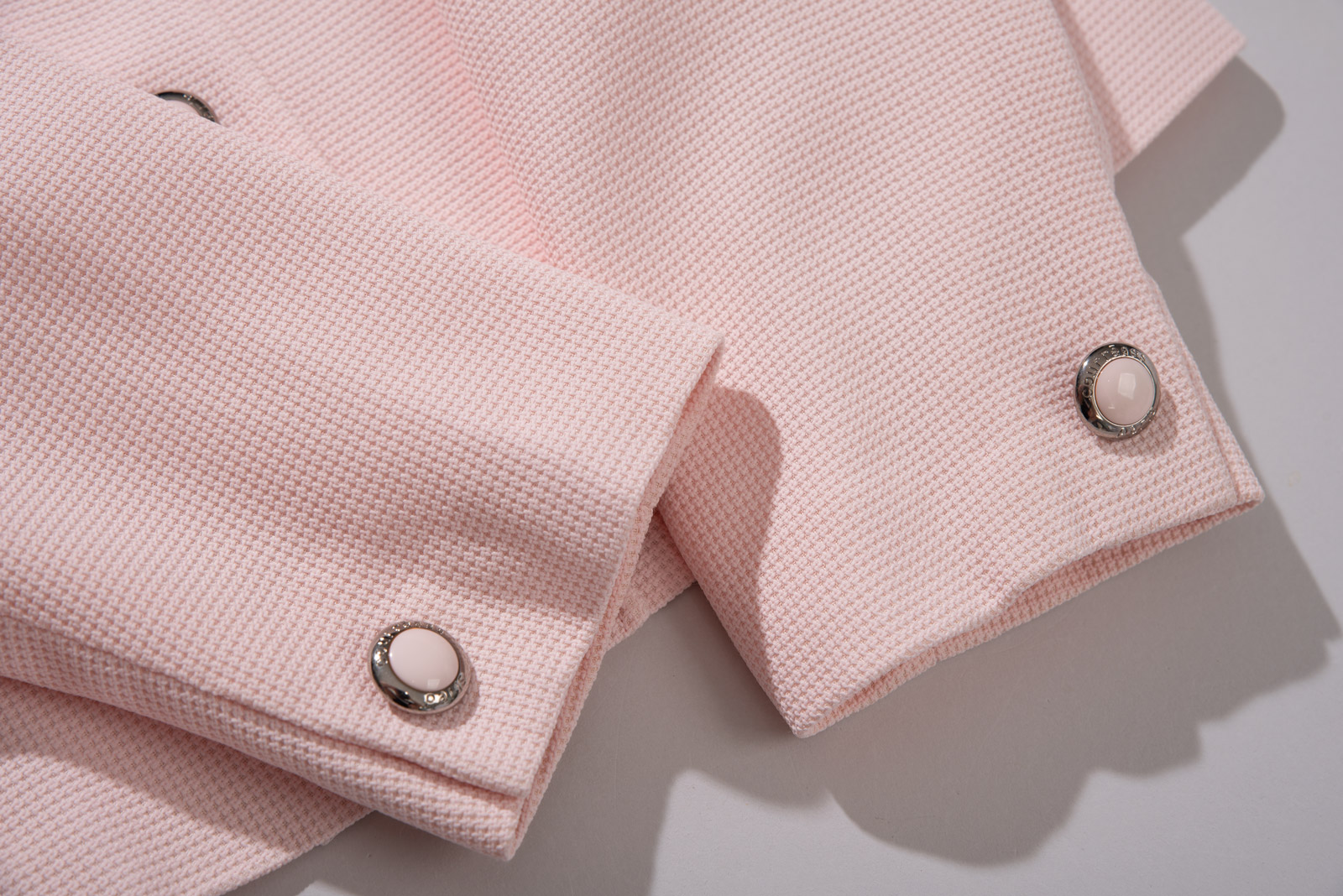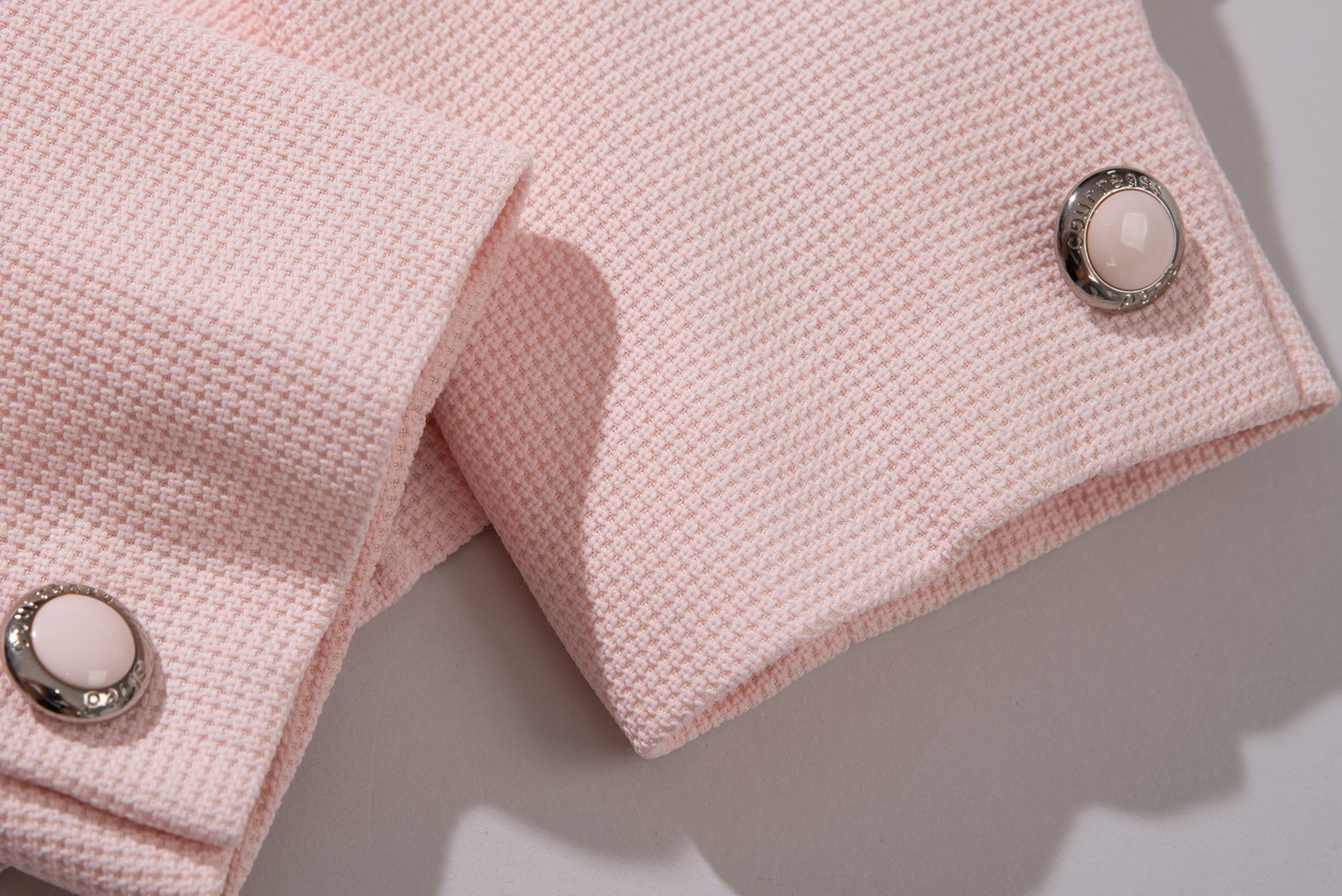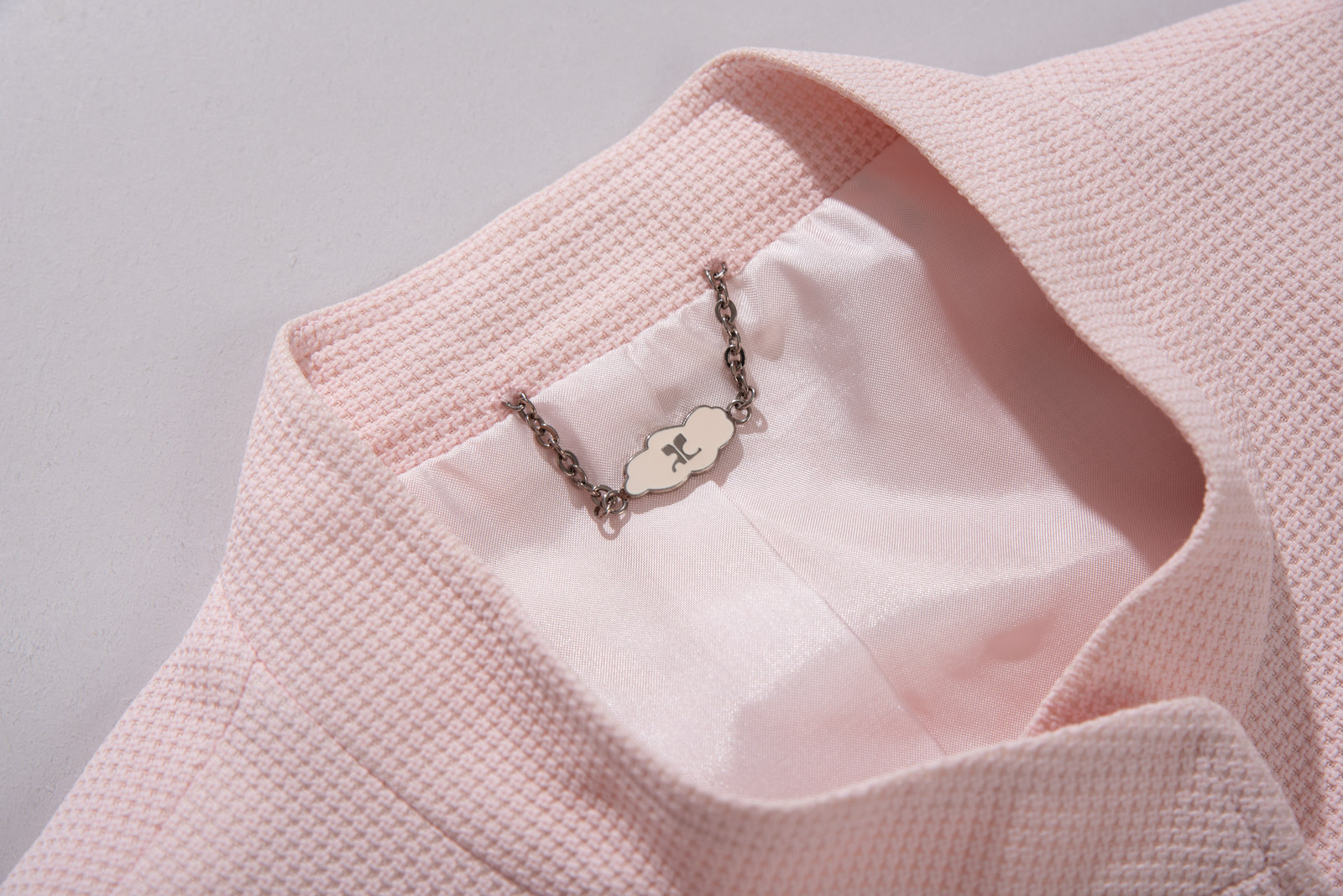 노카라 형태의 목선이 특징으로 꾸레쥬 특유의 미니멀한 모더니즘 라인을 완벽히 보여주며 전면 볼드한 프레임 버튼으로 포인트를 주었어요.
