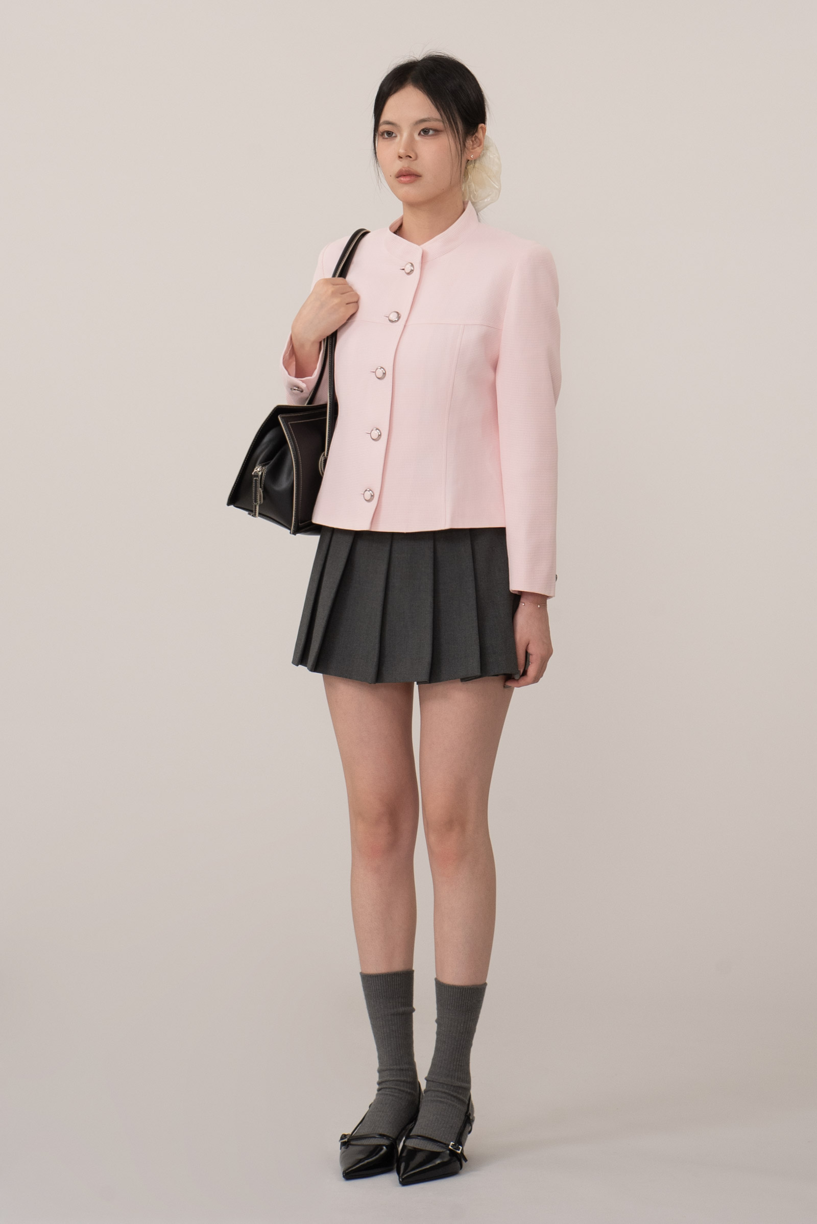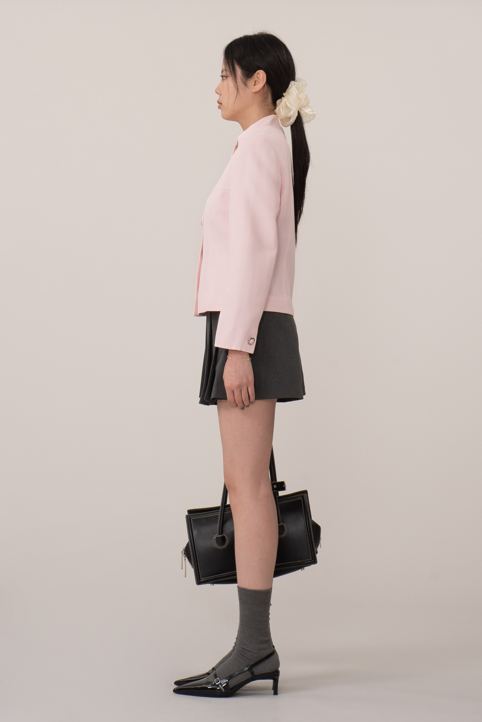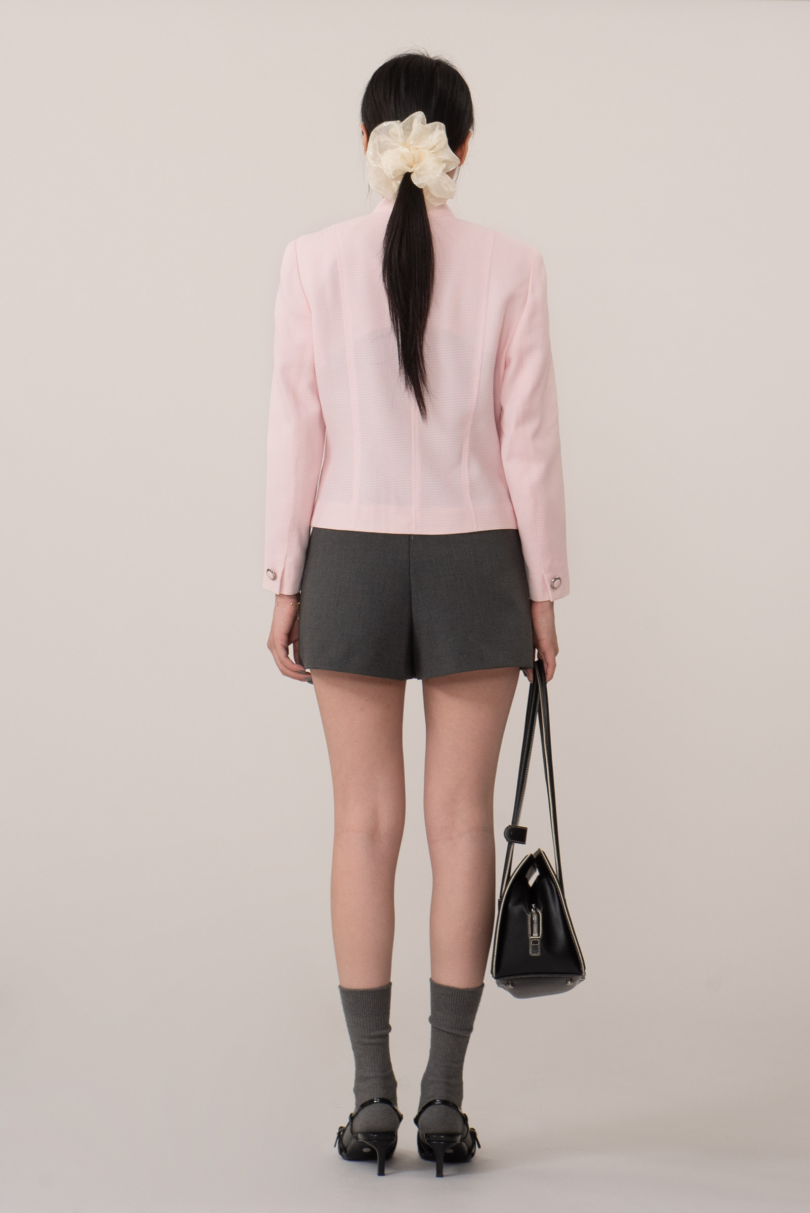 전체적으로 불필요한 장식 없이 봉제선과 원단 질감만으로 형태를 표현하는 구조적 미학이 강조된 디자인이랍니다.