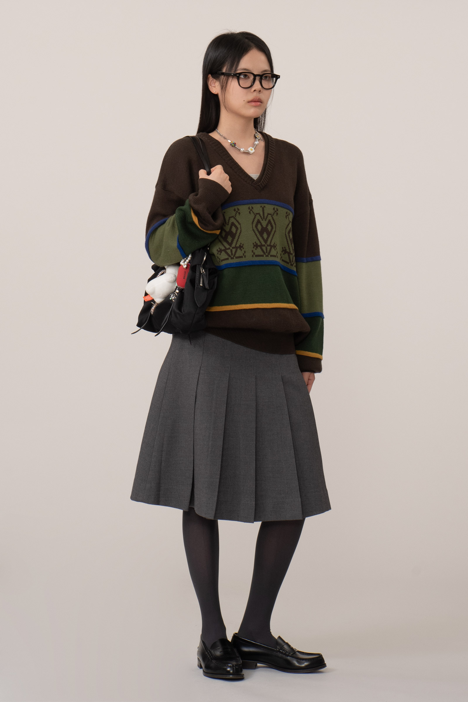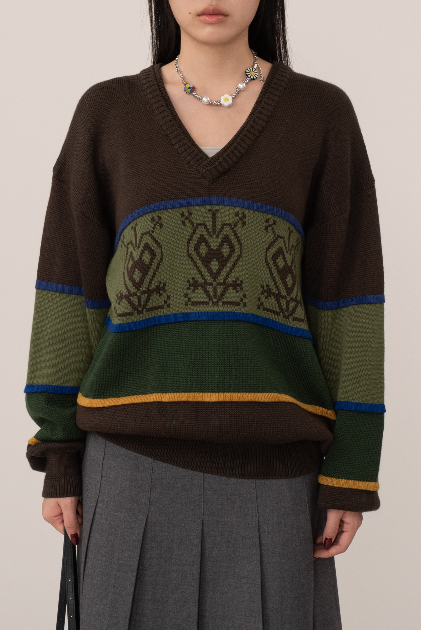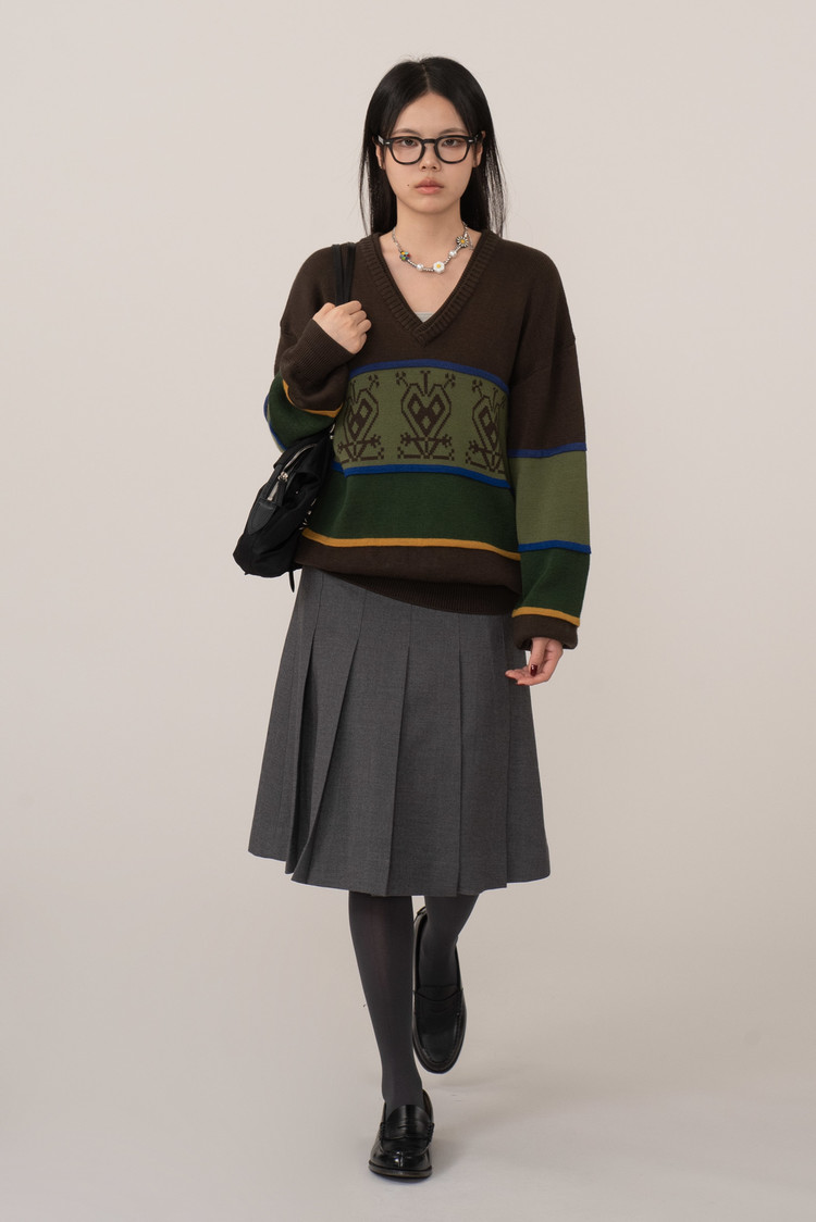 중앙에는 기하학적 하트 모티브가 반복되어 있는데 에스닉 감성을 보여주며 목이 시원해 보이는 브이넥에 탄탄한 립 조직 마감, 전체적으로 여유로운 실루엣이라 착용 시 지적이면서도 따뜻한 인상을 주어요.