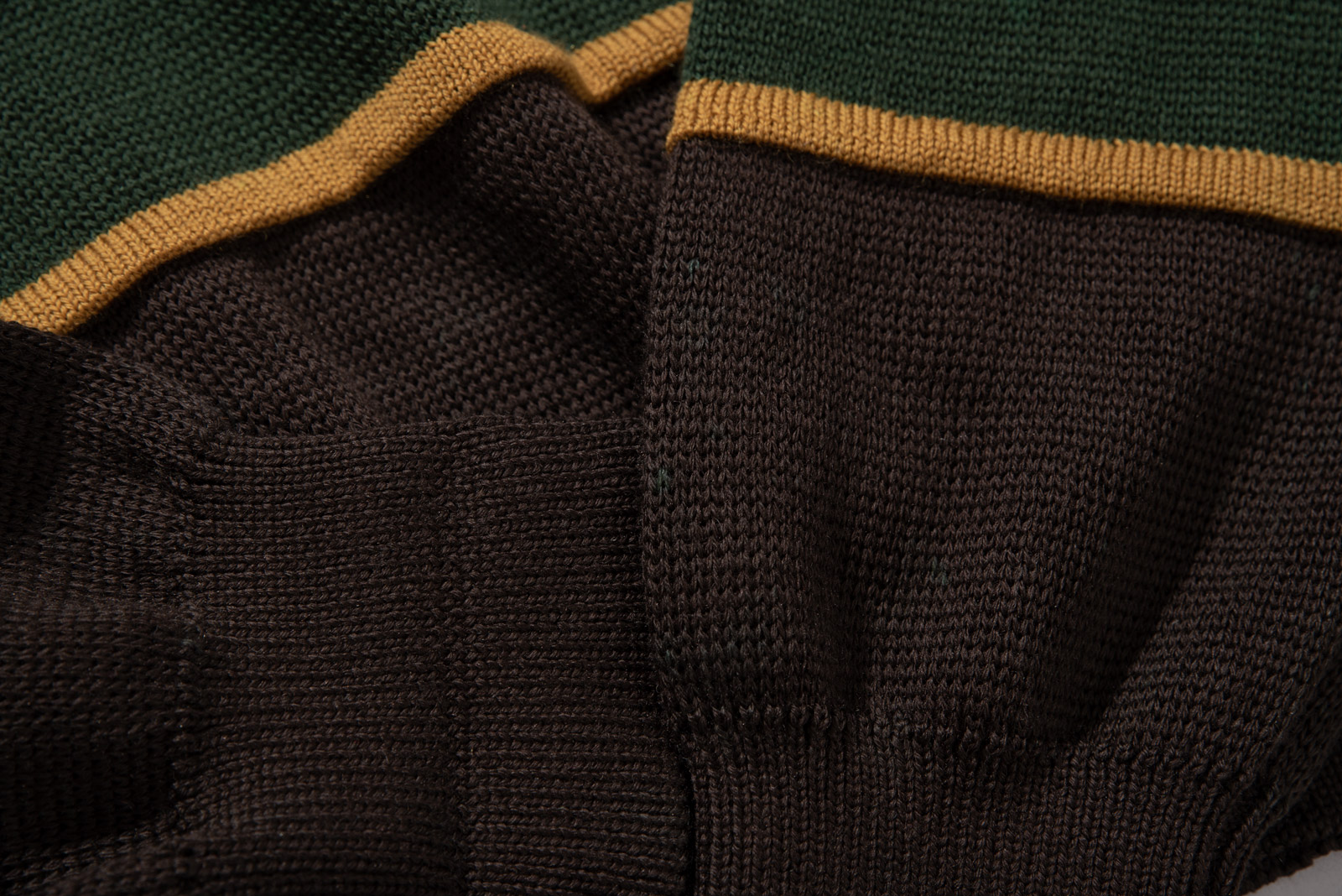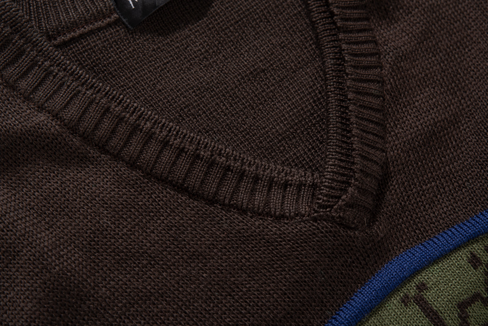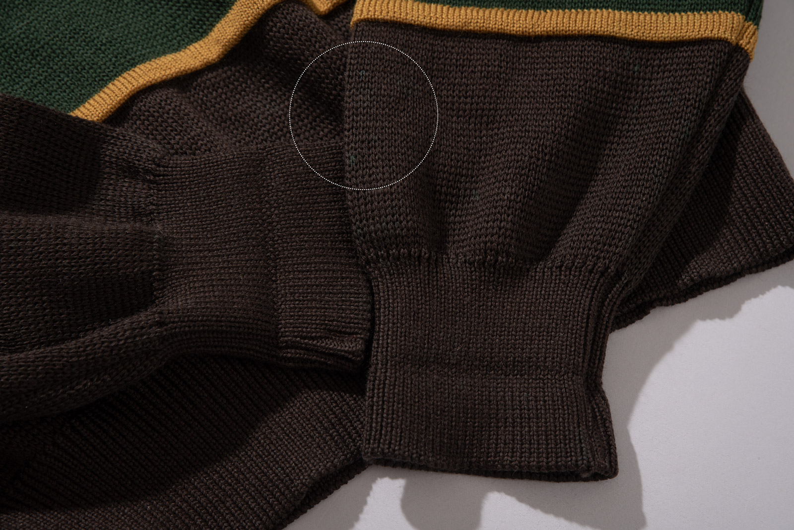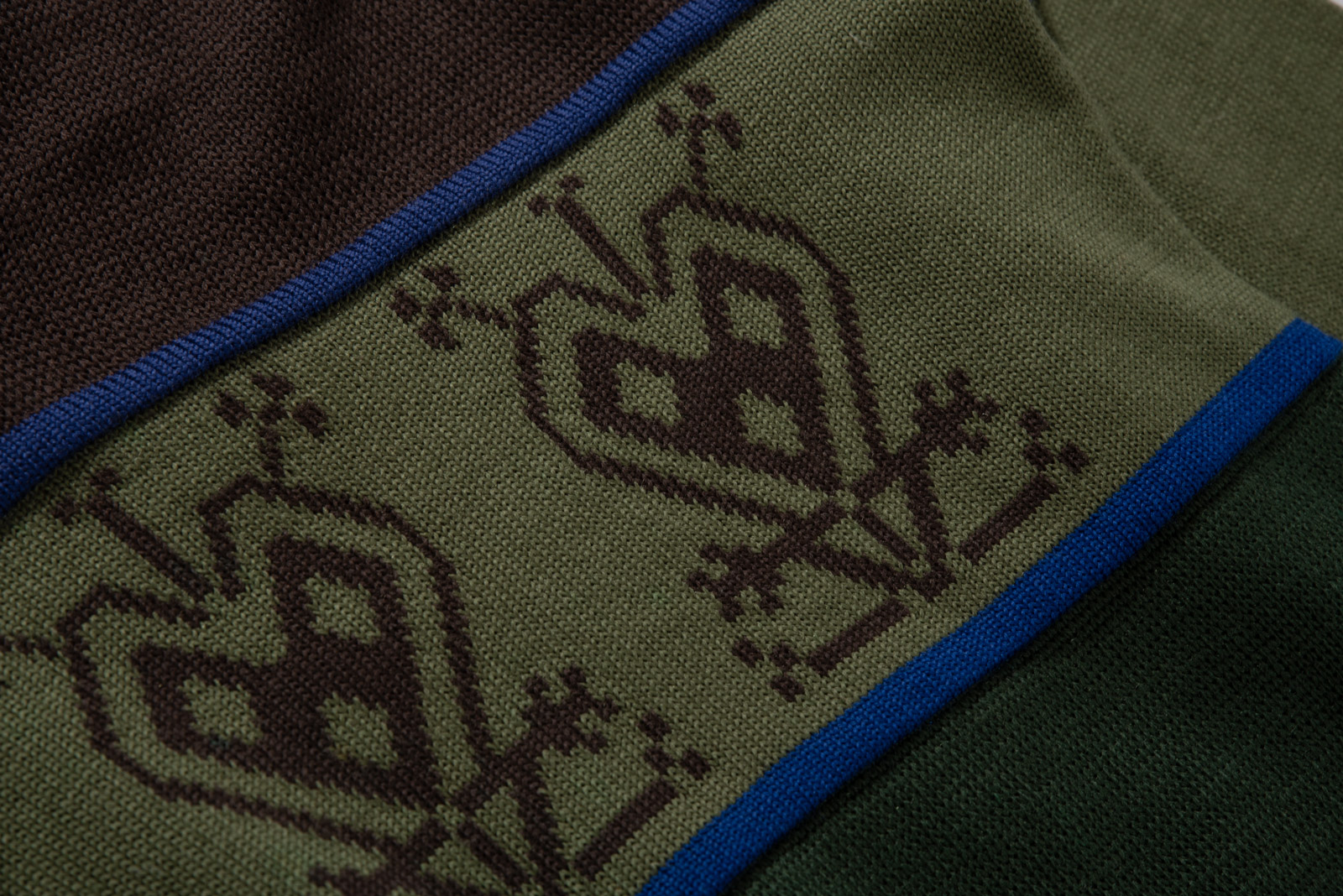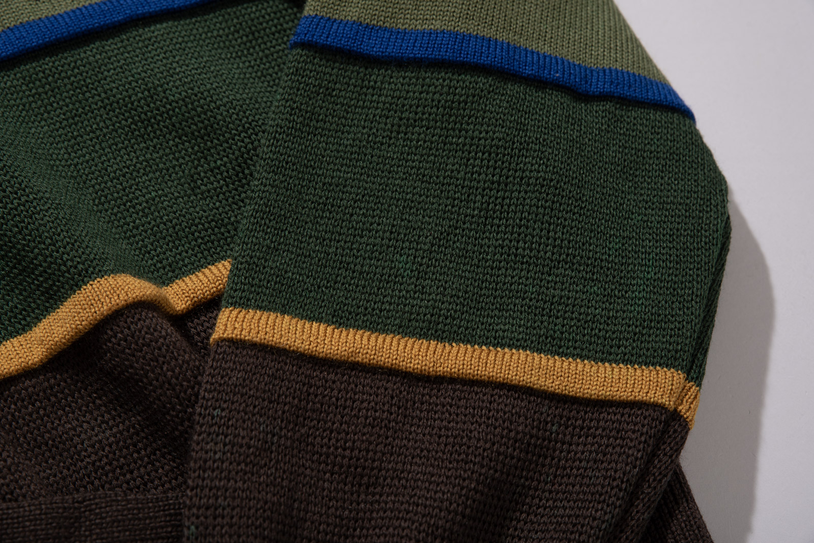 소개해 드리는 니트는 브라운 컬러를 베이스로 올리브 그린, 카키 그린, 머스타드 옐로우가 레이어드 된 블록 패턴이 특징이에요.