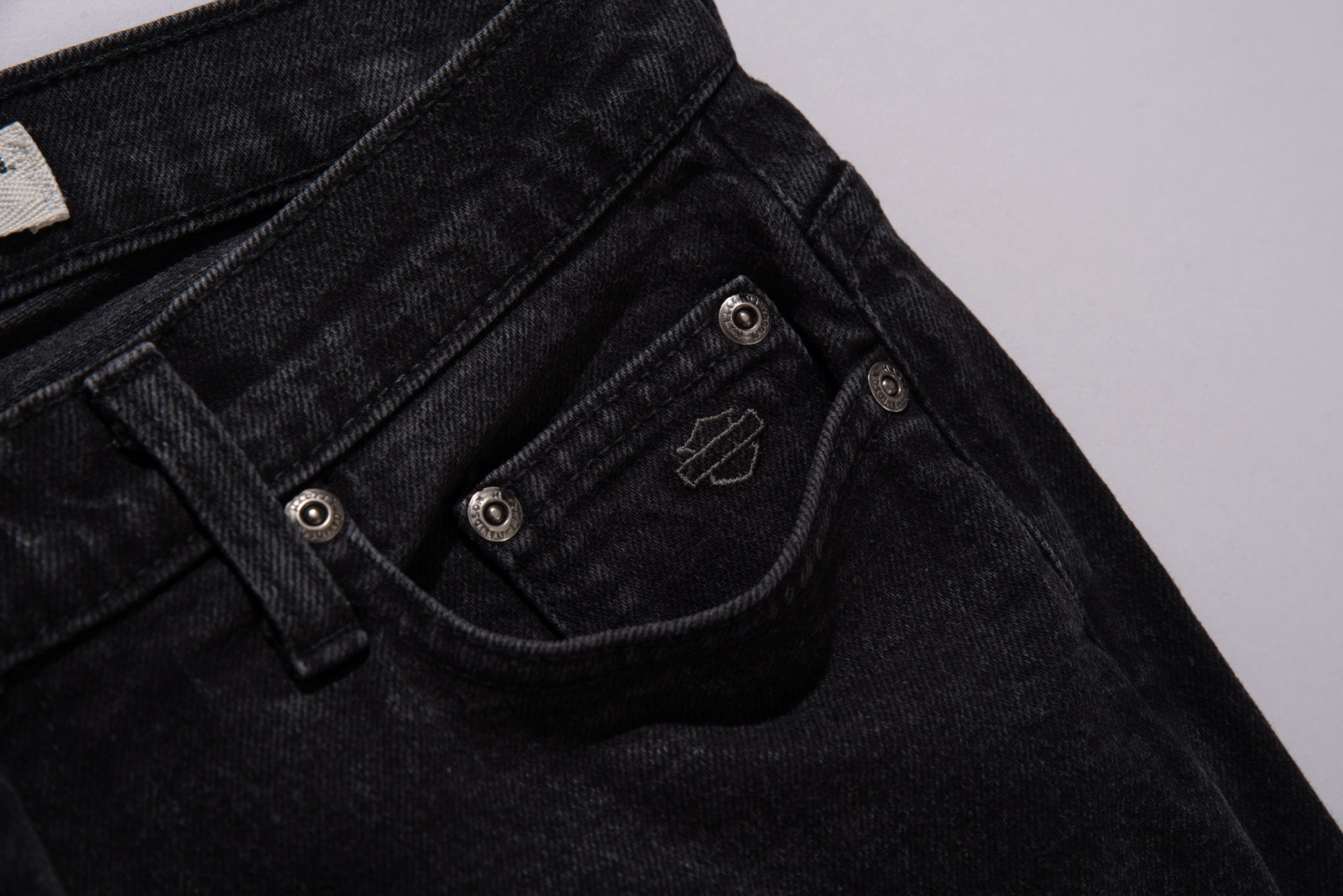 클래식 스트레이트 레그 실루엣으로 발끝까지 자연스럽게 떨어지는 라인, 코인 포켓의 할리데이비슨을 상징하는 로고, 버튼과 리벳 등 금속 부자재에도 정체성이 세밀하게 반영되어 있으며 후면 패치 역시 블랙 가죽에 양각 로고로 마무리되어 전체 밸런스가 아주 좋네요.
