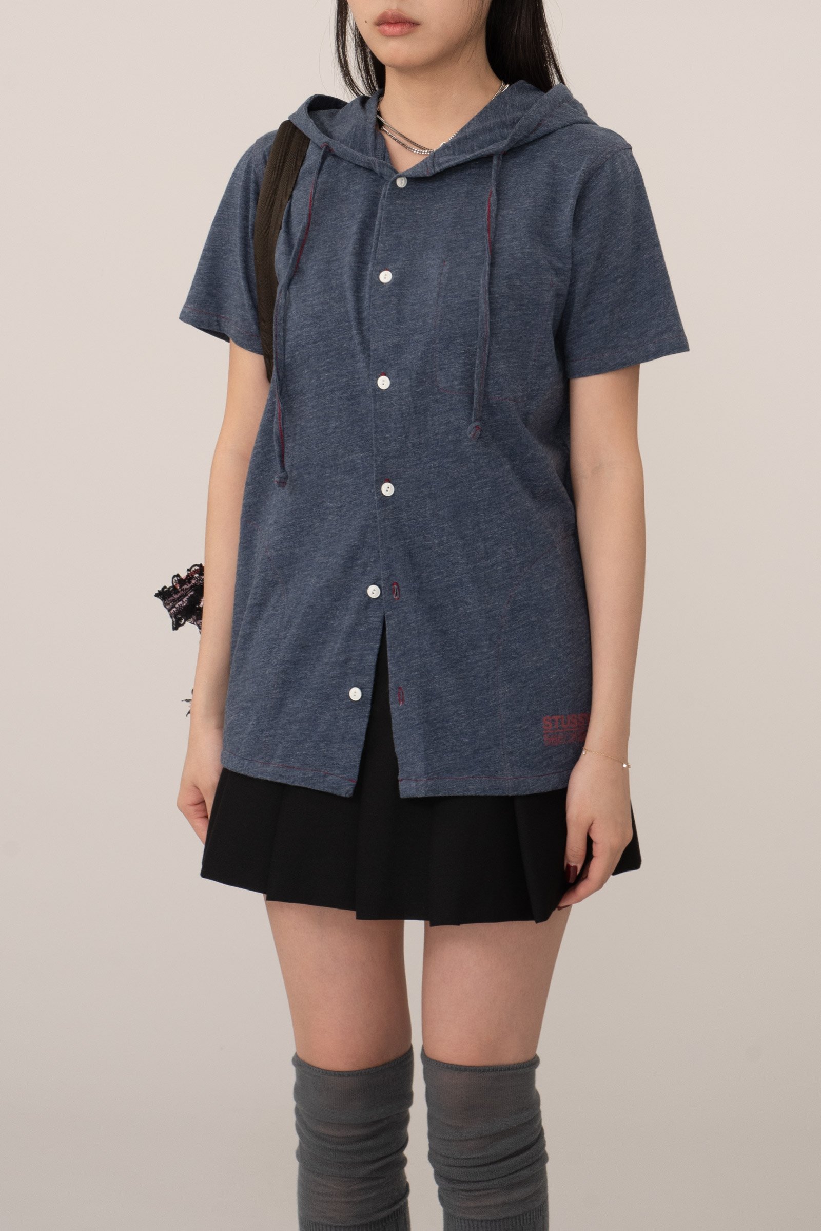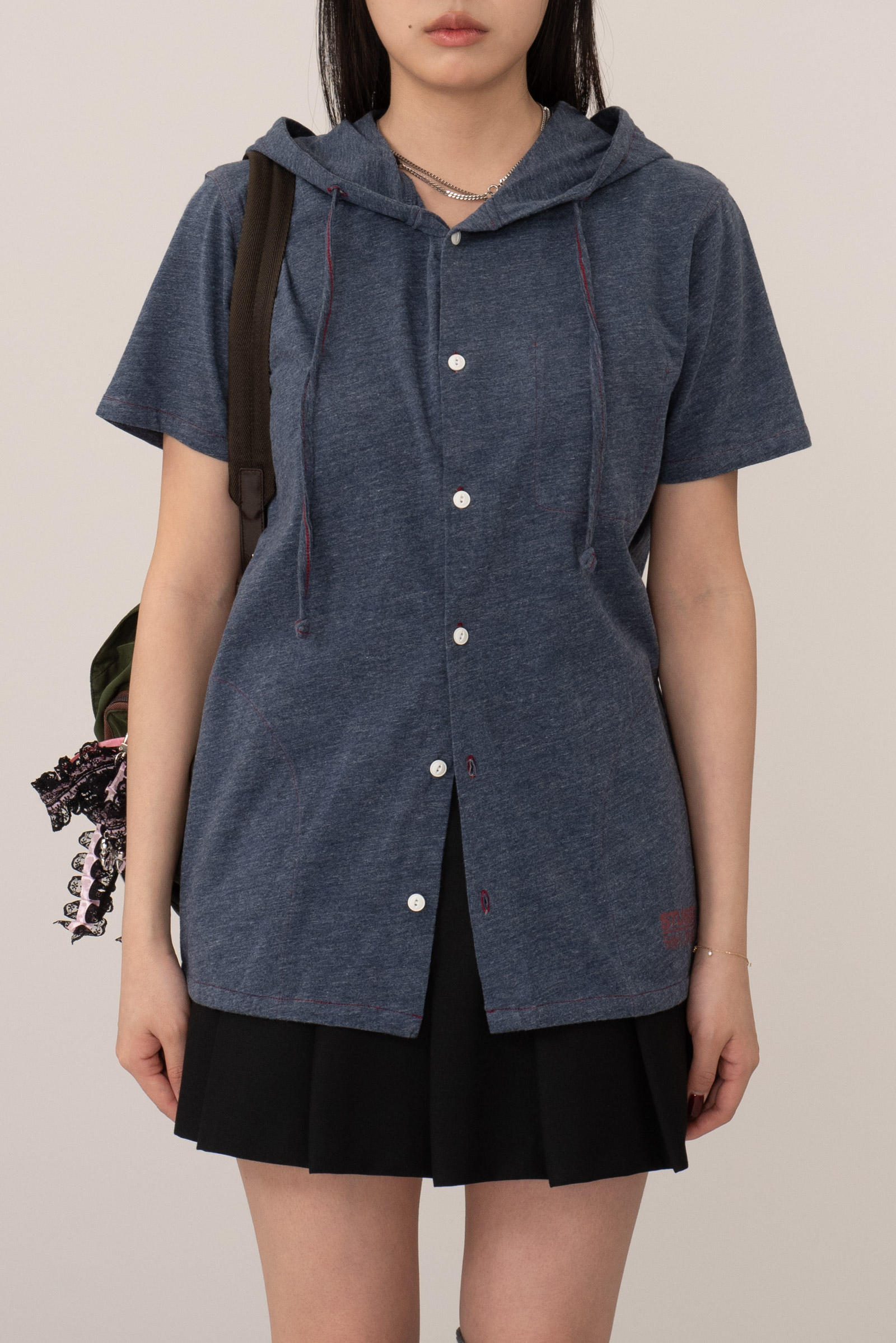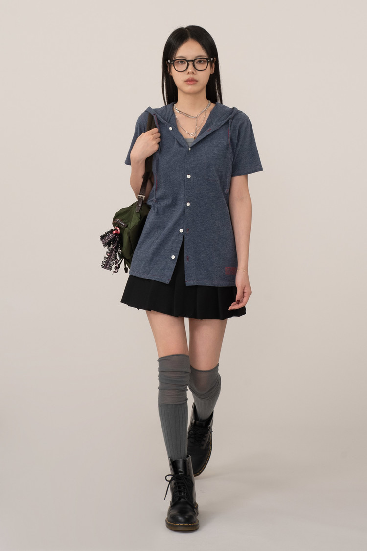 가벼운 헤더 저지 원단을 사용해 티셔츠처럼 편안하면서도 프론트 버튼과 후드 스트링 디테일로 셔츠 특유의 구조감을 더한 아이템인데요.