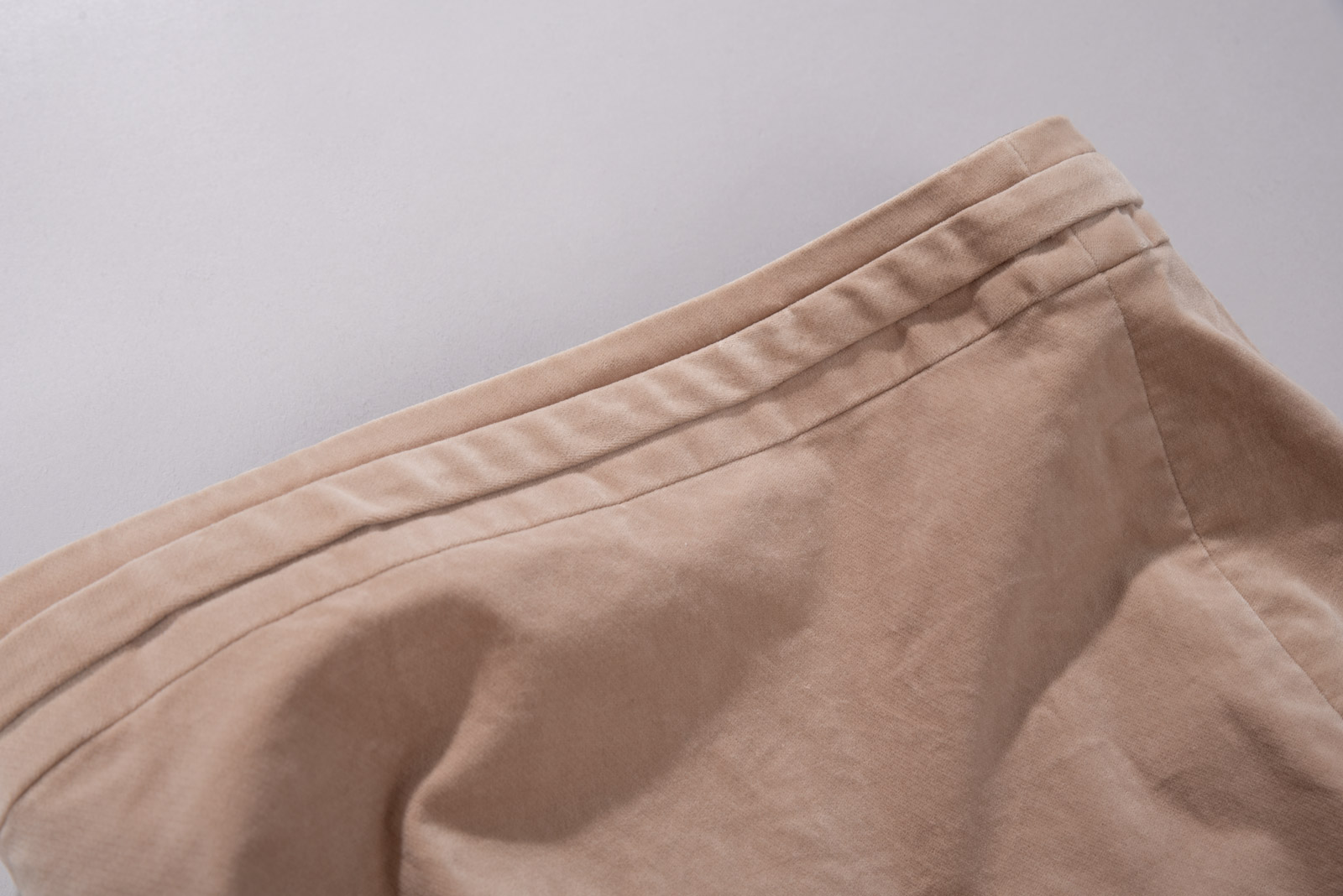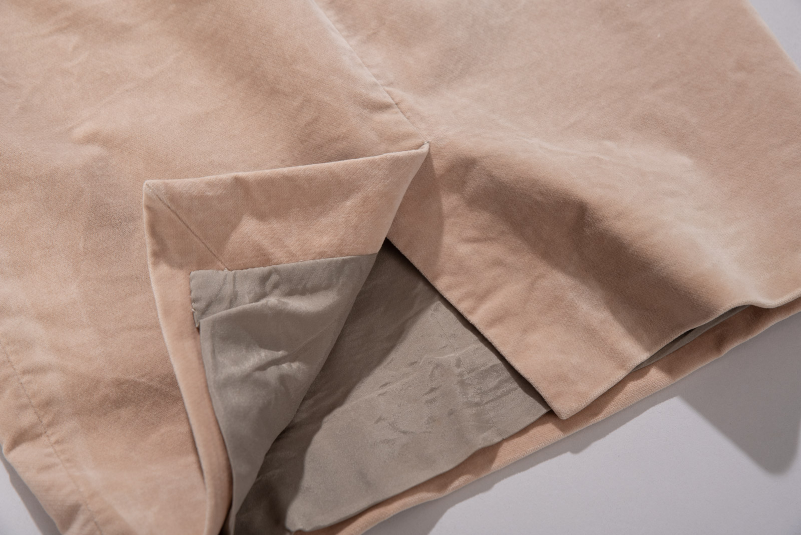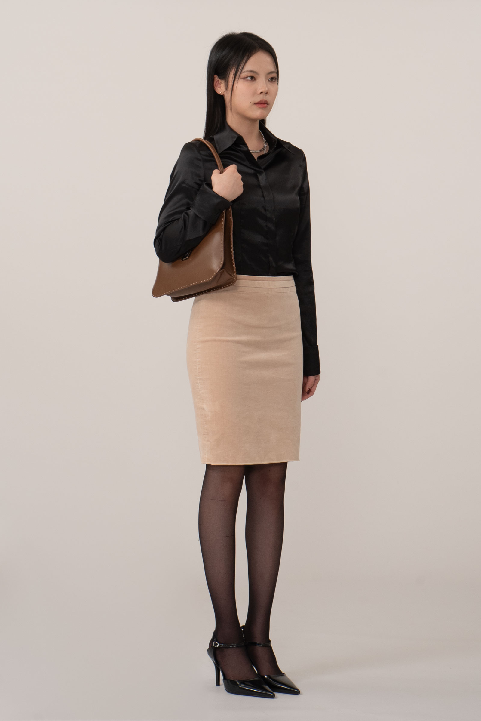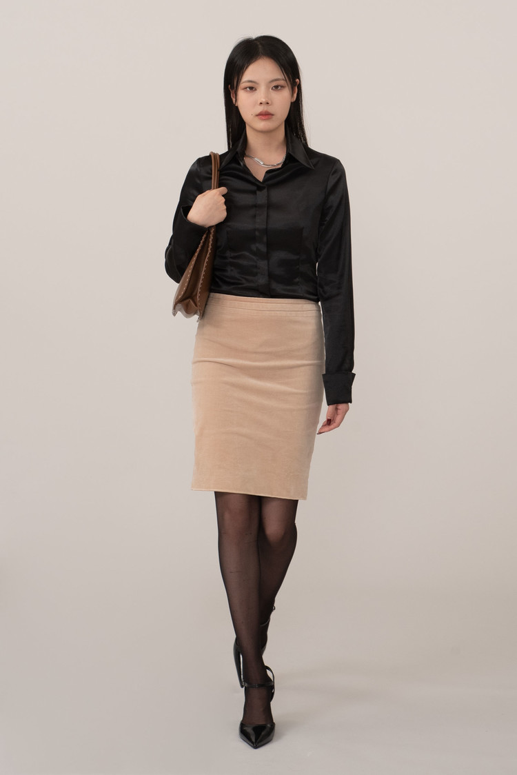 코튼에 5% 엘라스틴이 섞인 소재, 벨벳 가공되어 부드러운 결감, 빛에 따라 그 결감이 달라져 깊이를 느끼실 수 있고 불필요한 디테일 없이 곧게 떨어지는 펜슬 실루엣이 몸의 균형을 정제된 방식으로 보여주고 있어요.