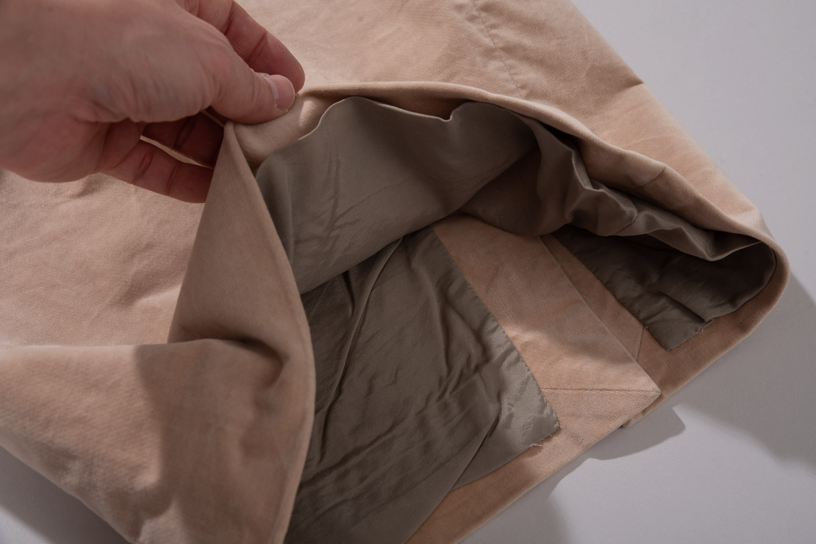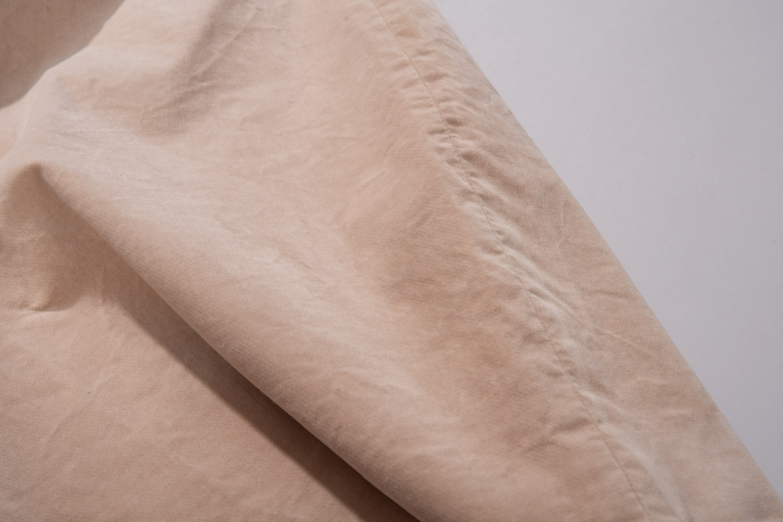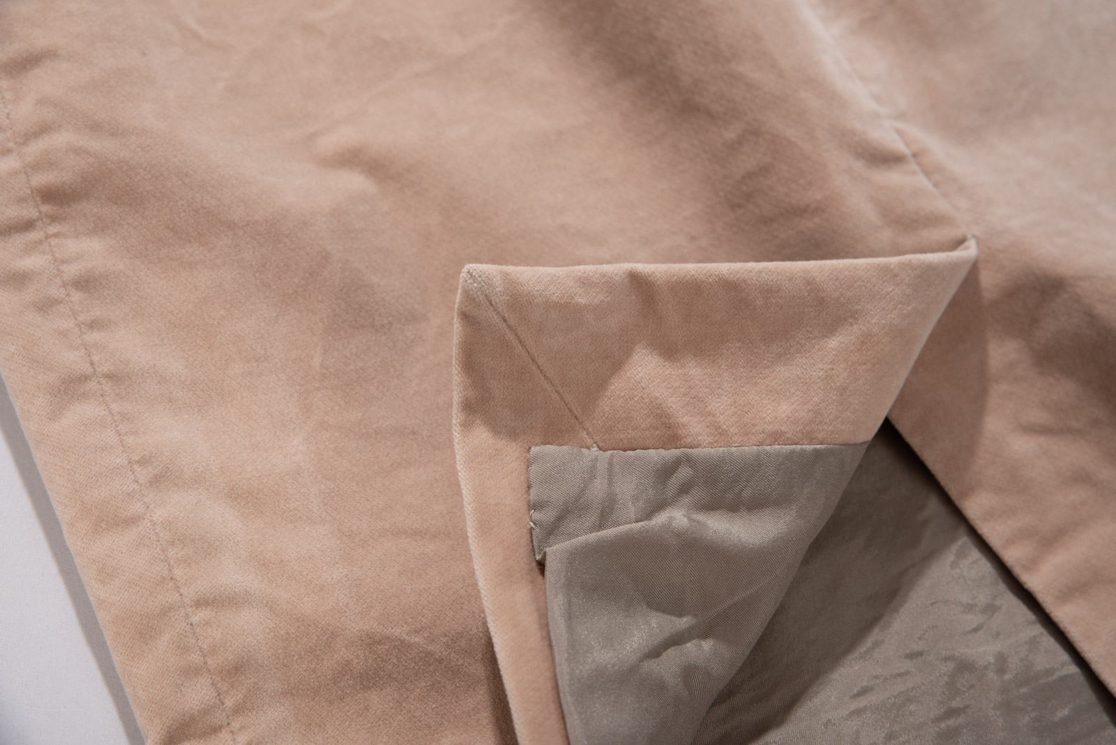 코튼에 5% 엘라스틴이 섞인 소재, 벨벳 가공되어 부드러운 결감, 빛에 따라 그 결감이 달라져 깊이를 느끼실 수 있고 불필요한 디테일 없이 곧게 떨어지는 펜슬 실루엣이 몸의 균형을 정제된 방식으로 보여주고 있어요.