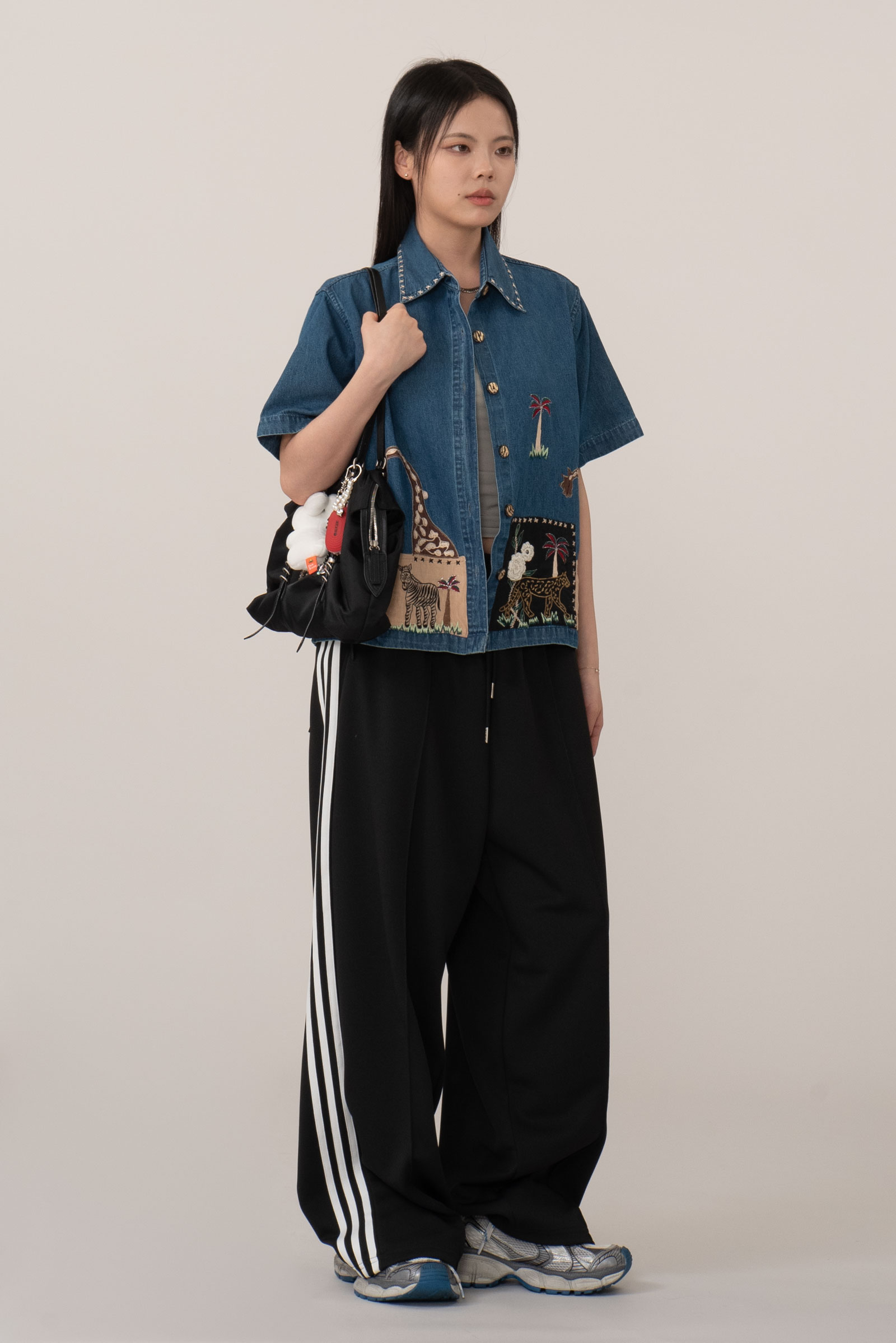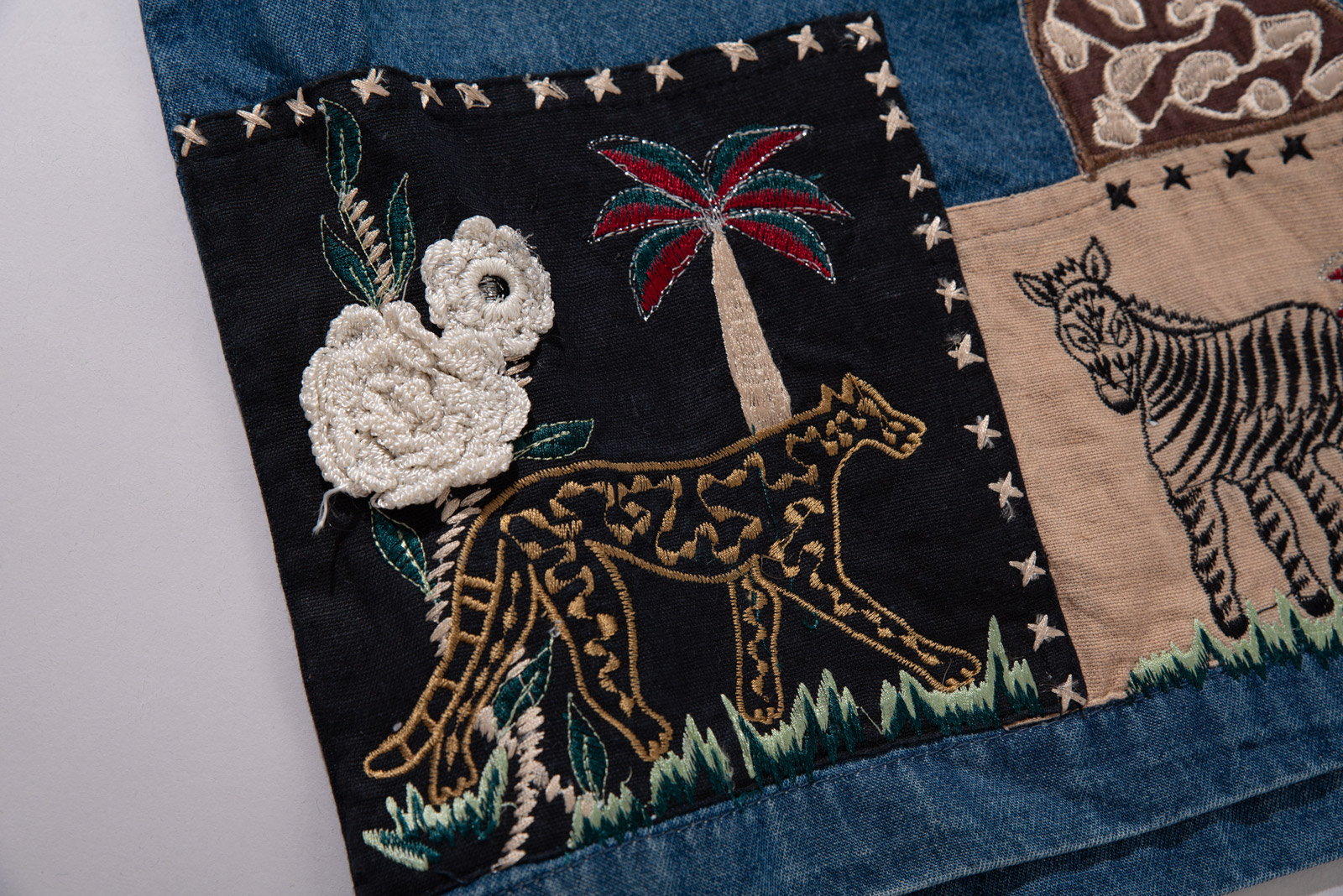 전면에는 패치와 자수가 혼합된 그래픽 구성이 배치되어 있는데 핸드메이드 제품은 아니지만 자수의 밀도와 색감, 패치 가장자리 마감이 정교해 수작업에 가깝게 느껴질 정도예요.
